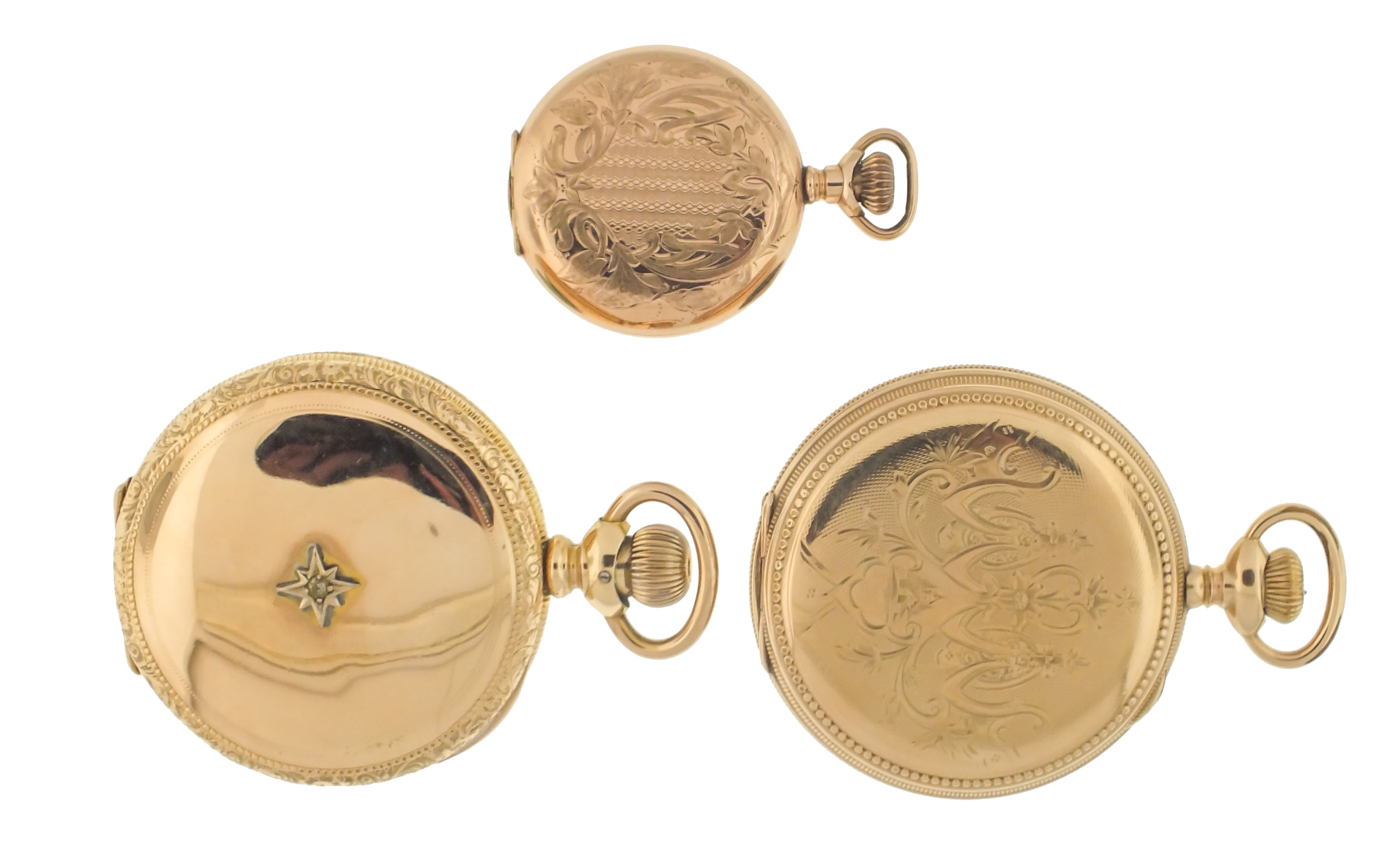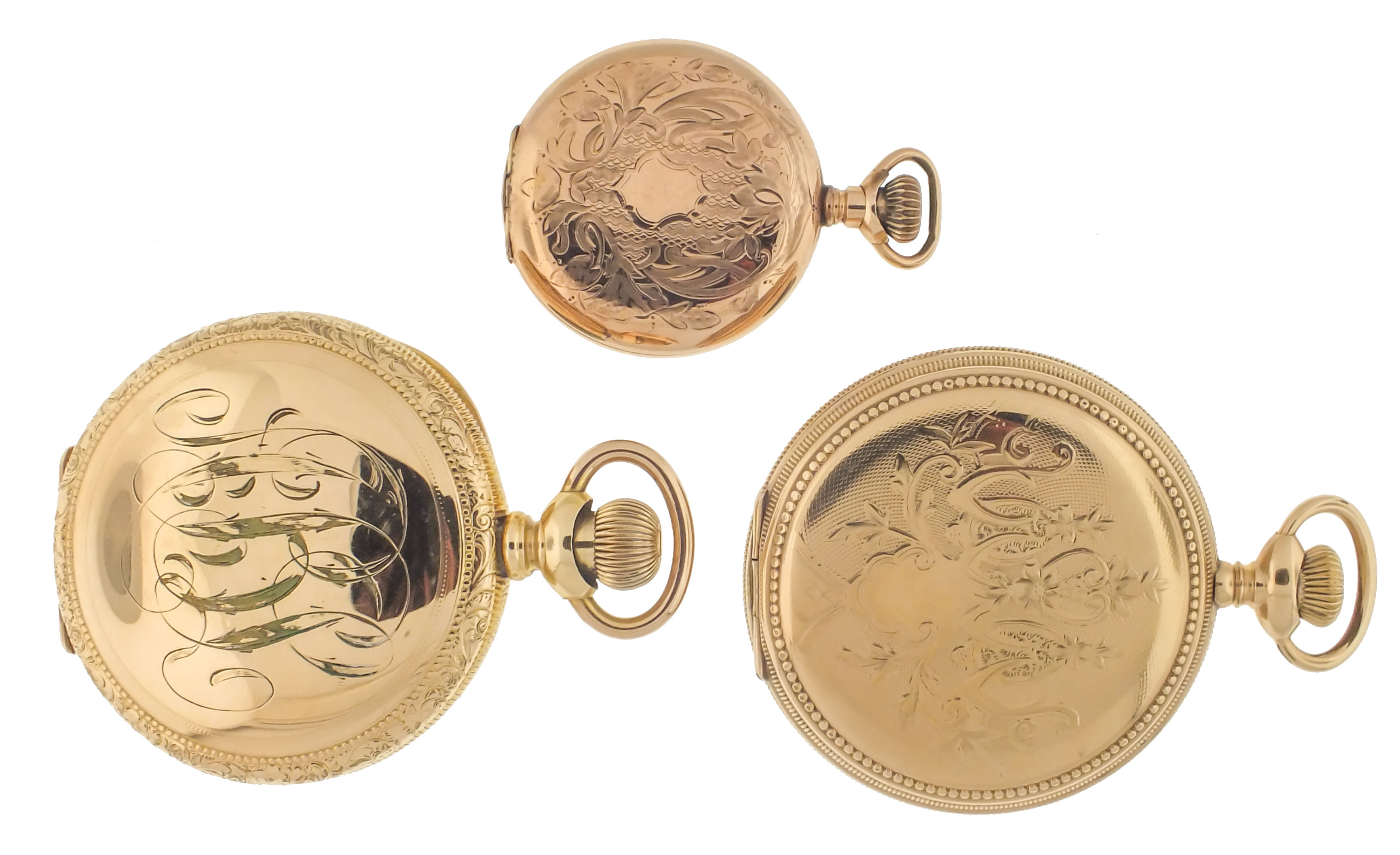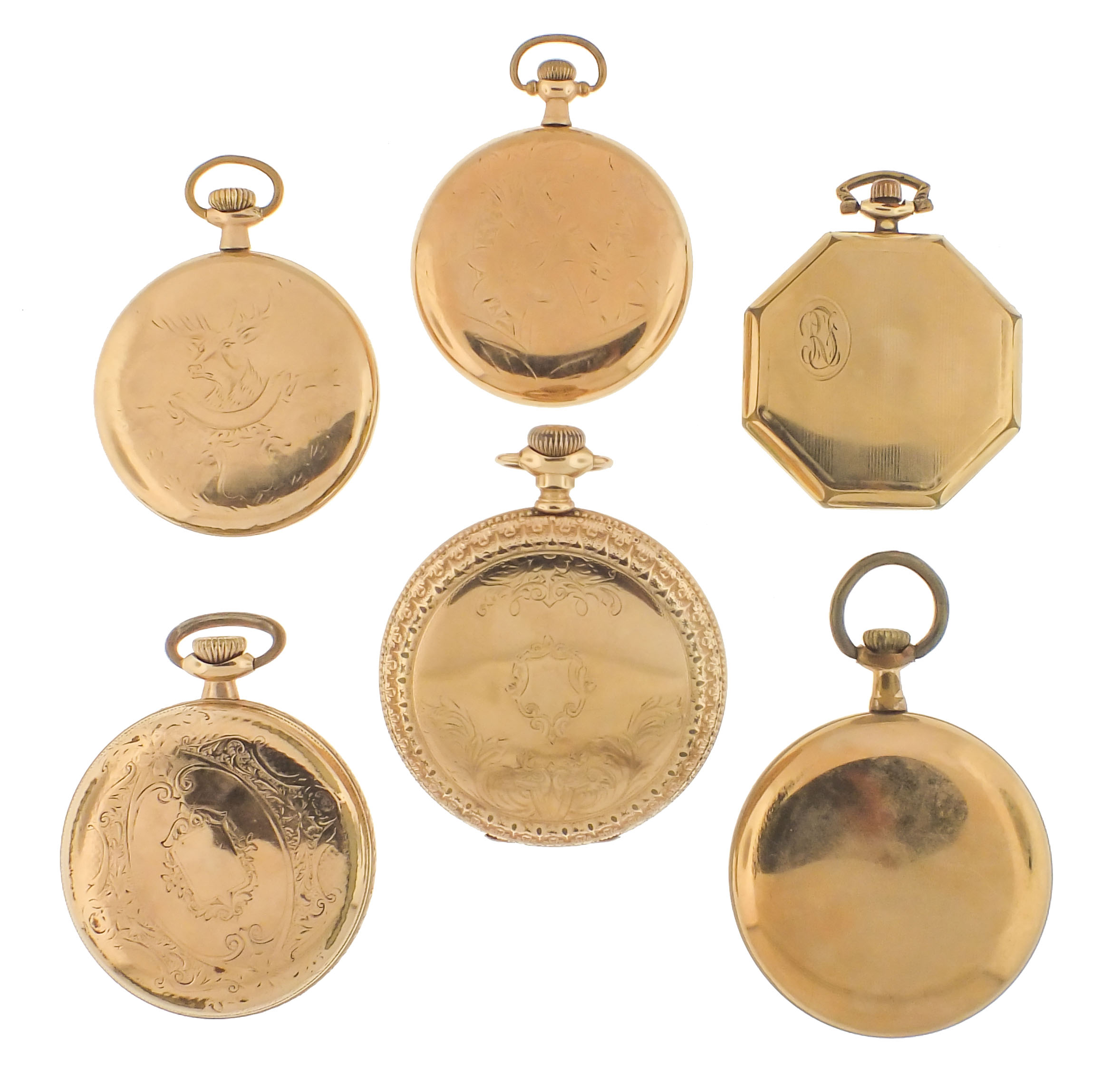 Pocket watches- 9 (Nine), six Illinois and three South Bend, 7- 19 jewel movements, white enamel and metal dials, gold filled hunting and open face cases