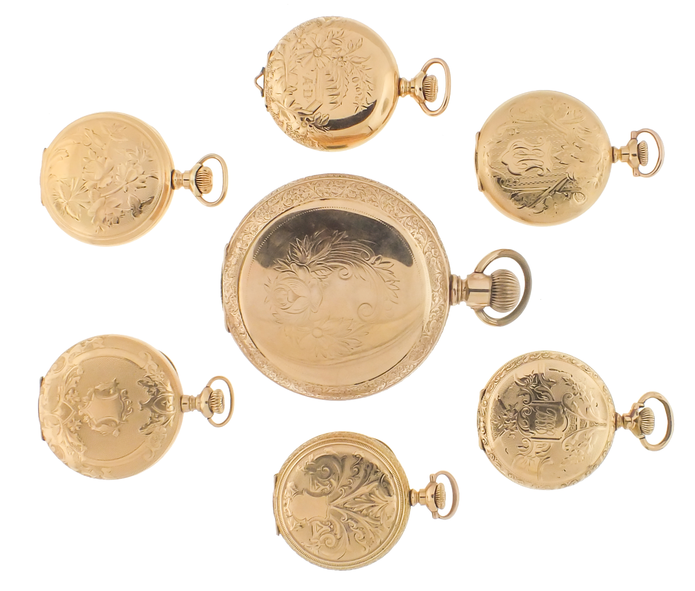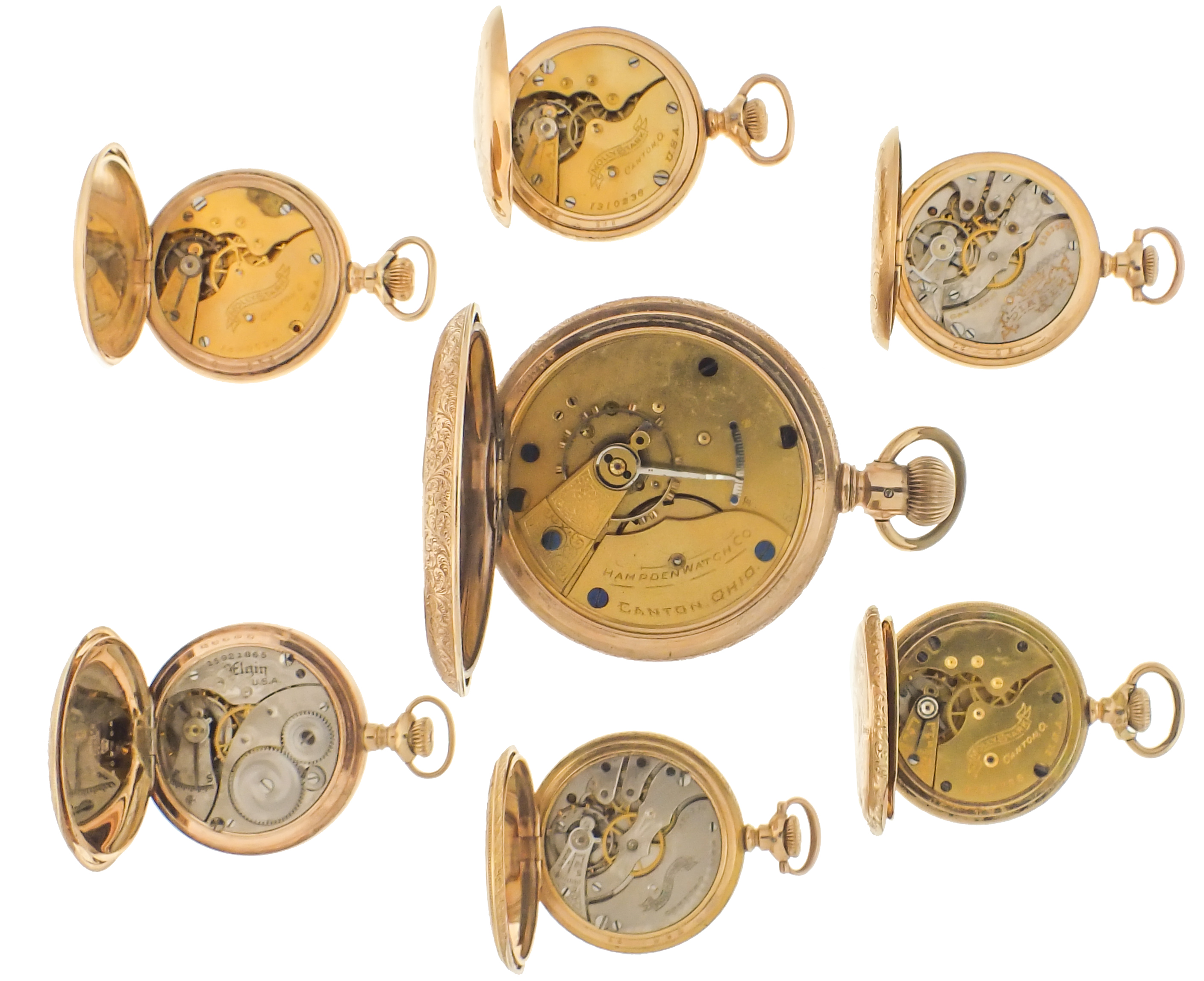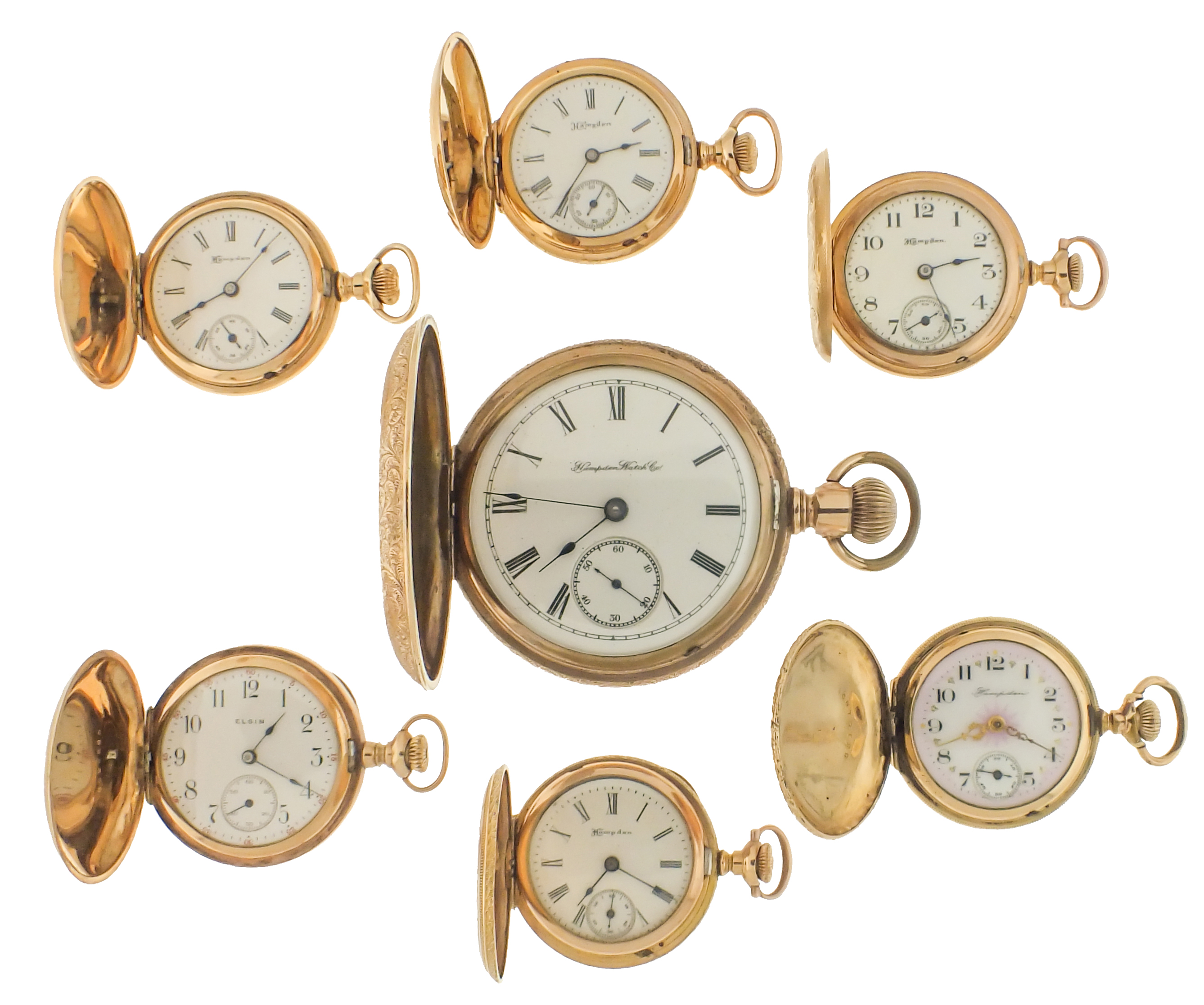 Pocket watches- 12 (Twelve), Hampden, Waltham, and Elgin, 18- 0 size, 7- 17 jewel movements, white enamel dials, and gold filled hunting cases