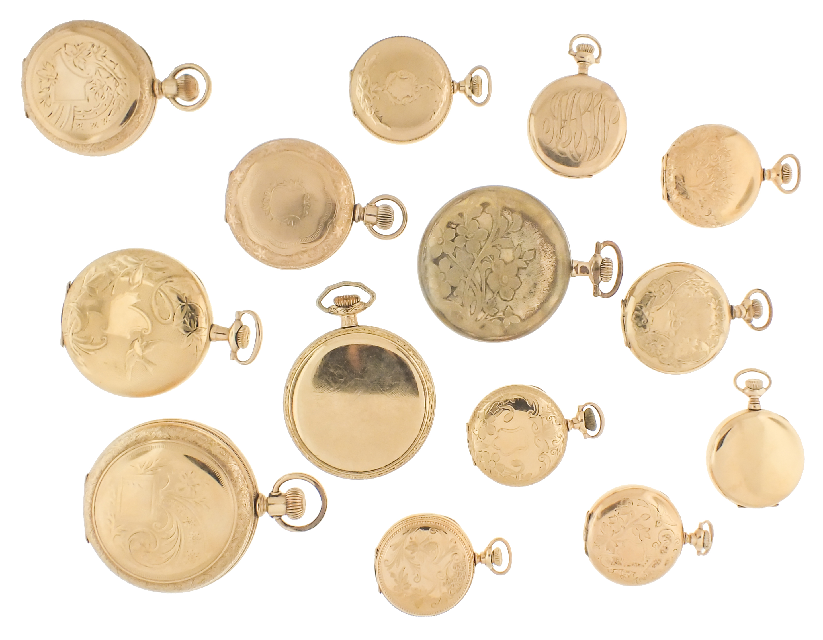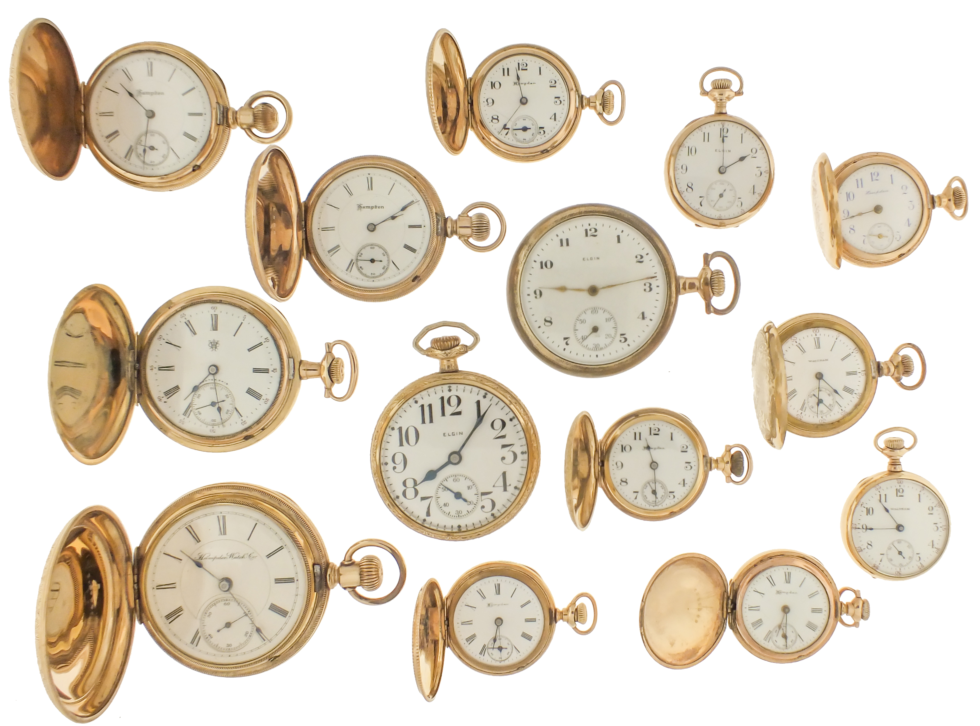 Pocket watches- 14 (Fourteen), Hampden, Waltham, and Elgin, 18- 3/0 size, 7- 15 jewel movements, white enamel dials, and gold filled hunting and open face cases