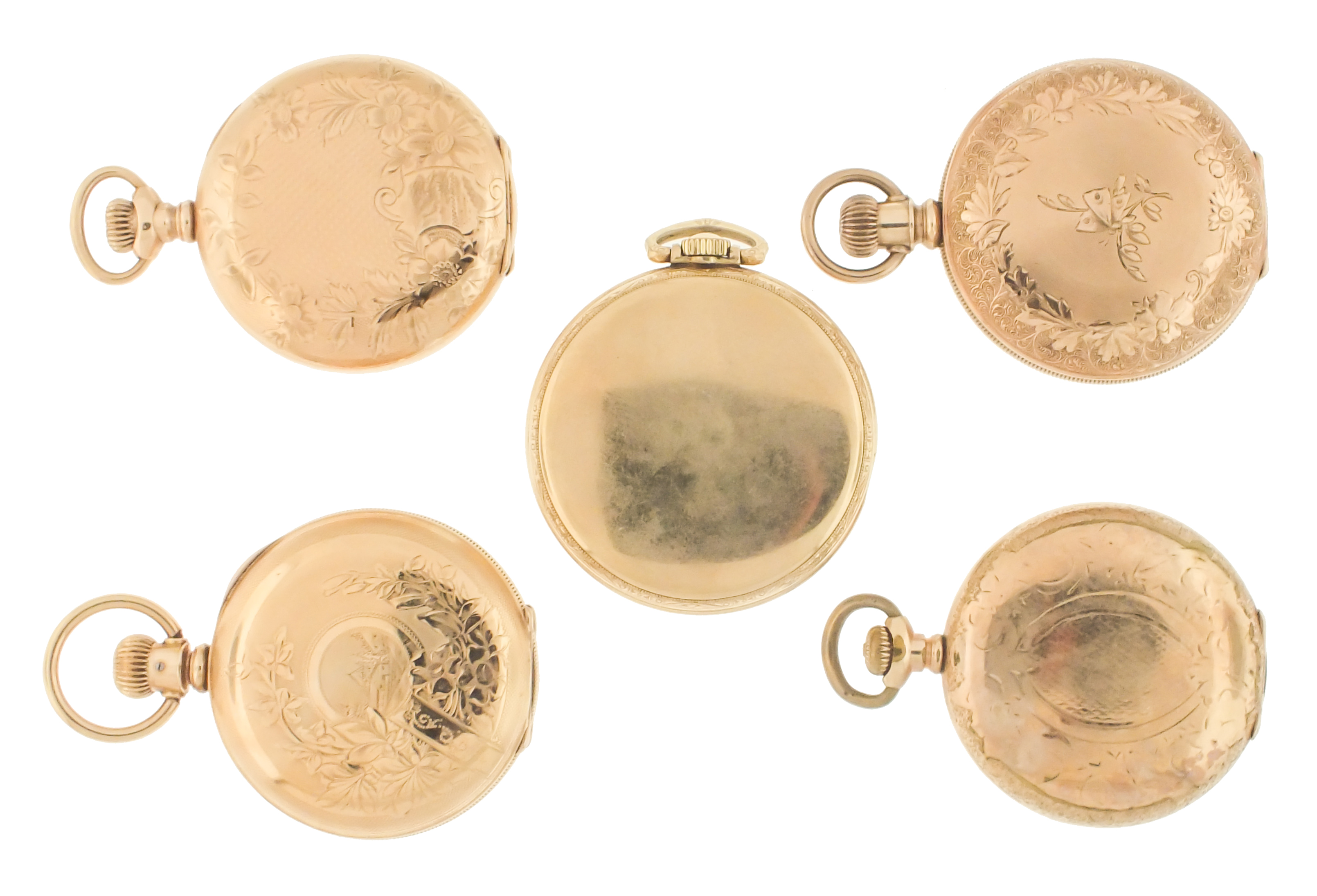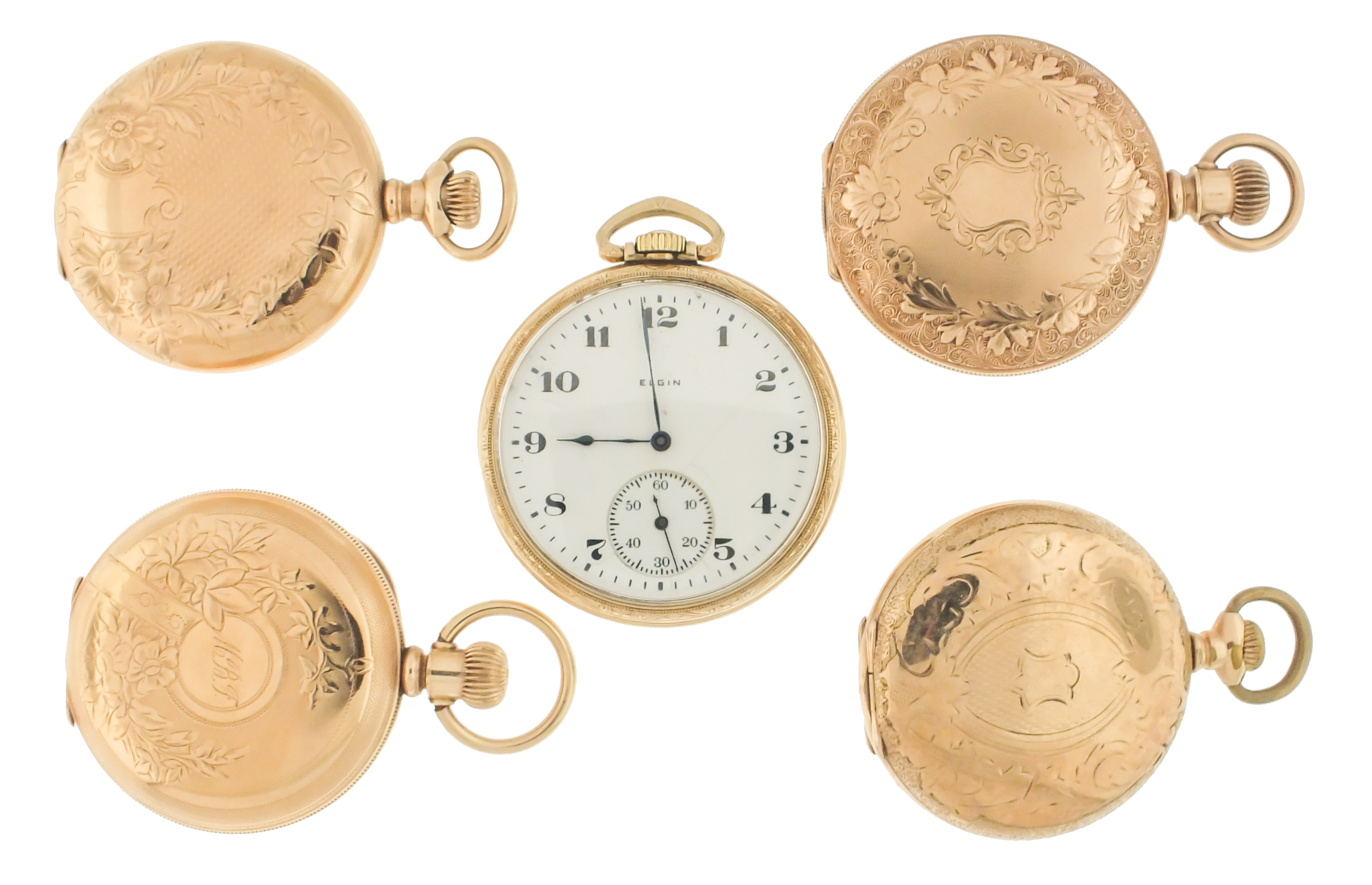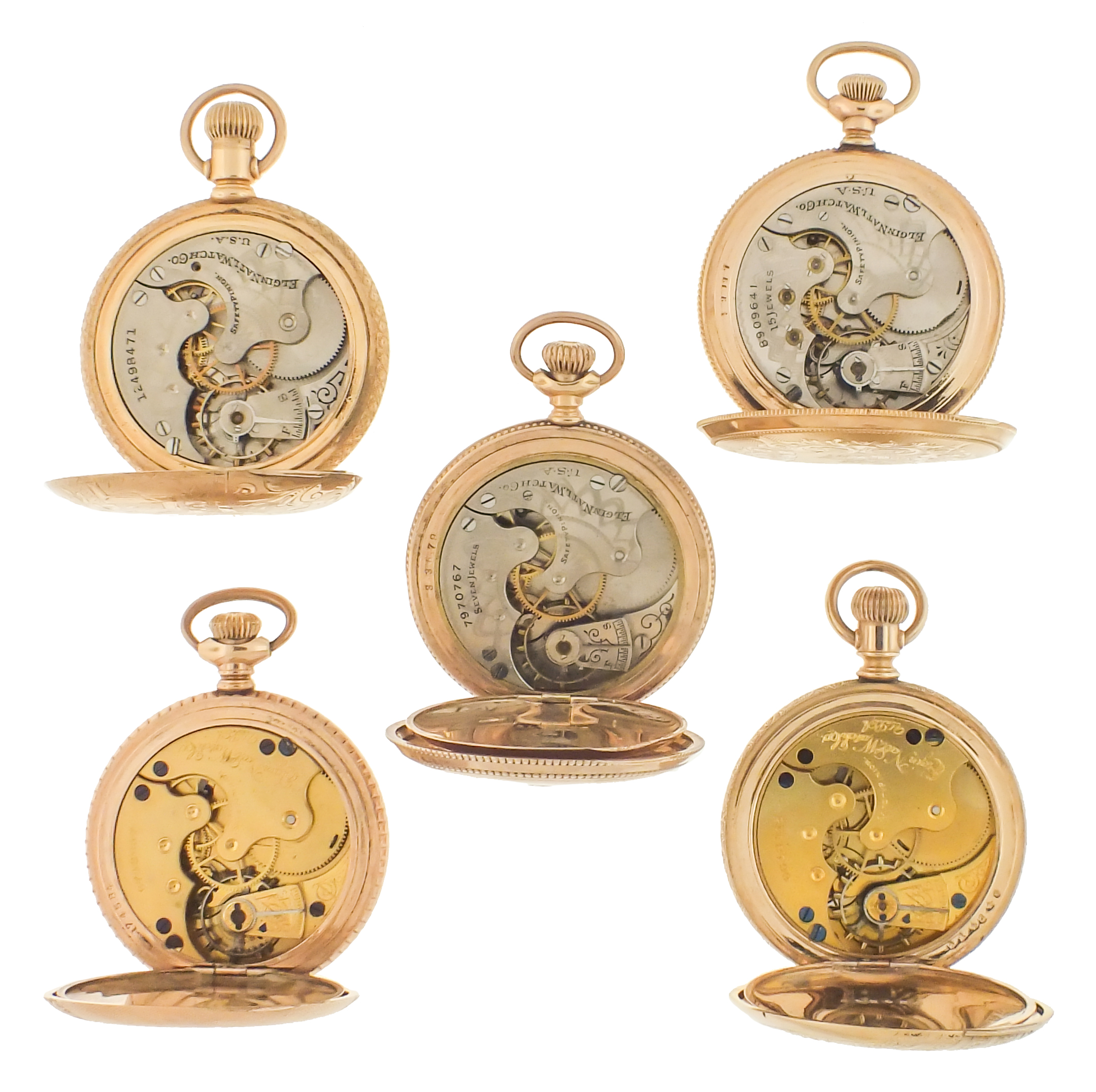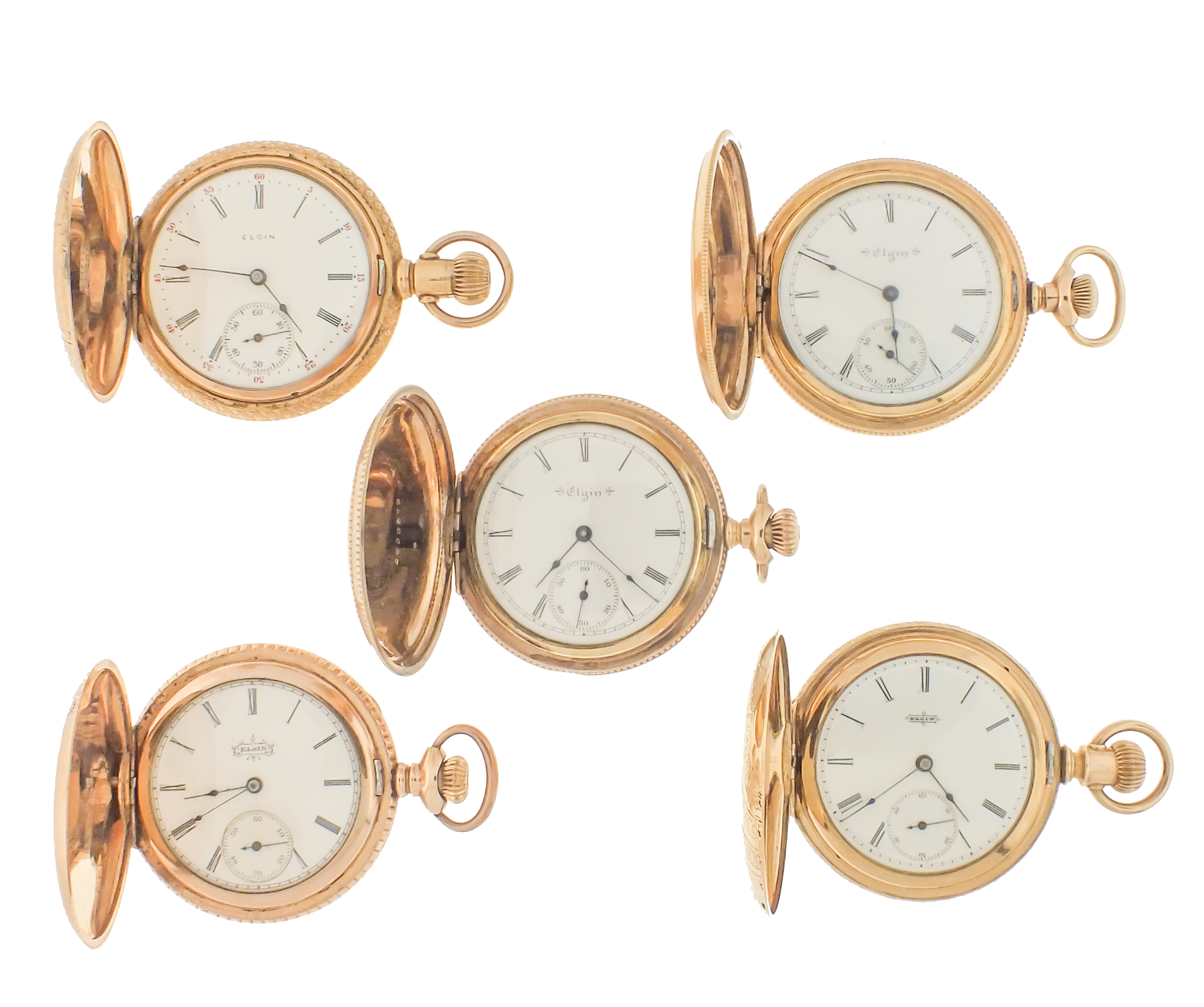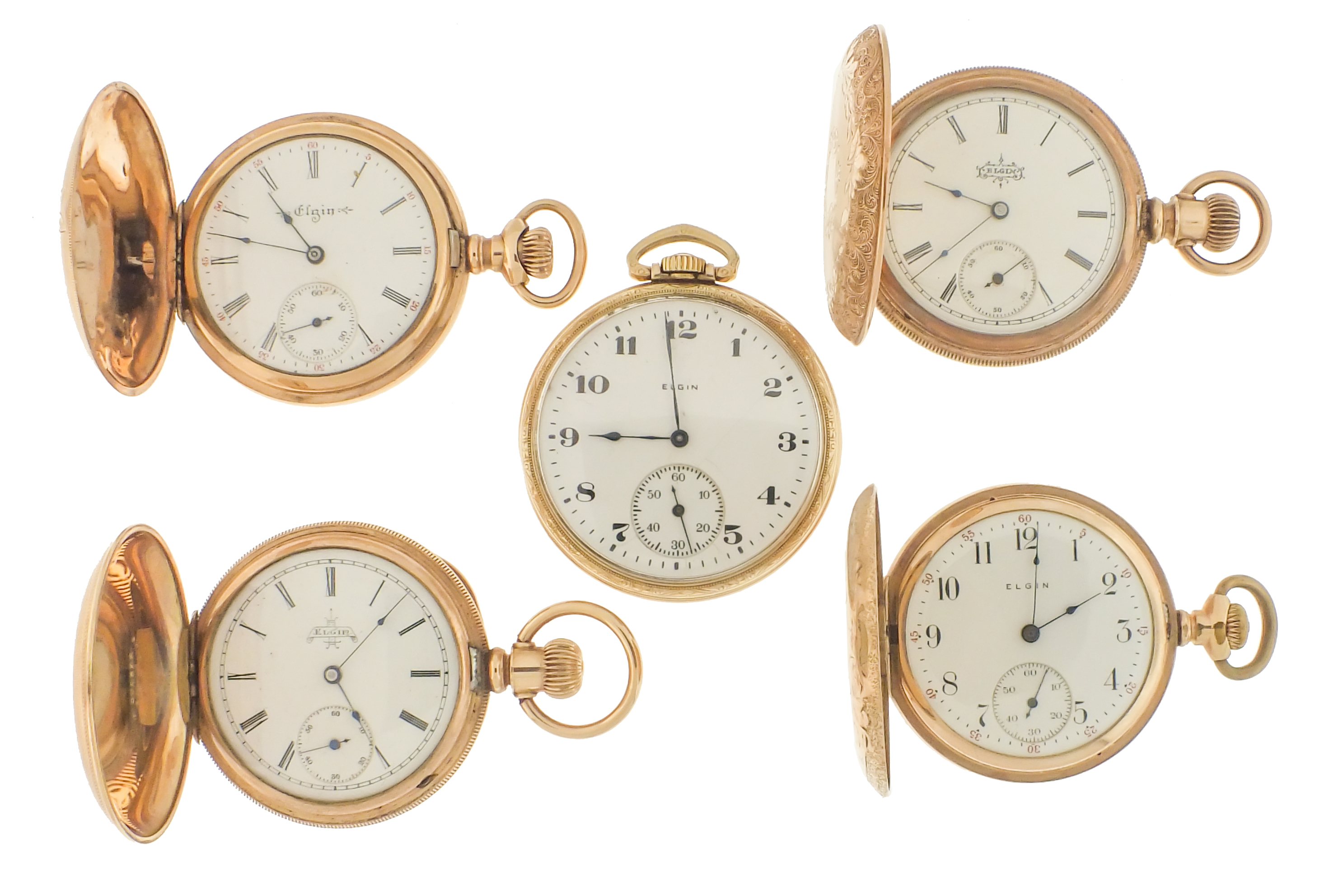 Pocket watches- 10 (Ten), all Elgin, 12- 6 size, all with 7 jewel movements, white enamel dials, and in gold filled hunting and open face cases