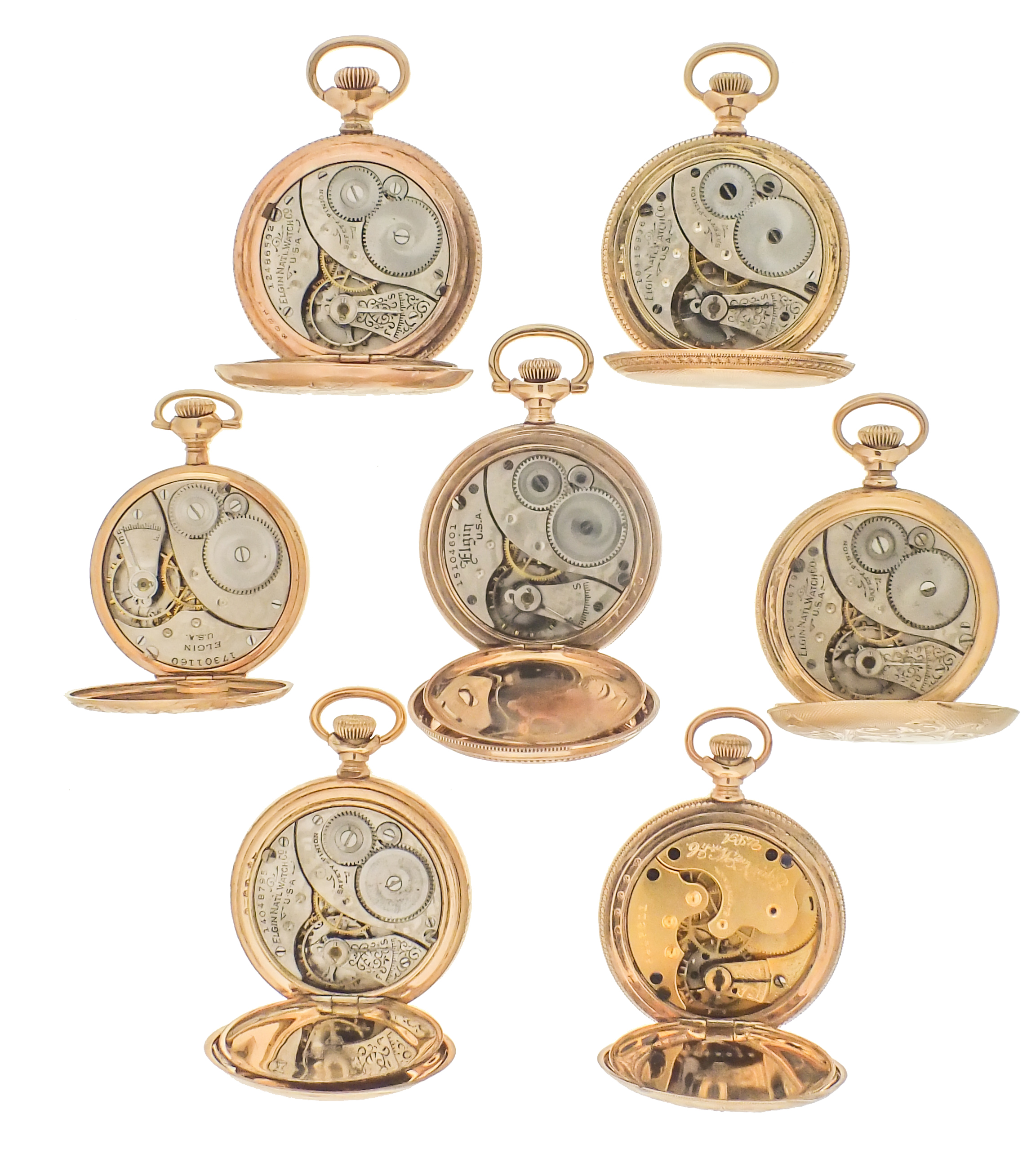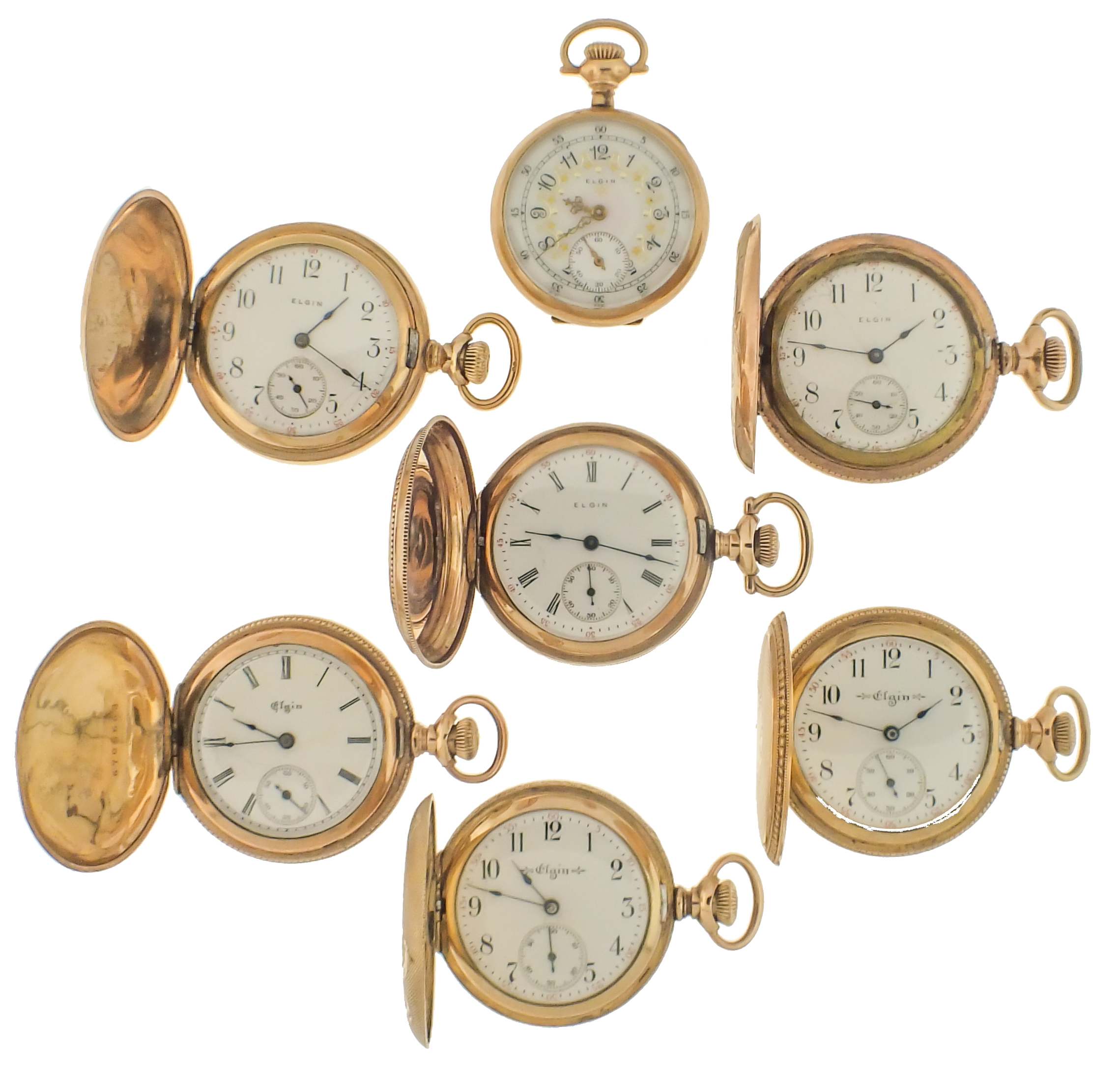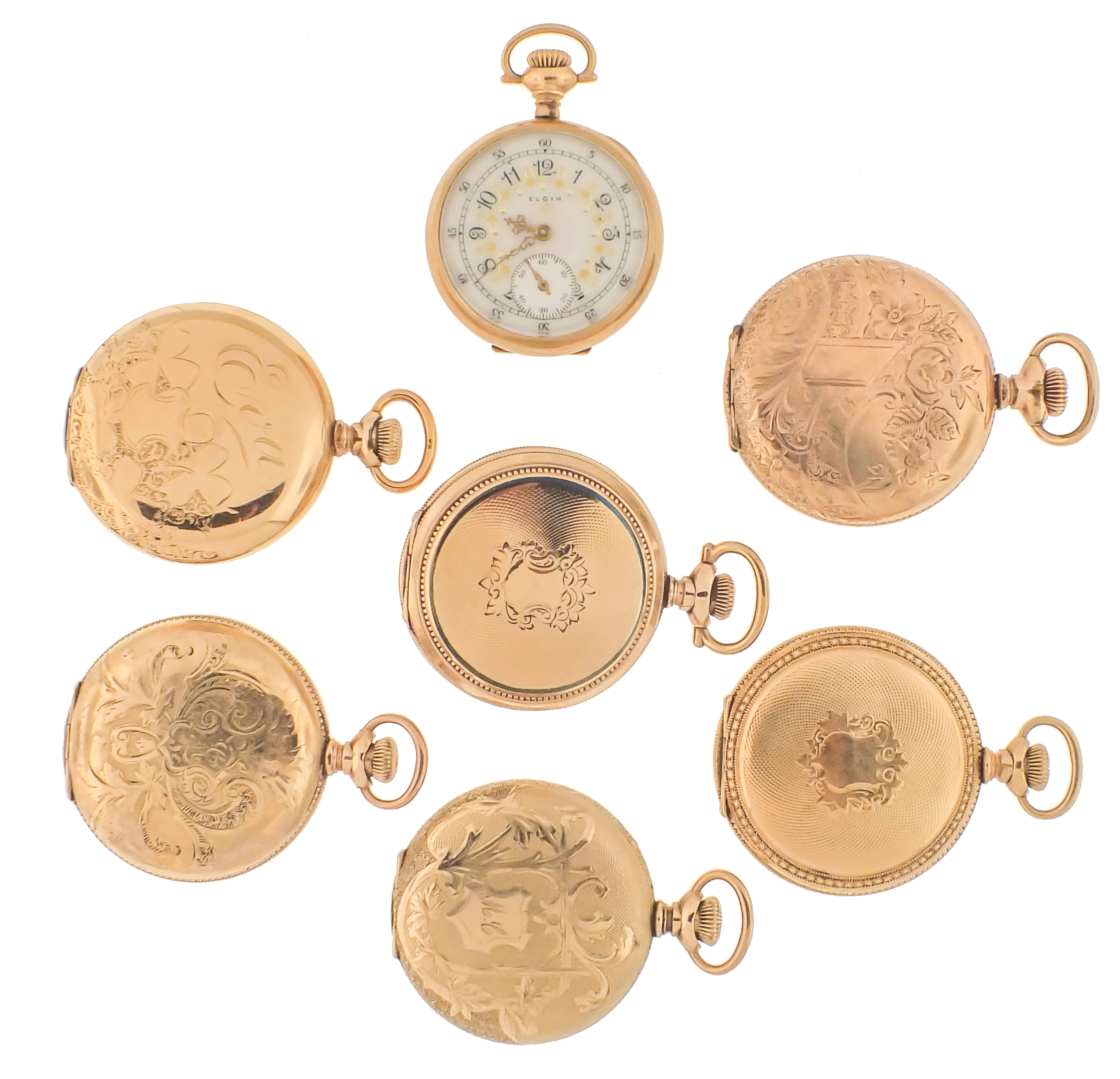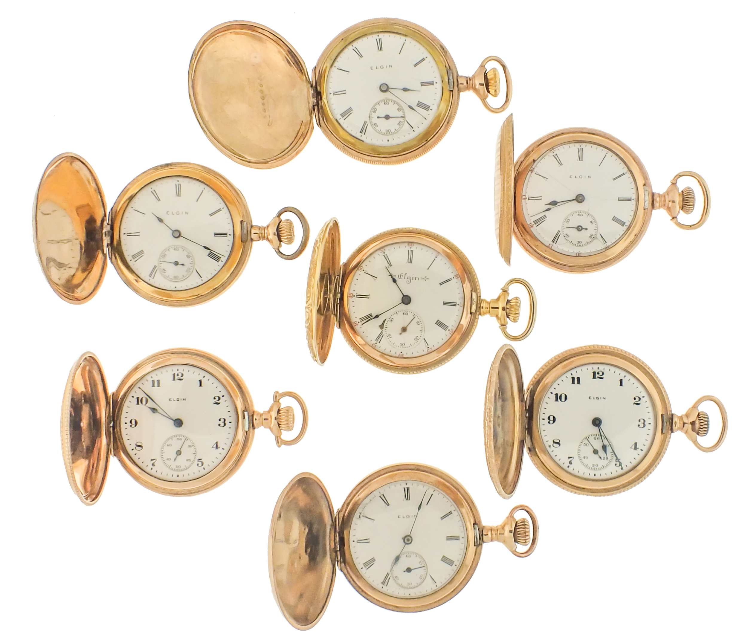 Pocket watches- 14 (Fourteen), all Elgin, 0- 3/0 size, all 7 jewel movements, white enamel dials, and gold filled hunting and open face cases