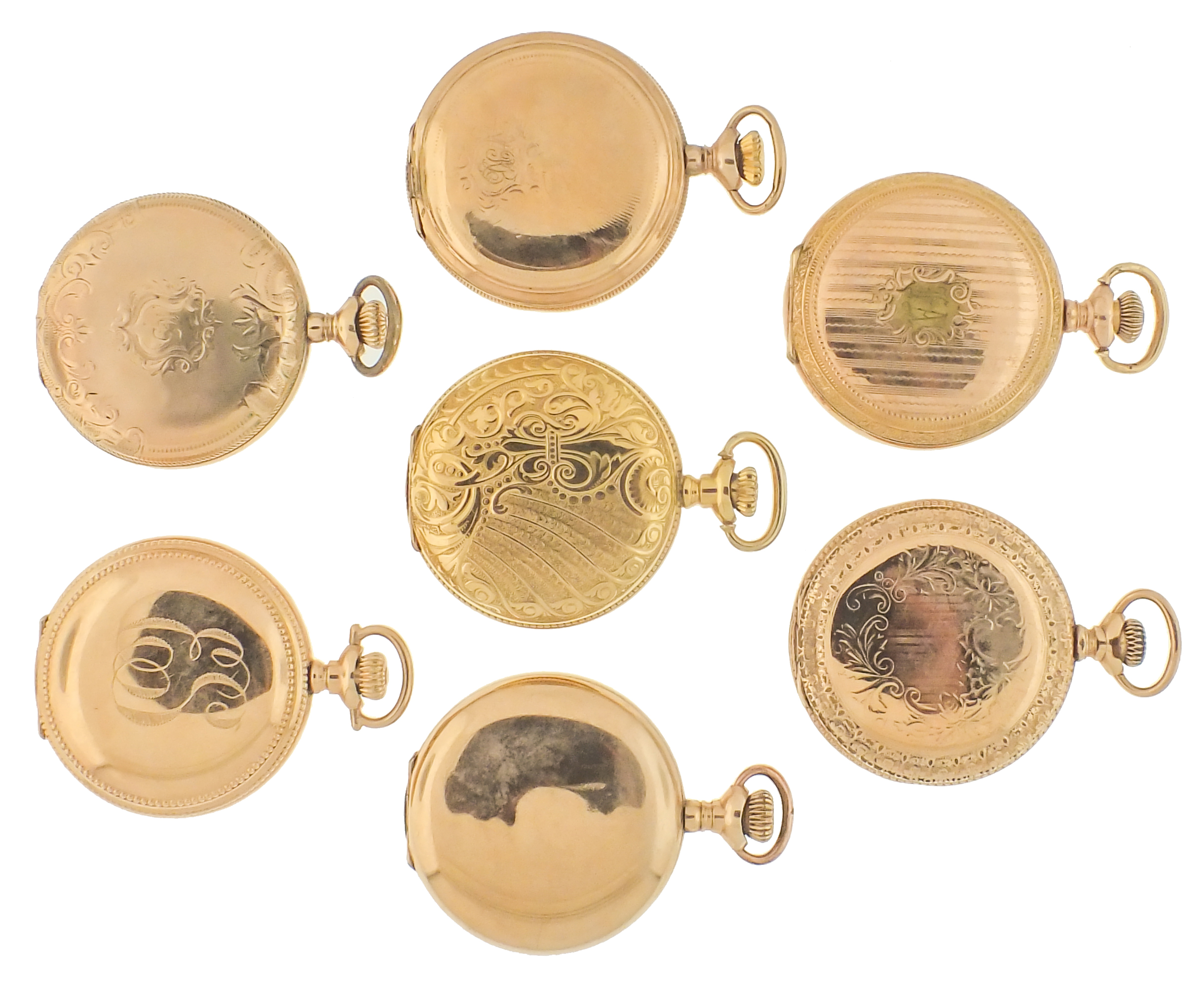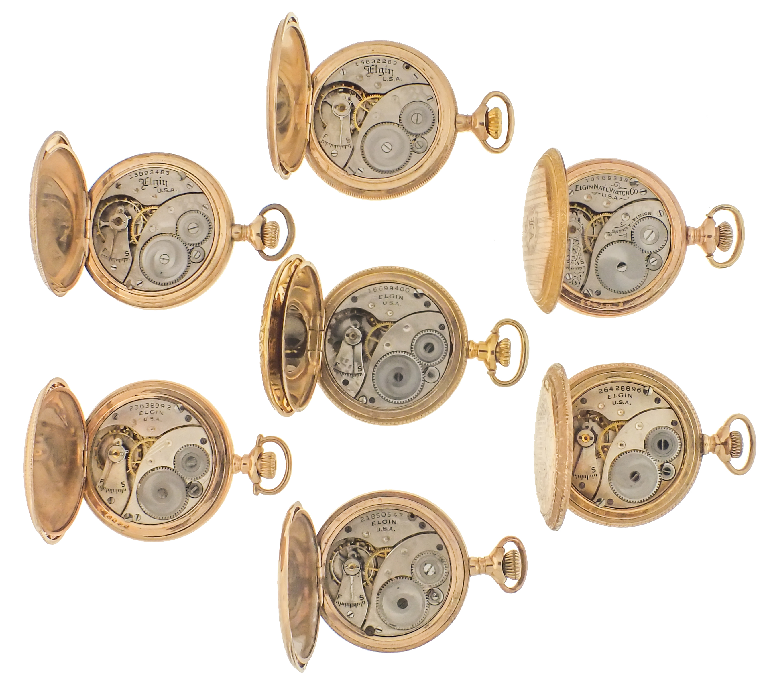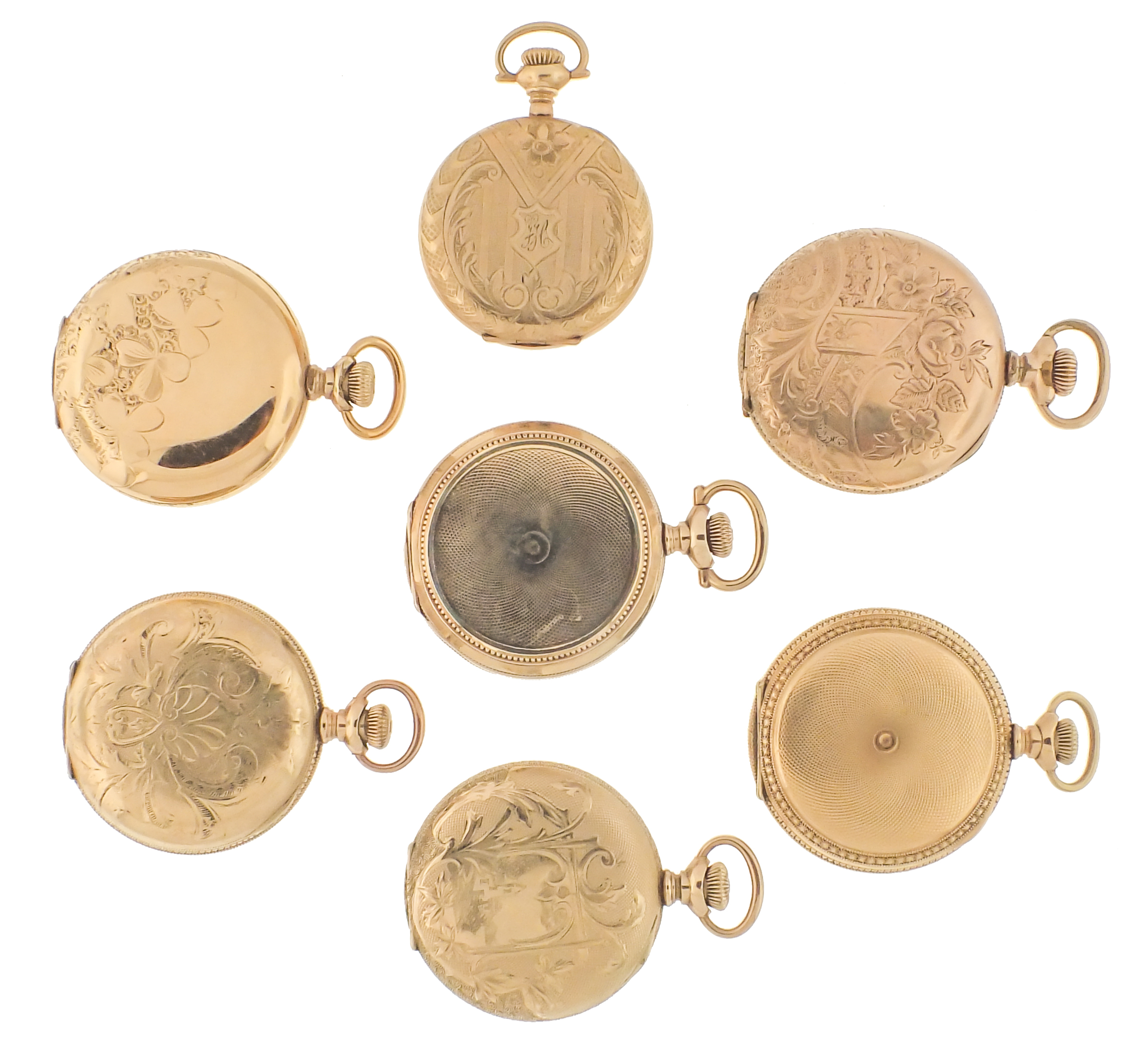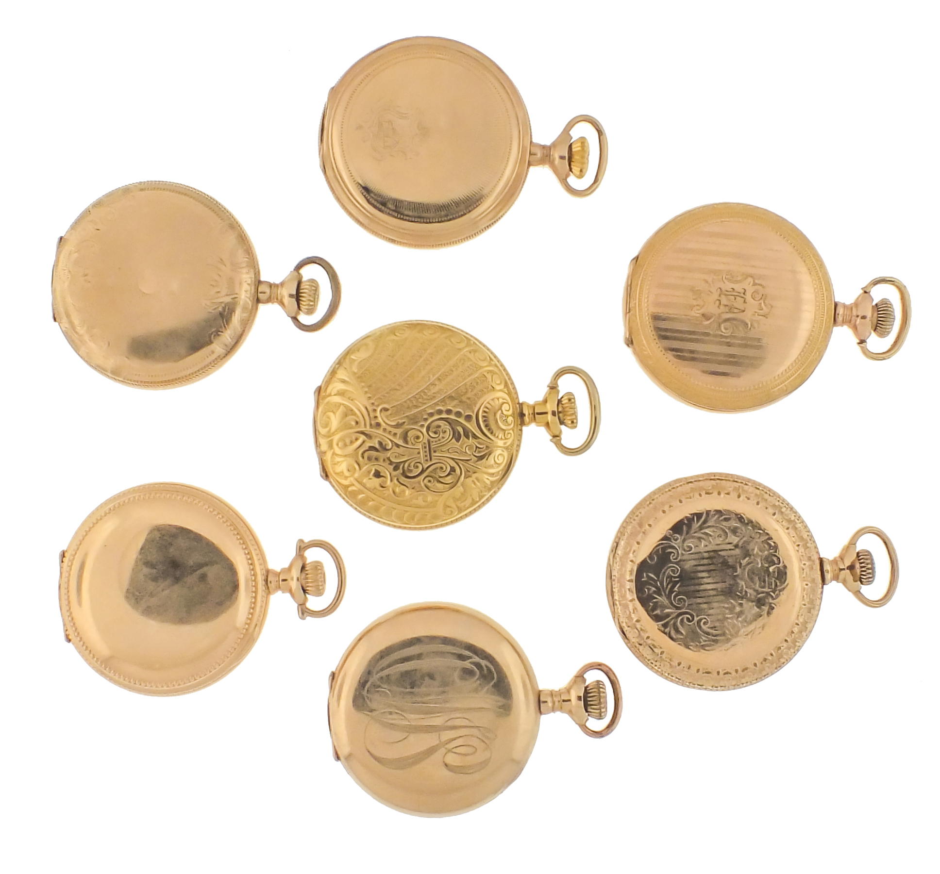Pocket watches- 14 (Fourteen), all Elgin, 0- 3/0 size, all 7 jewel movements, white enamel dials, and gold filled hunting and open face cases
