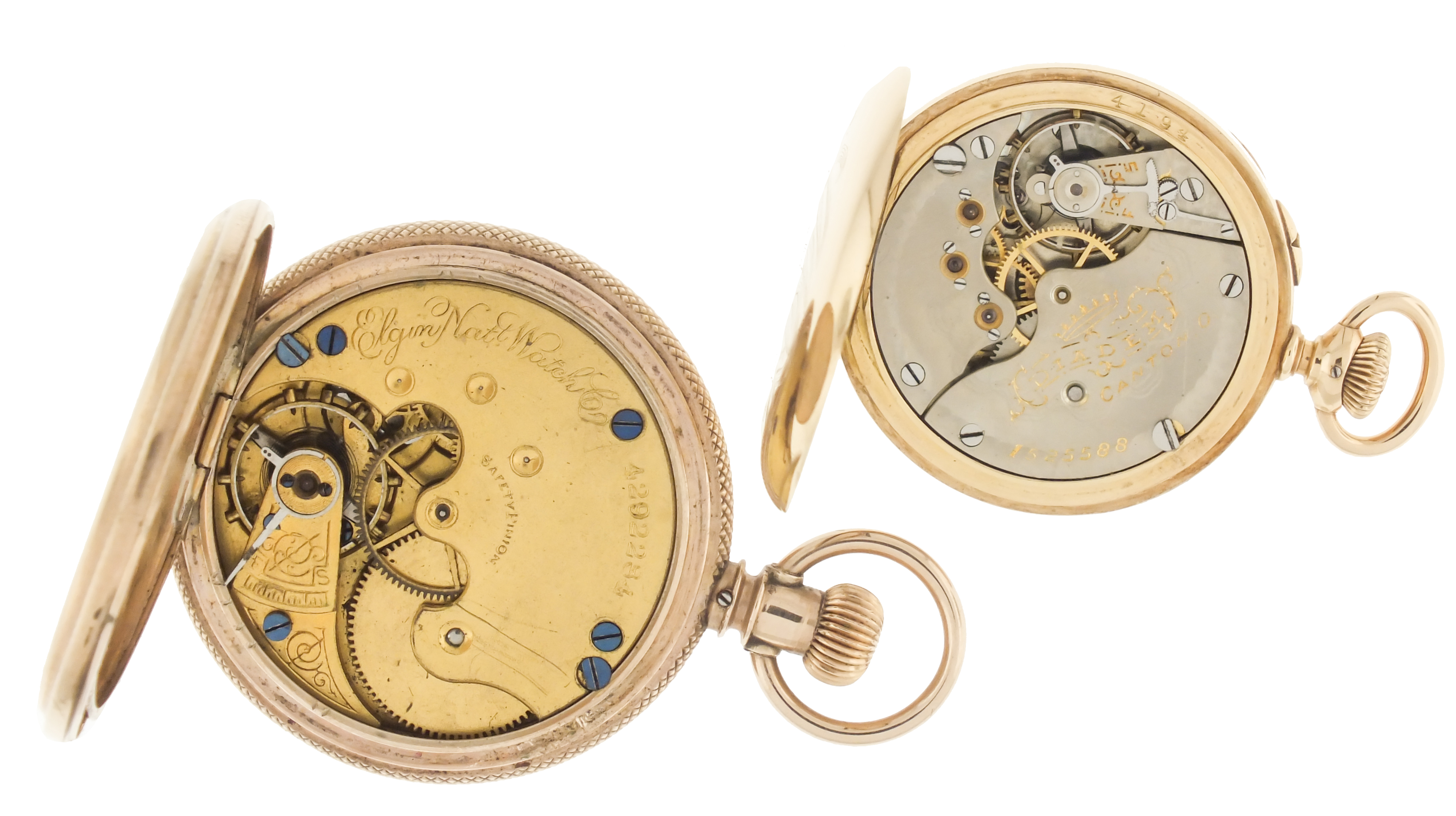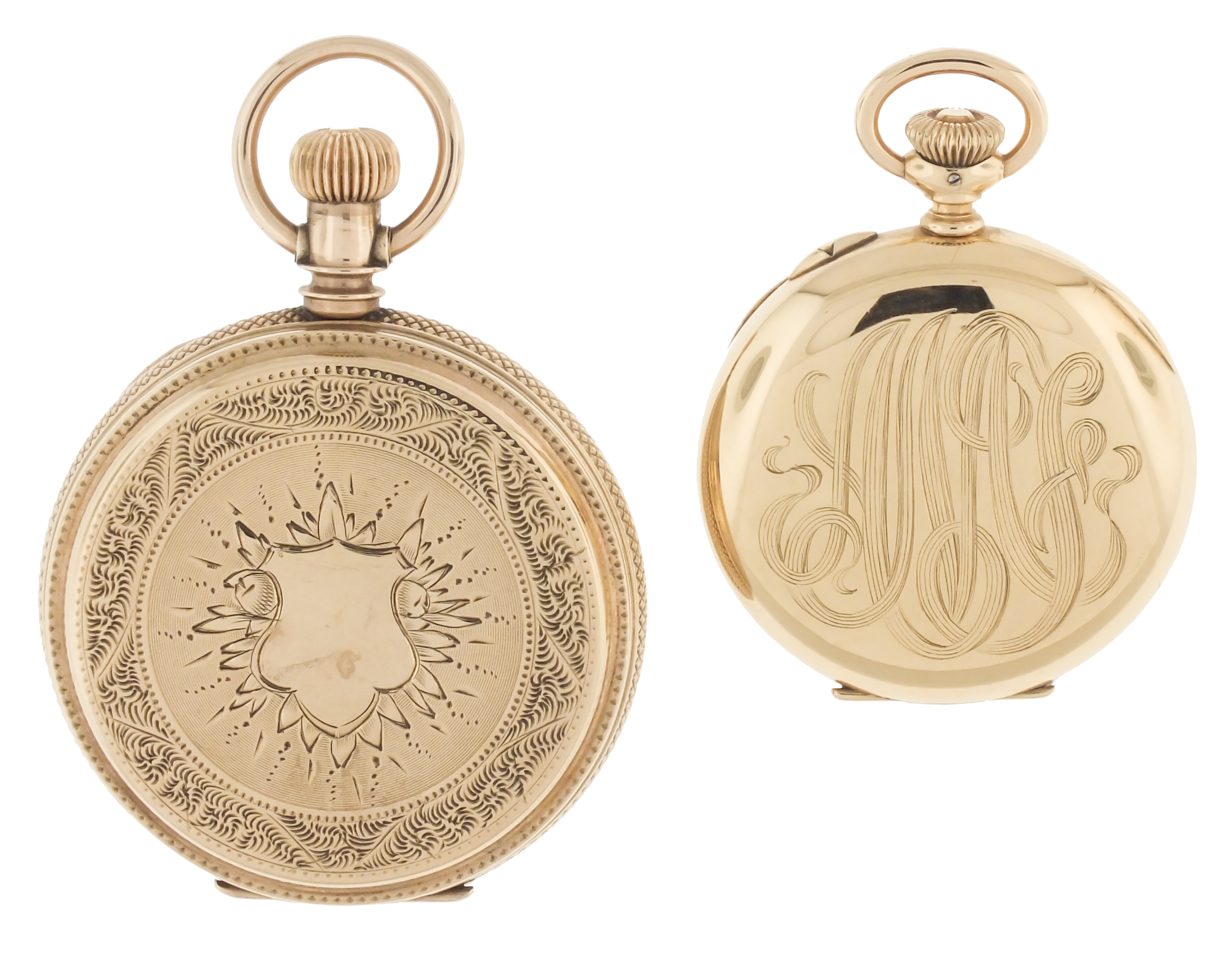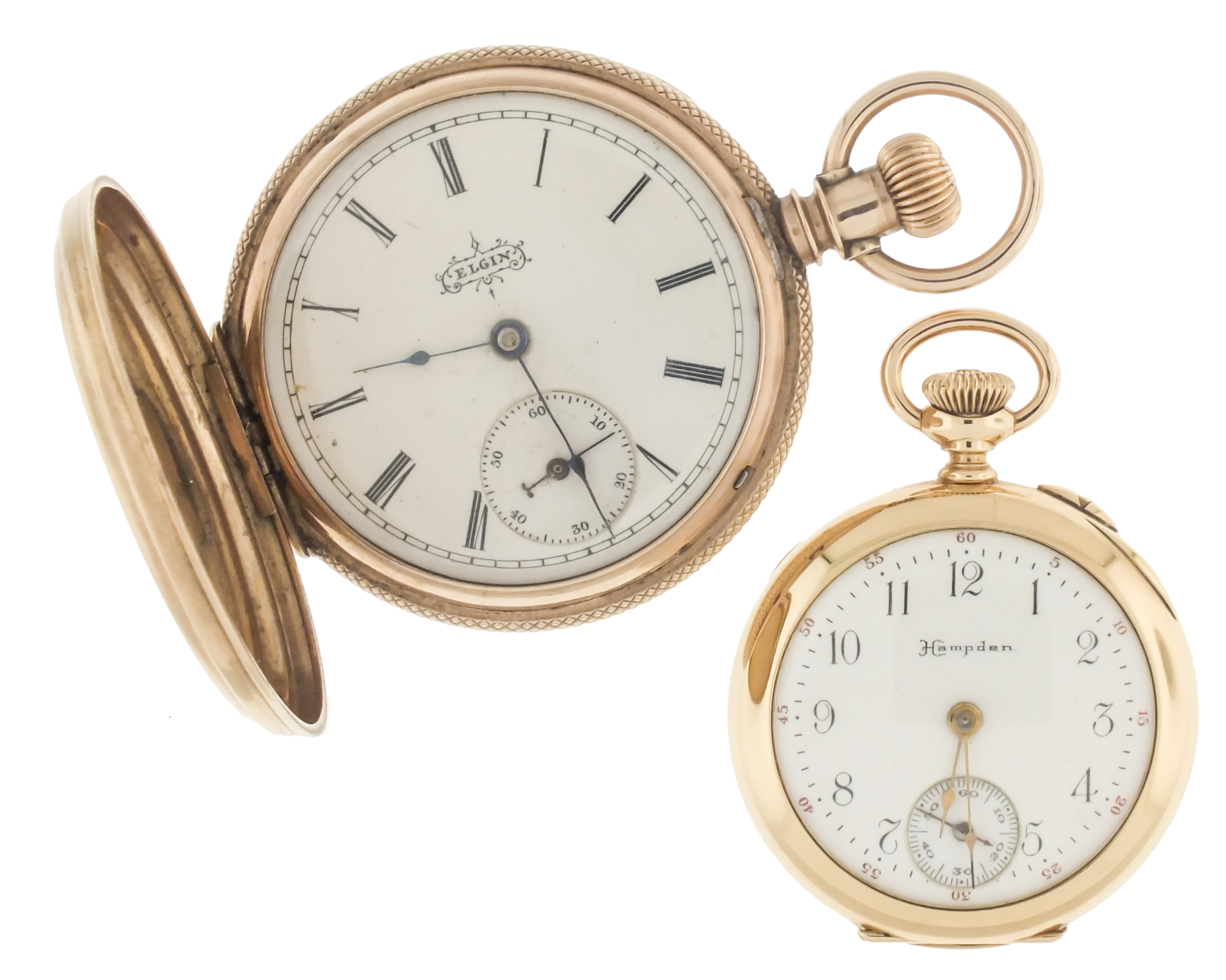 Pocket watches- 2 (Two), the first a 6 size Elgin, 7 jewel gilt movement, roman numeral white enamel dial, and 8- 9 karat gold "Brooklyn Eagle" hunting case, serial #4292284, 50.9g TW, the other a 3/0 size Hampden, 15 jewel nickel movement, arabic numeral white enamel dial, 14 karat gold open face case, serial #1525588, 27.3g TW