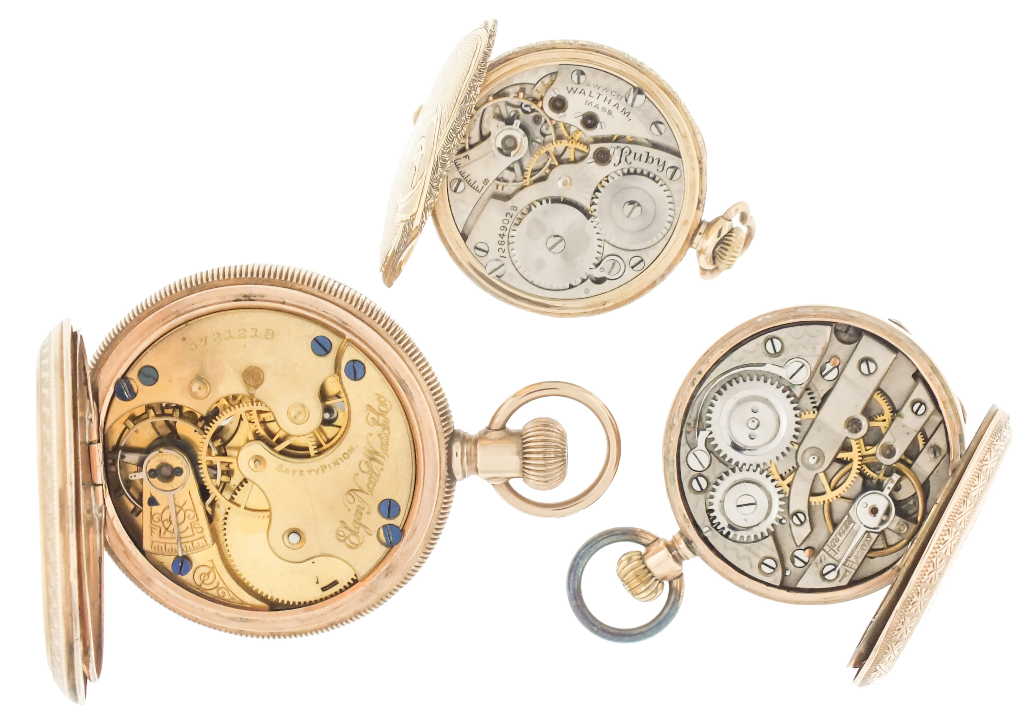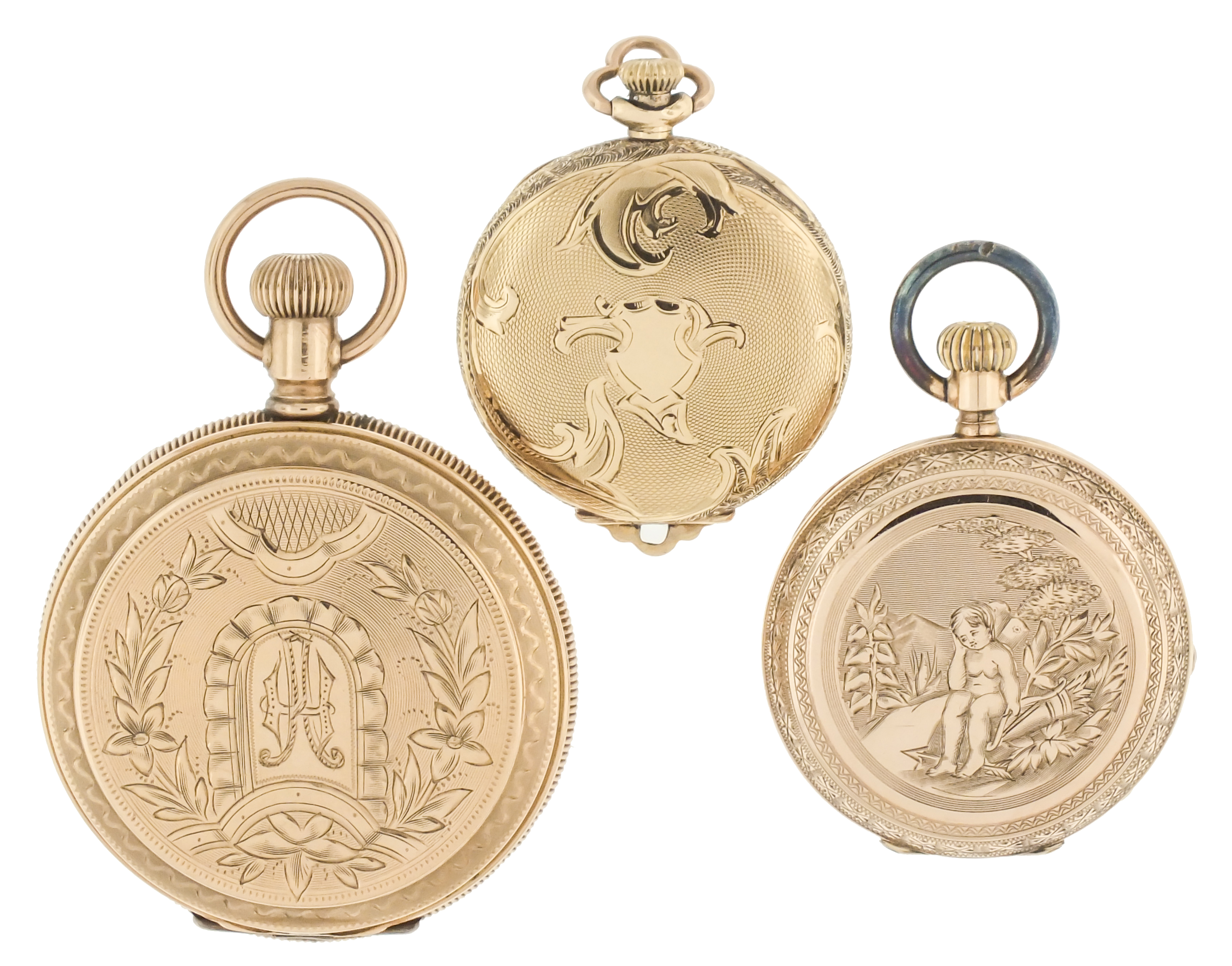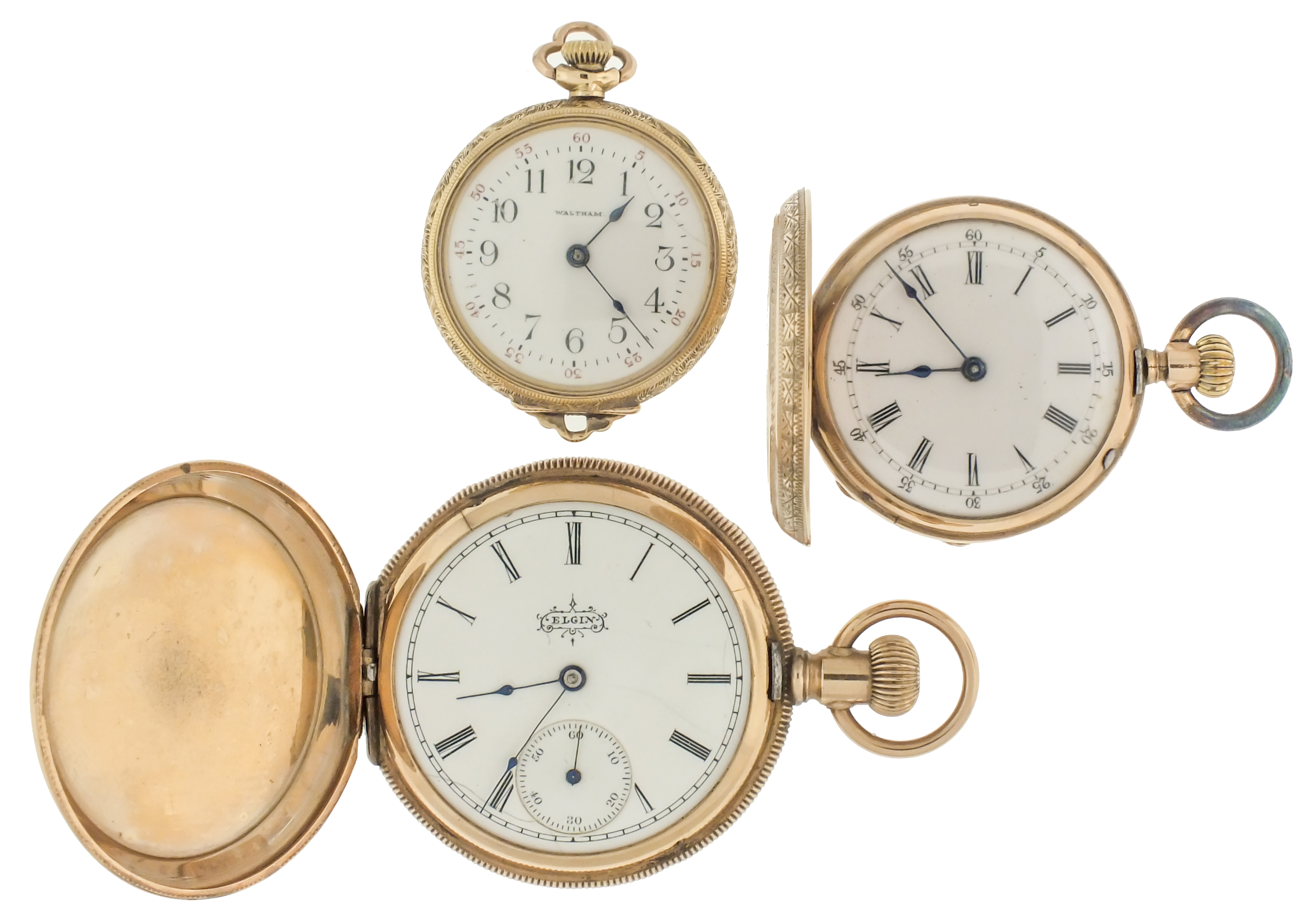 Pocket watches- 3 (Three), the first a 6 size Elgin, 7 jewel gilt movement, roman numeral white enamel dial, 9 karat rose gold hunting case, serial #5721218, 51g TW, the next a 6/0 size Waltham, 15 jewel nickel movement, arabic numeral white enamel dial, 14 karat yellow gold open face case, serial #12649028, 21.3g TW, and a Swiss pendant watch signed Louis Jacot, 10 jewel nickel movement with cylinder escapement, roman numeral white enamel dial, 8- 9 karat rose gold hunting case, 26.6g TW