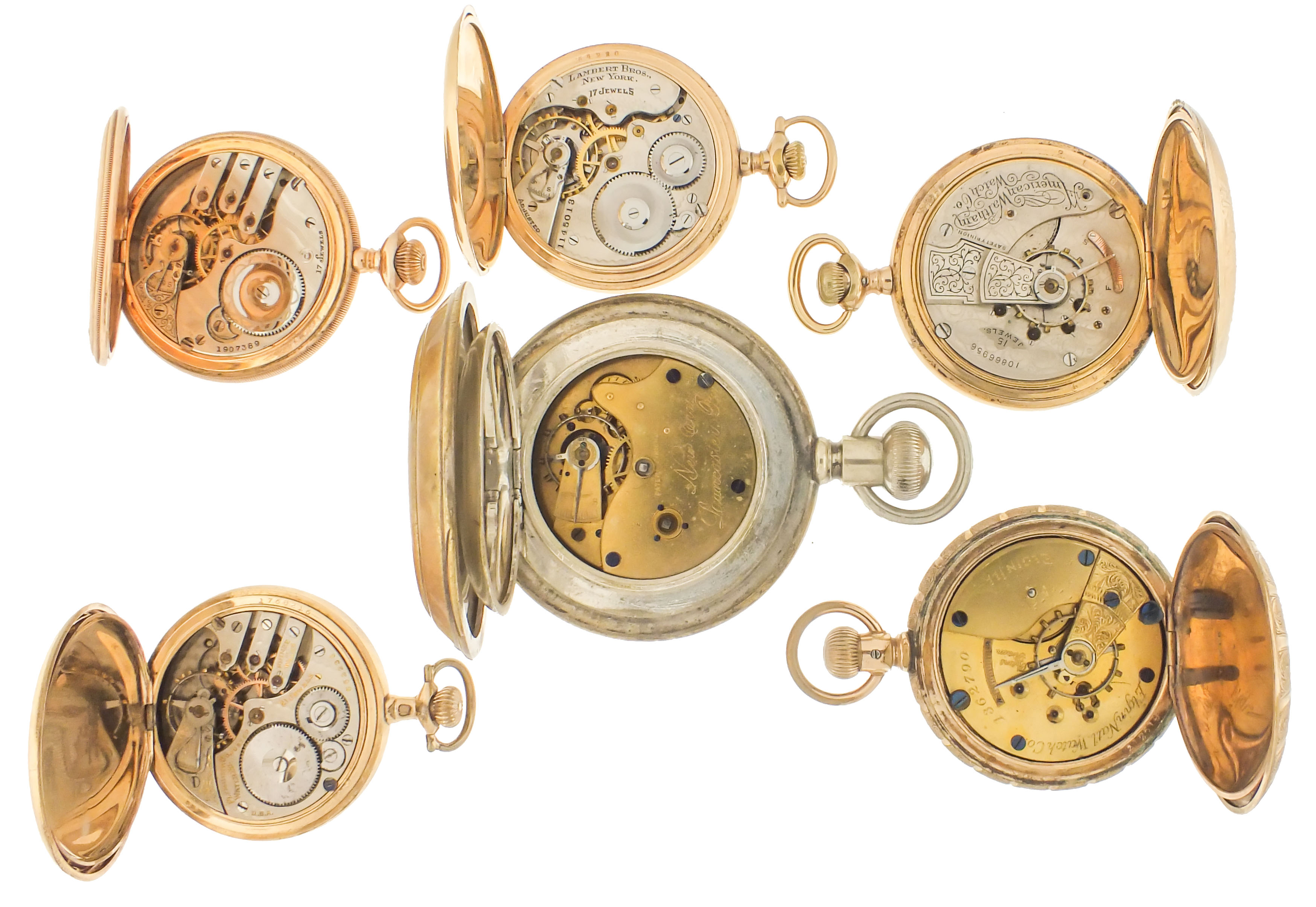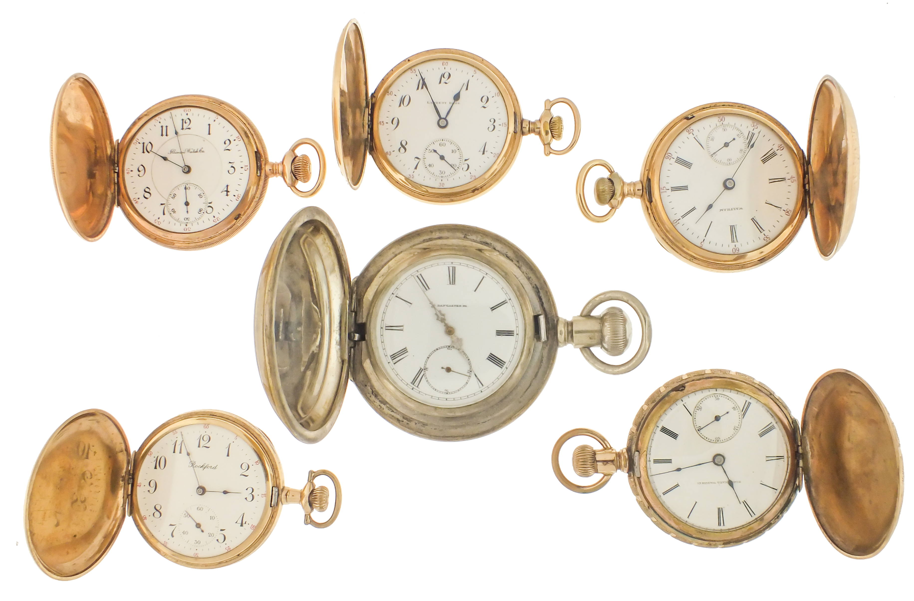 Pocket watches- 6 (Six), makers including Lancaster, Illinois, Hamilton, Waltham, Elgin, and a Rockford/ Plymouth "Prince of Wales", 16 and 18 size, 7- 21 jewel nickel and gilt movements, white enamel and metal dials, five with gold filled hunting cases, the other with a large, silver plated brass hunting case