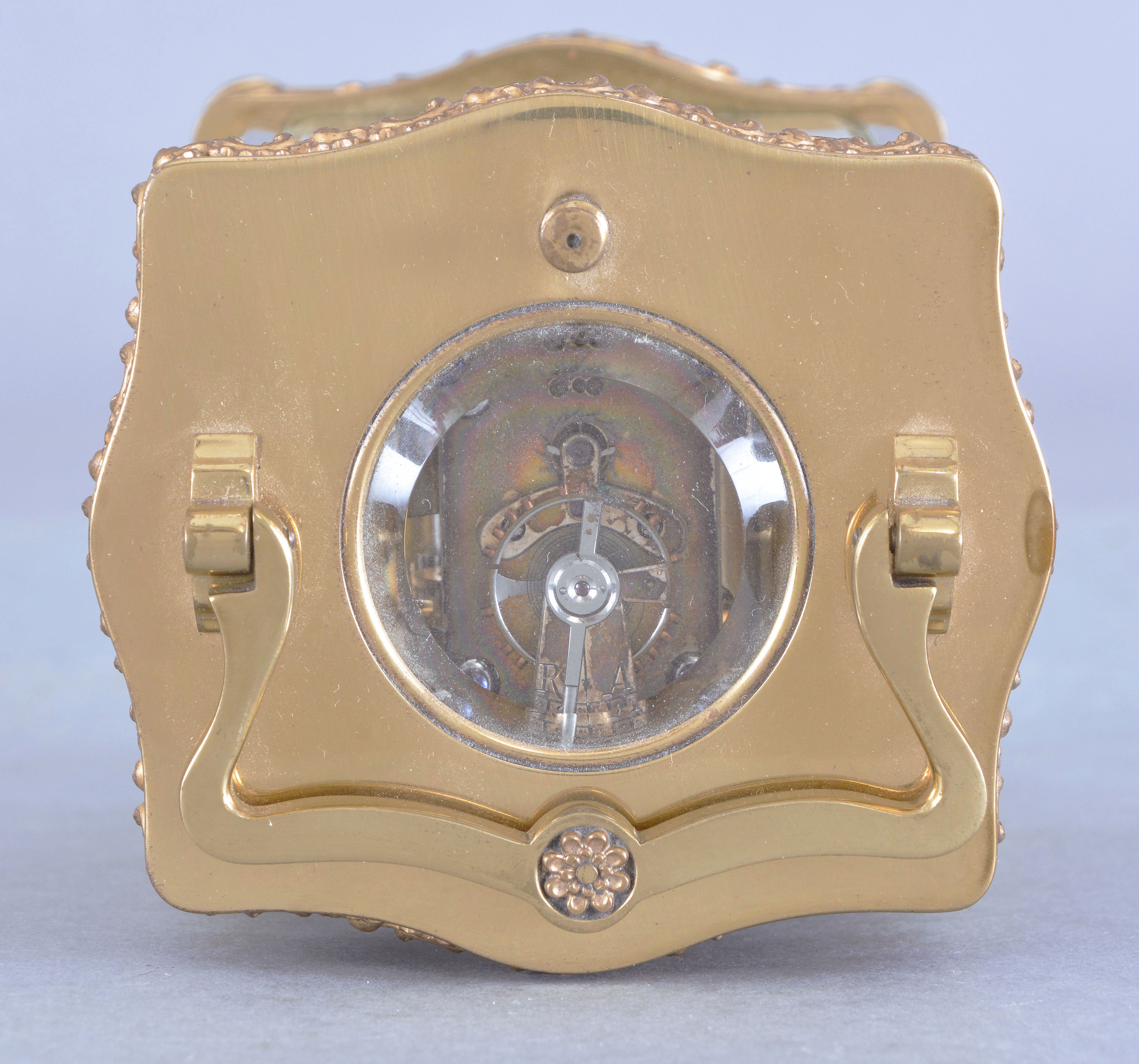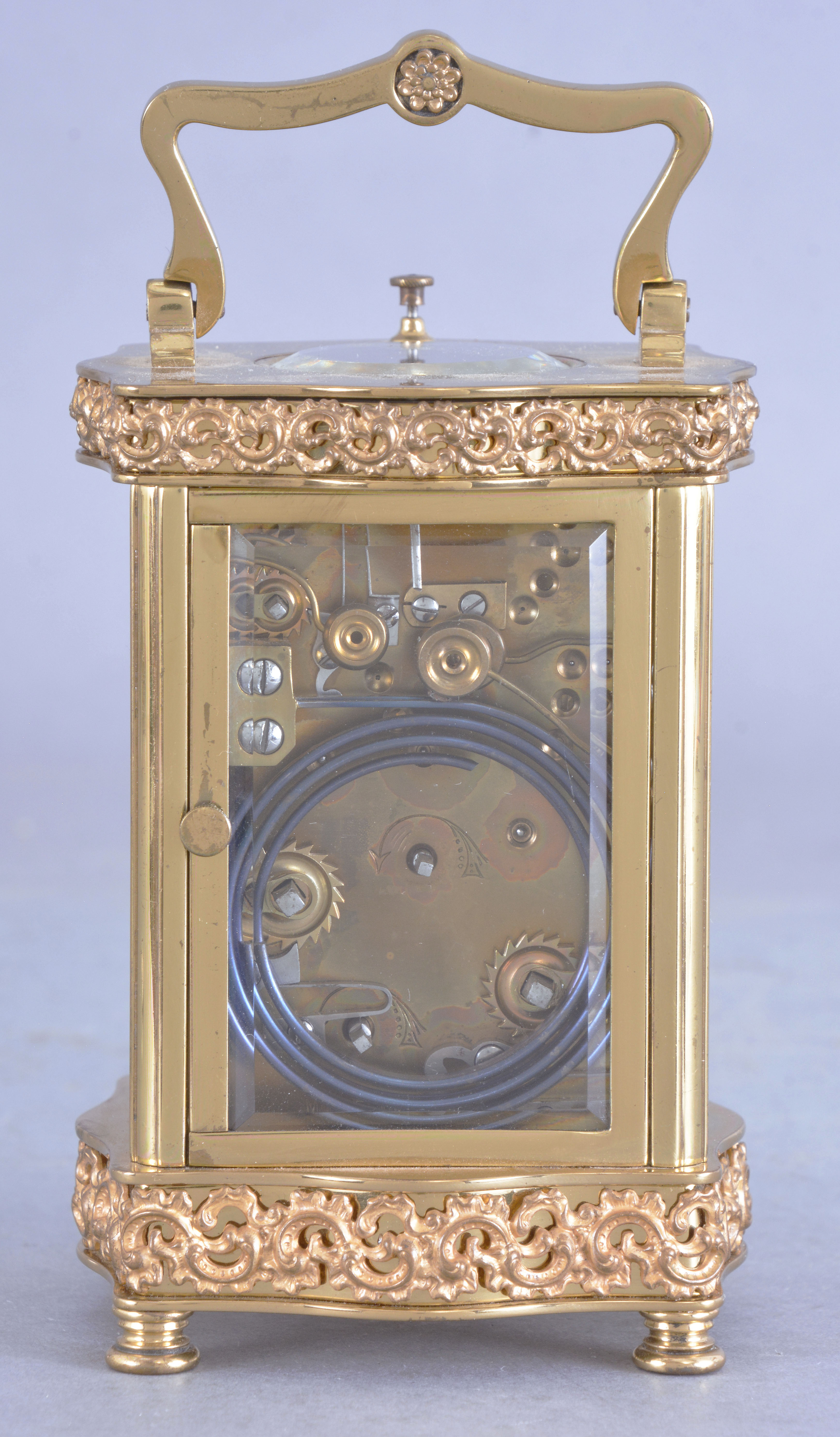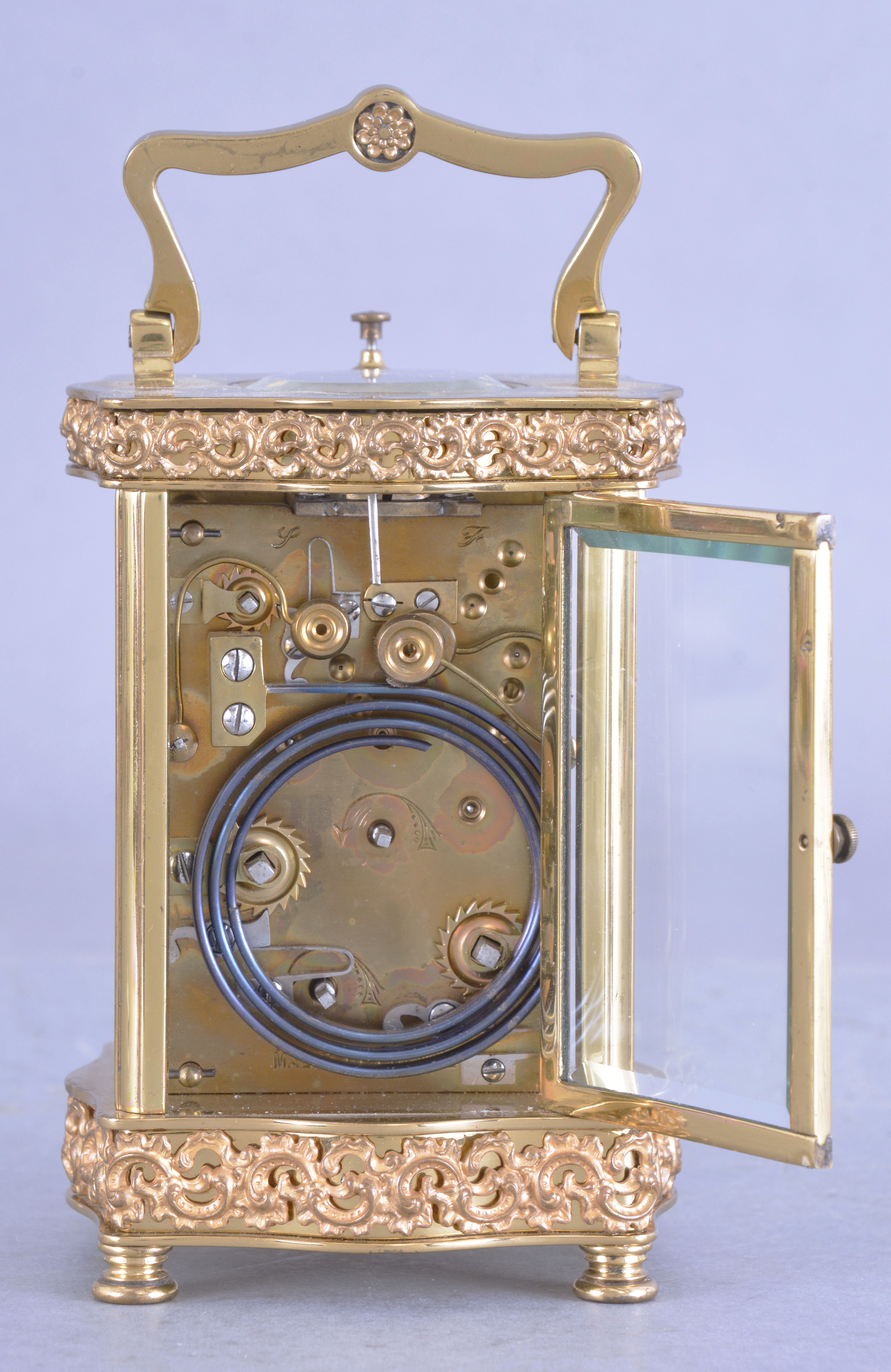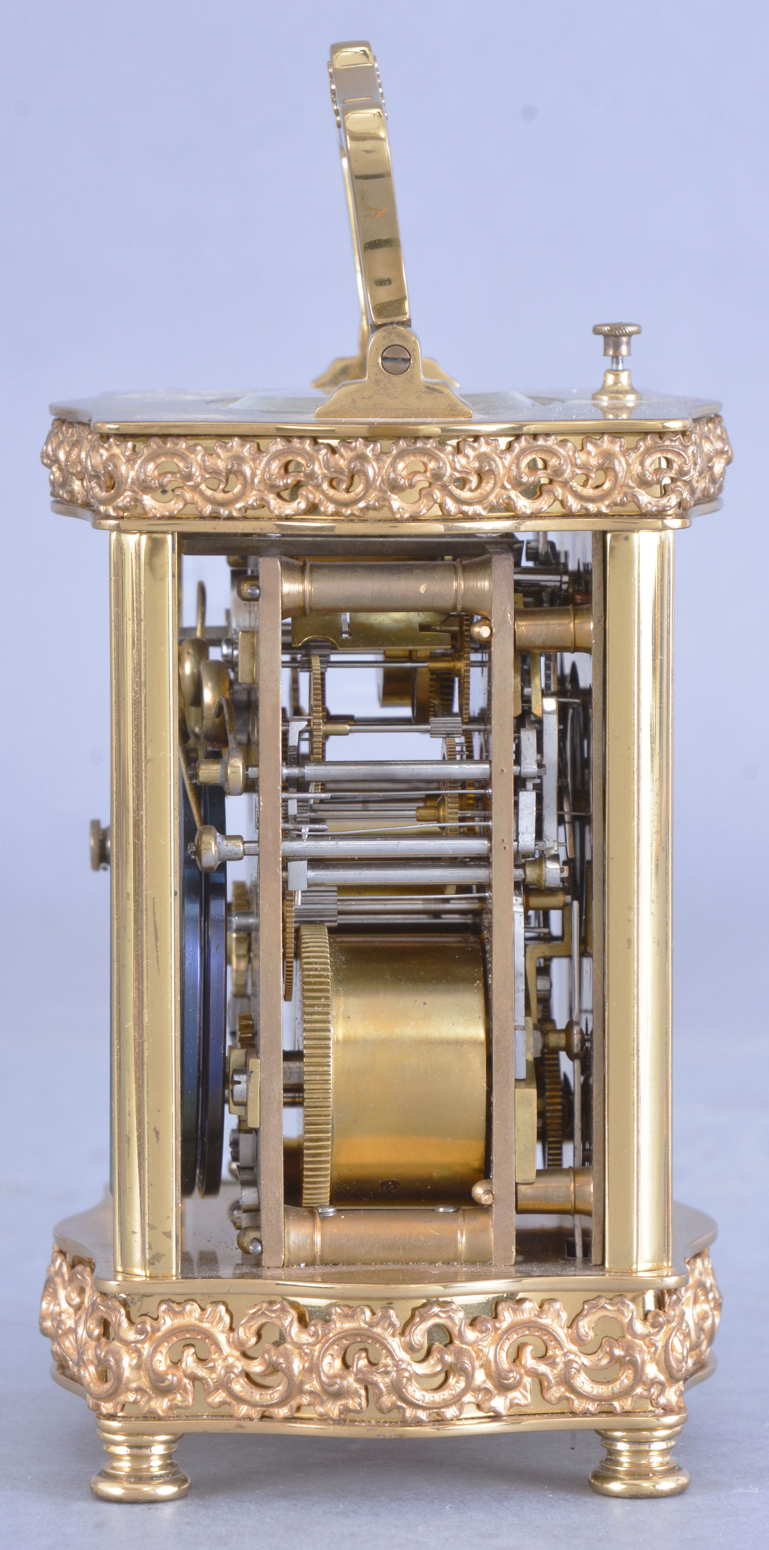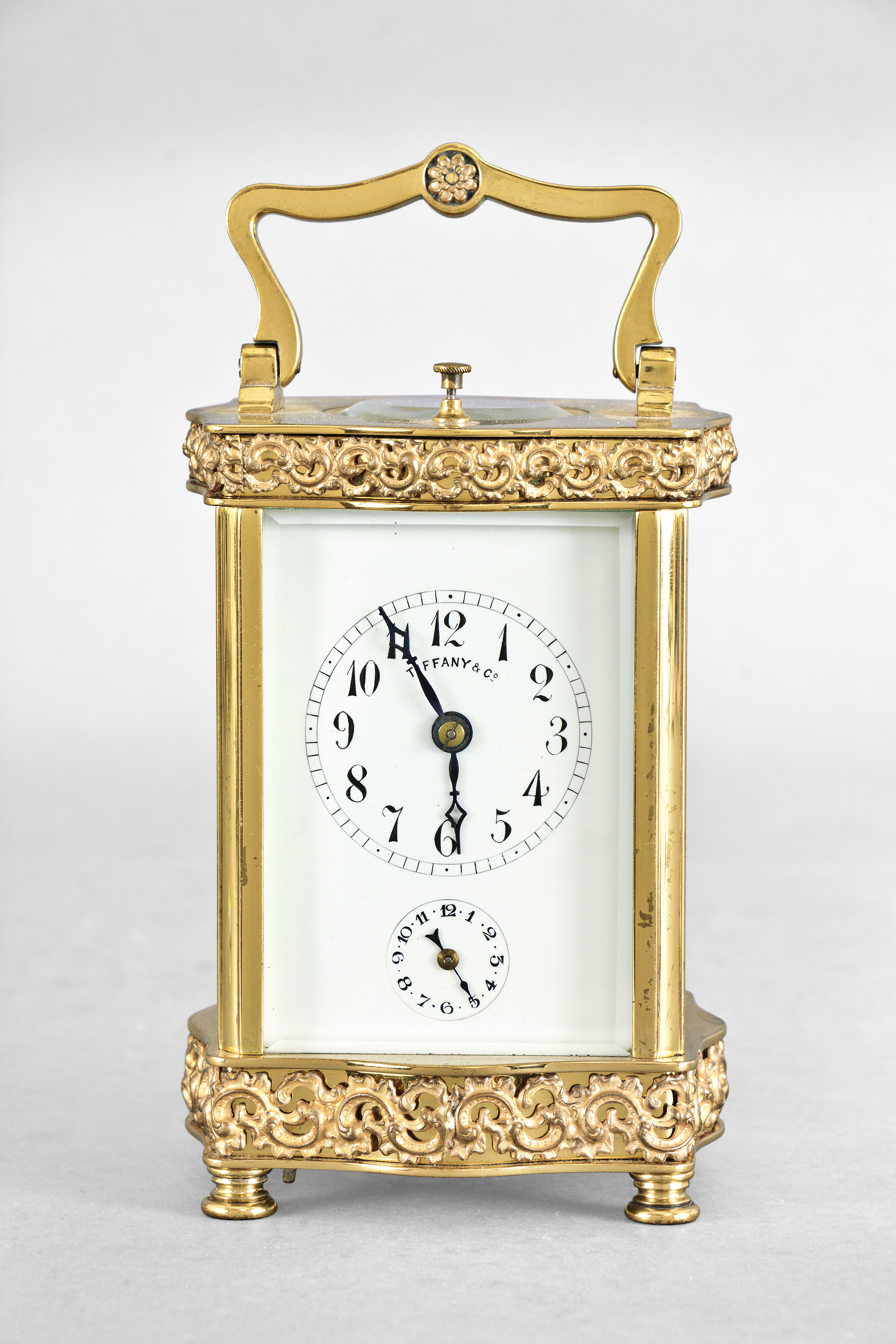 France, for Tiffany & Co., an early 20th century grand sonnerie striking carriage clock with alarm, the polished brass Louis XV Doucine case with applied, cast C scroll ornaments at top and base, signed, arabic numeral white enamel dial with subsidiary alarm chapter, blued steel hands, 8 day three train movement with lever platform and cut bimetallic balance, striking the hours and quarters in passing and repeating the last hour and quarter on demand, a three position lever in the base for control of the strike function
