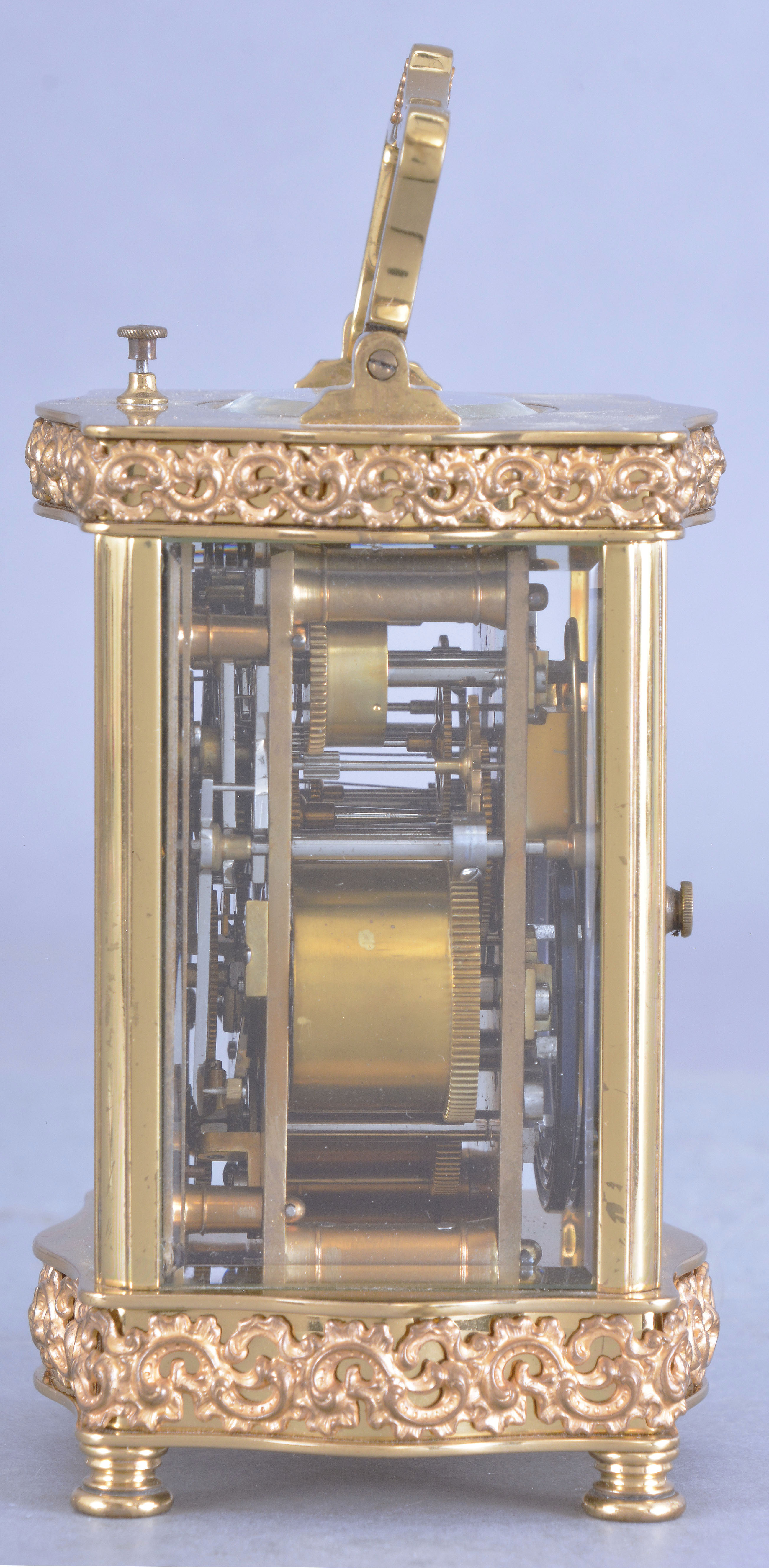 case polished and lacquered, losses to gilding on C scroll ornament, left side glass missing, right side glass with small chips, top center and and lower left, dial with hidden losses at upper left and right corners, hands good, movement a bit dirty, running, striking and repeating correctly, would benefit from service. An interesting technical feature of this clock is that there is no dead blow between the hours and quarters, so the quarters commence immediately following the hours.