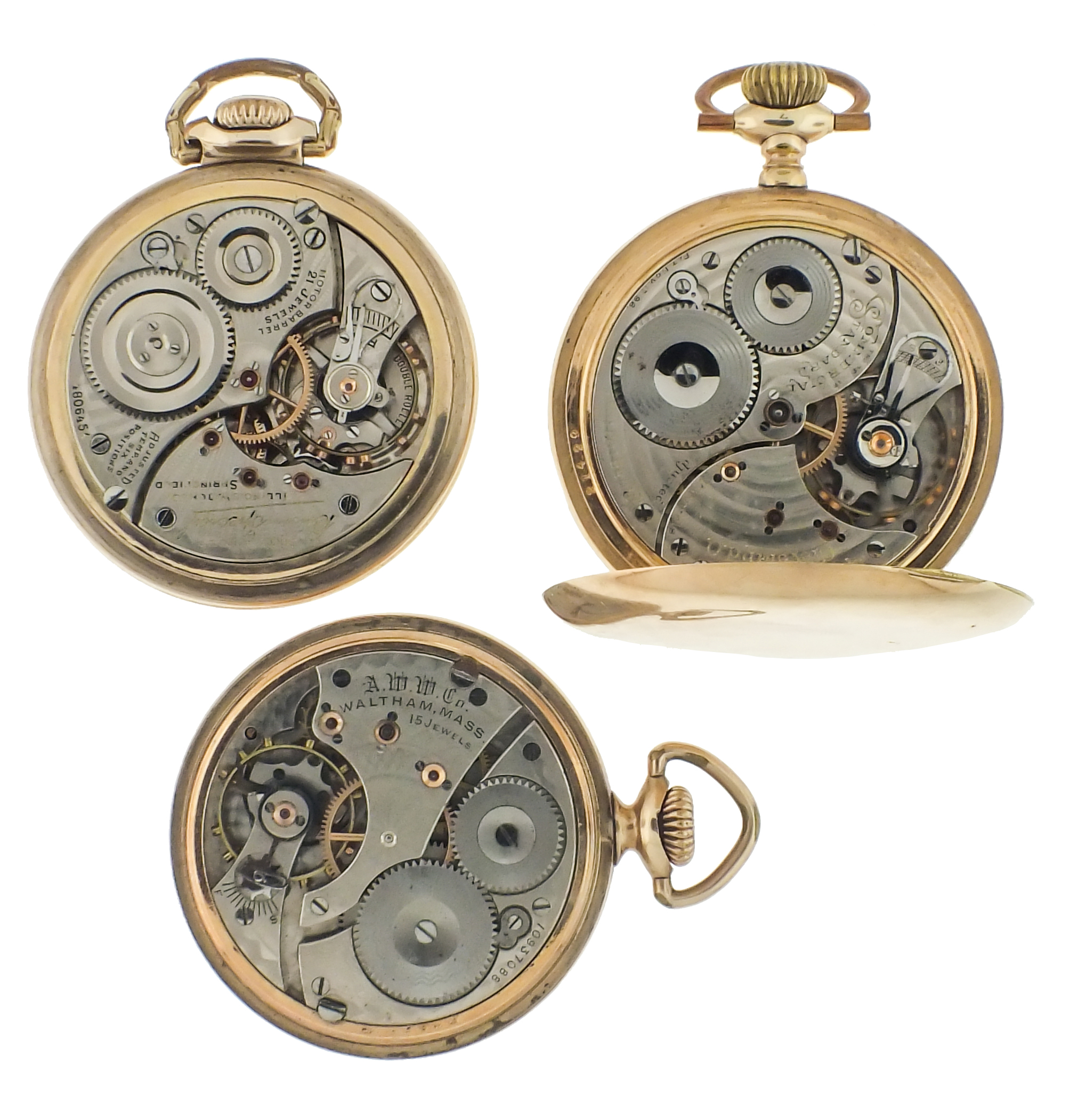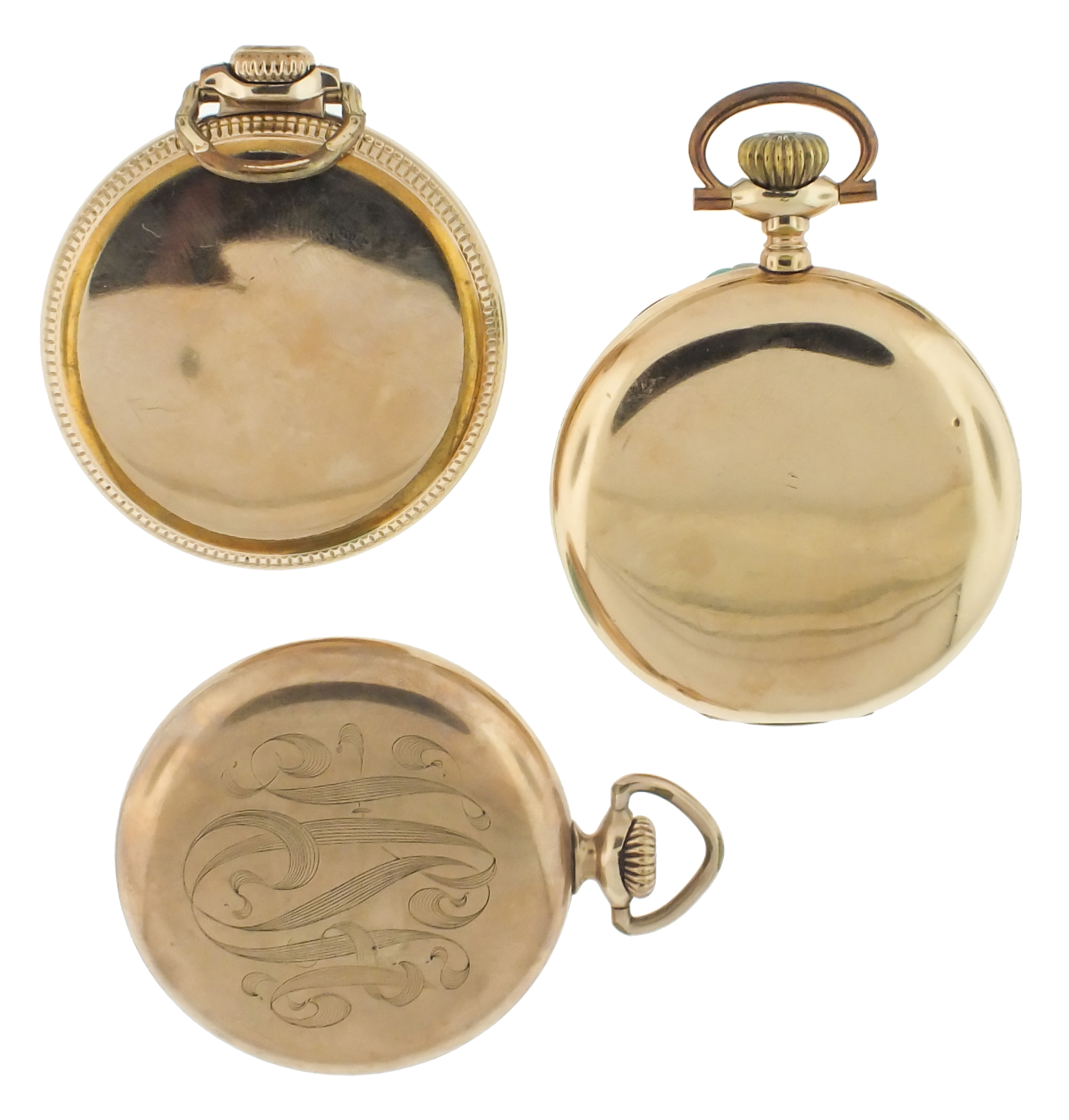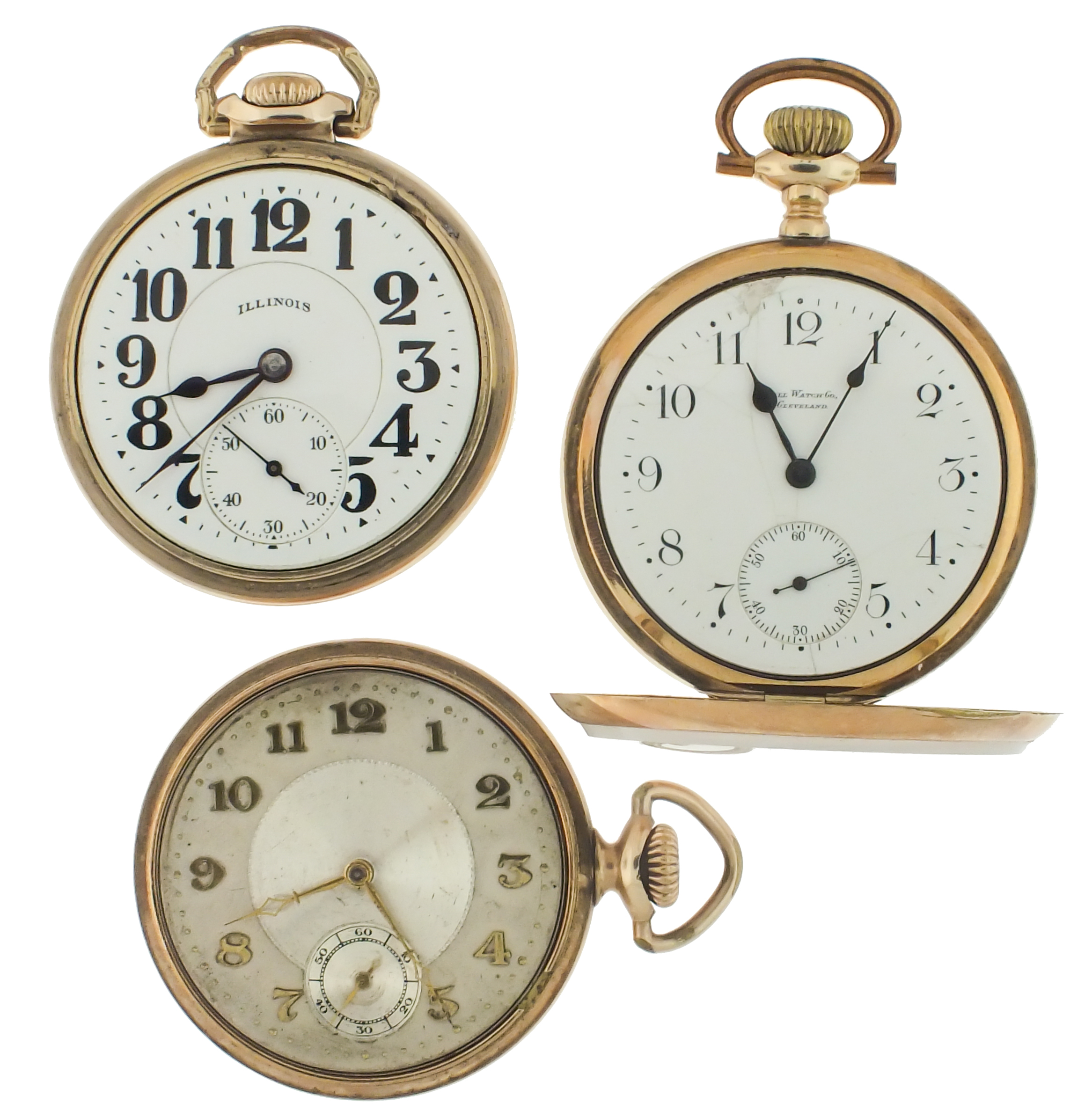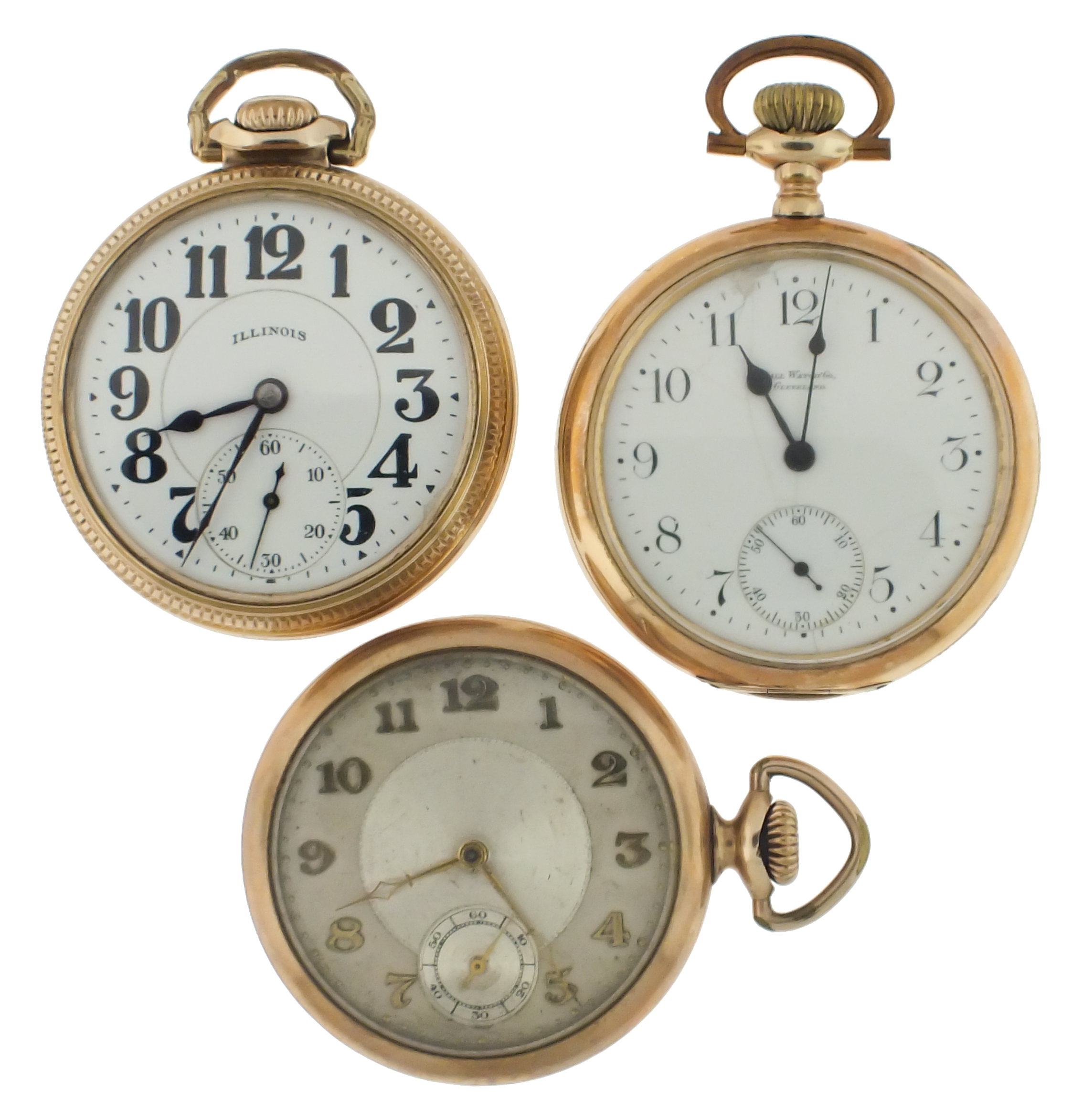 Pocket watches- 3 (Three), all 16 size, the first an Illinois "Bunn Special", 60 hour, 21 jewel nickel movement, arabic numeral white enamel dial, gold filled open face case, serial #4806454, the next a Ball/ Waltham "Commercial Standard", 17 jewel nickel movement, arabic numeral white enamel dial, gold filled open face case, serial #B0561931, and a Waltham model 1899, 15 jewel nickel movement, arabic numeral metal dial, gold filled open face case, serial #10937088