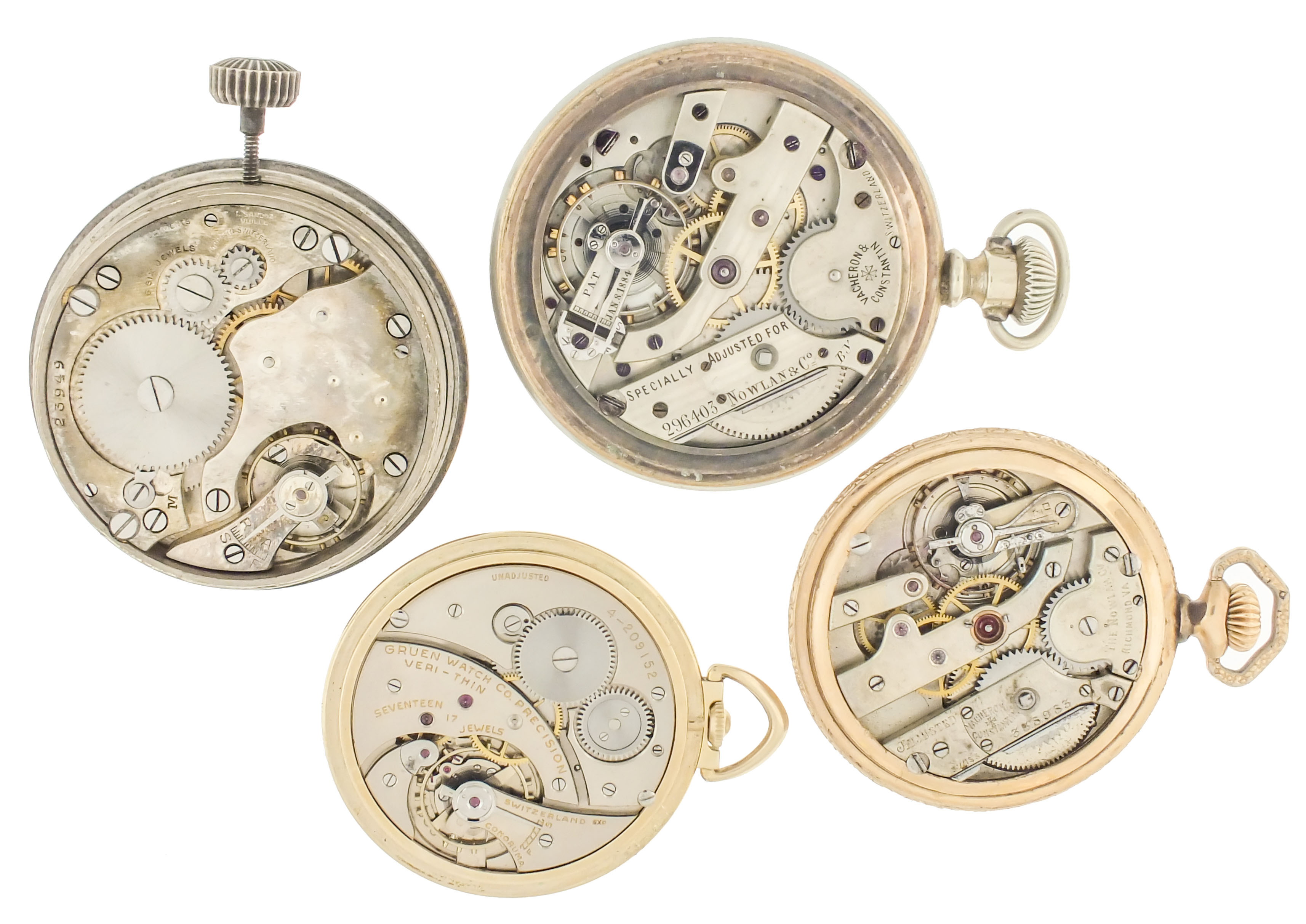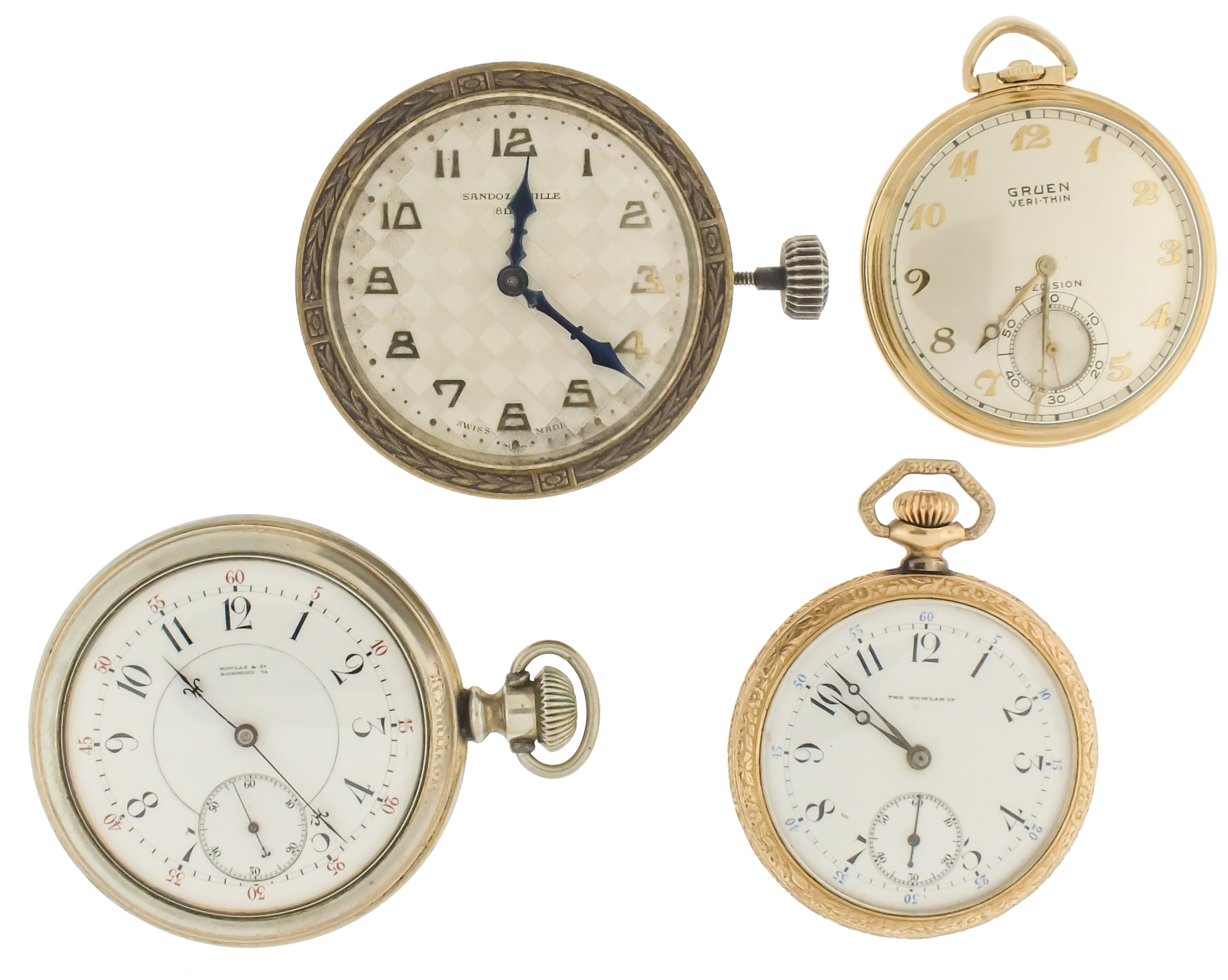 Pocket watches- 4 (Four), the first a 16 size Vacheron Constantin, 20 jewel nickel movement, arabic numeral white enamel dial, nickel display case, serial #296403, the next a 12 size Vacheron Constantin, 16 jewel nickel movement, arabic numeral white enamel dial, gold filled open face case, serial #338983, the third a Gruen Veri Thin, 17 jewel nickel movement, arabic numeral metal dial, gold filled open face case, serial #4-209152, and a Sandoz Vuille travel clock movement, 6 jewel, 8 day movement, arabic numeral metal dial, and threaded case, serial #23949