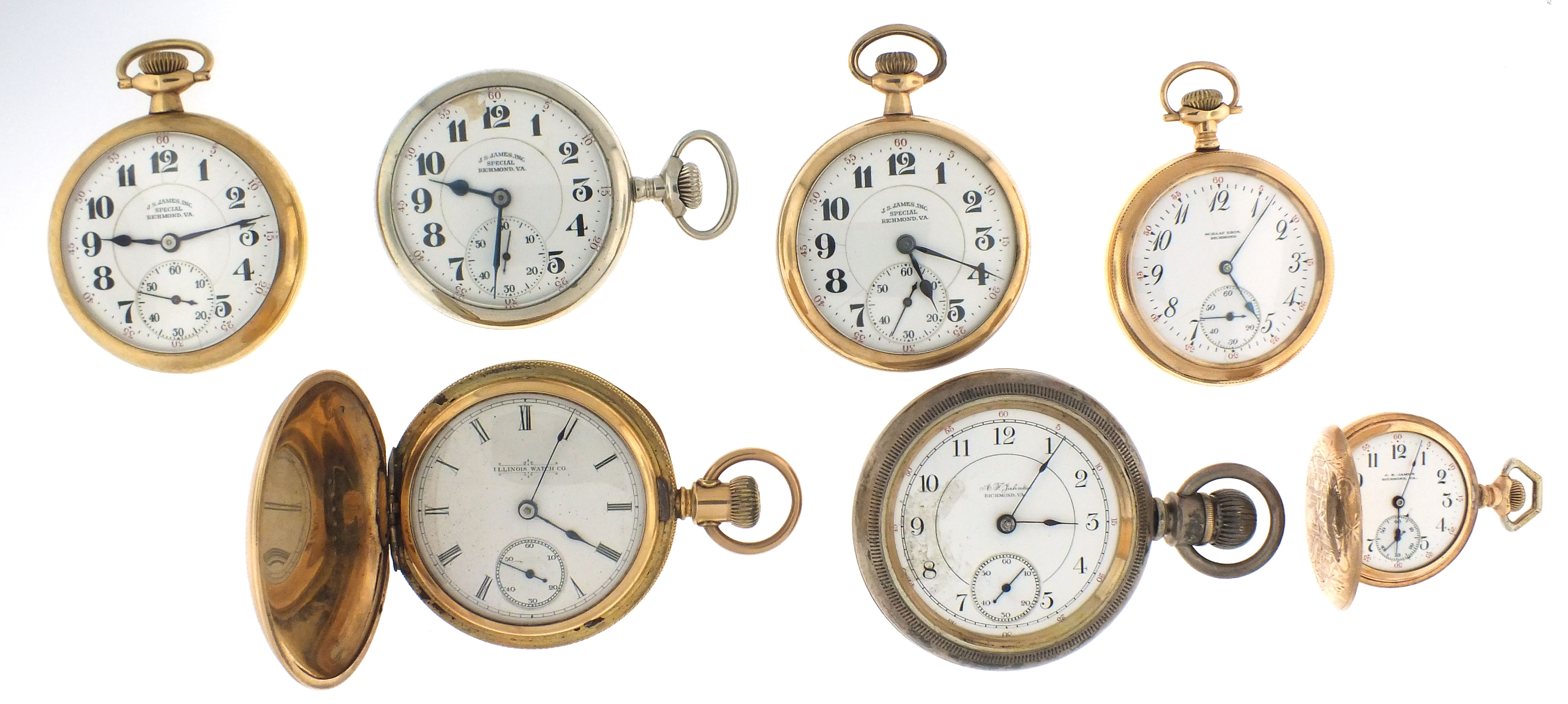Pocket watches- 7 (Seven), all Illinois, 18- 0 size, 11- 21 jewel movements, nickel, silver, and gold filled hunting and open face cases