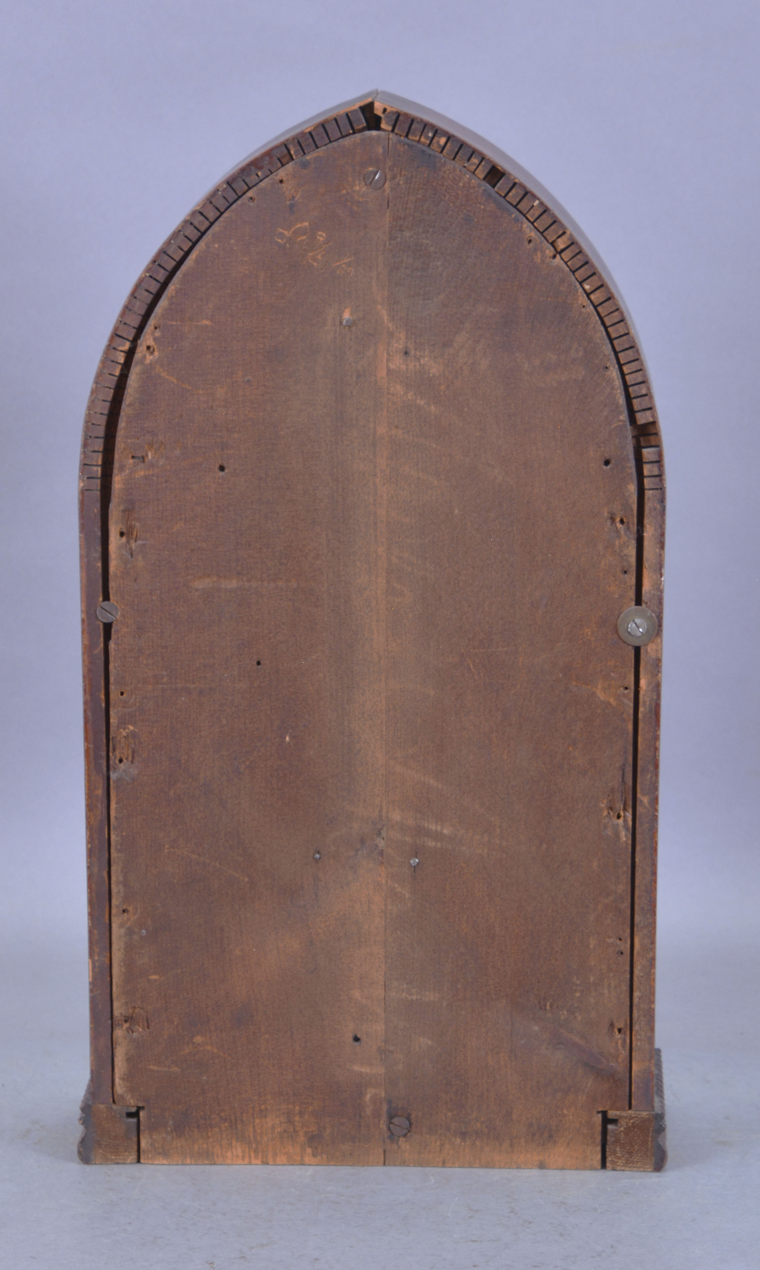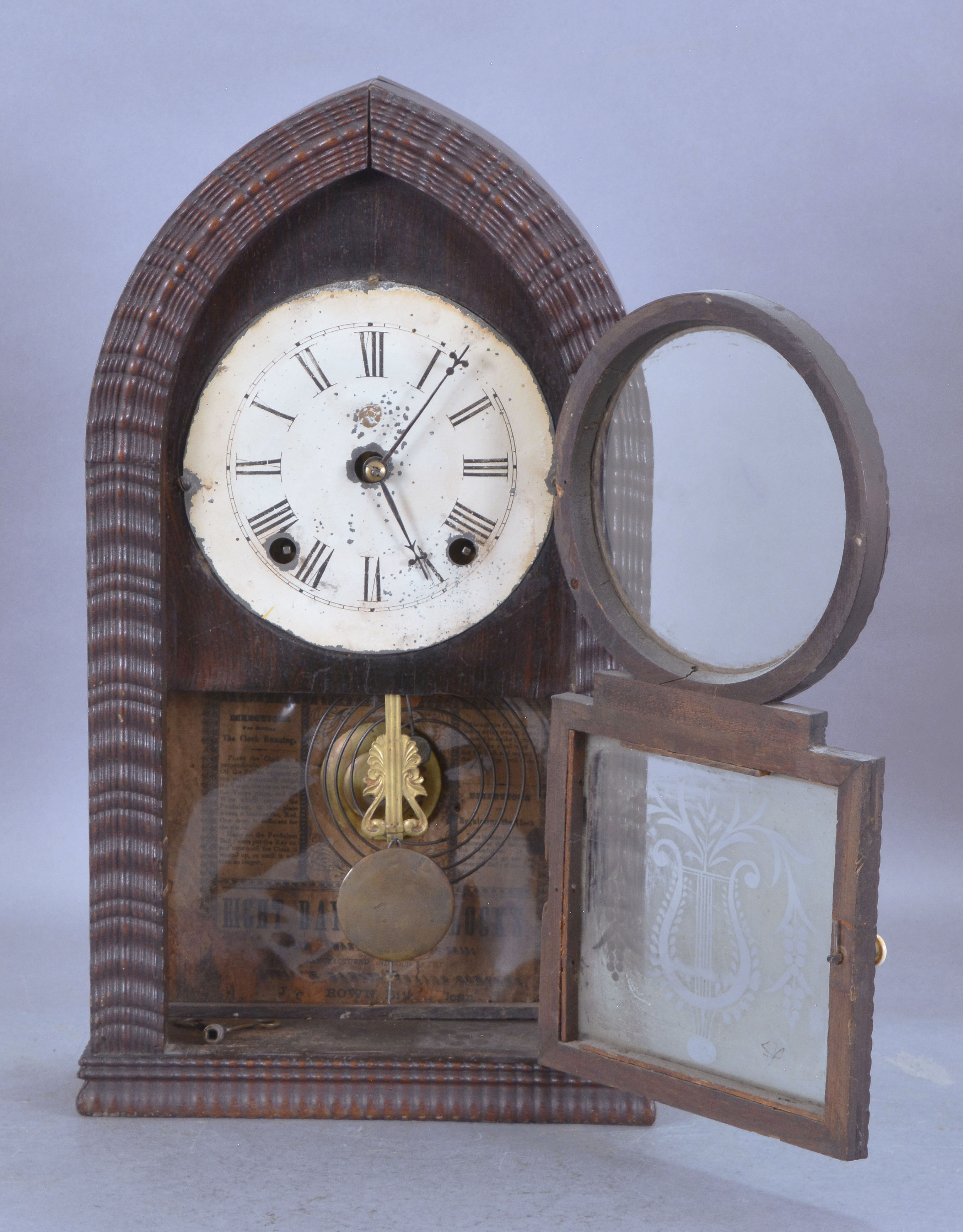 Mahogany veneered ripple case in nice condition in an original finish has a little veneer lifting at the top. Original painted dial has scattered loss. The hands are period, but maybe replaced as they don't quit match and look a little long. Original frosted tablet has some loss. Original bone door knob. Stained, but readable label inside