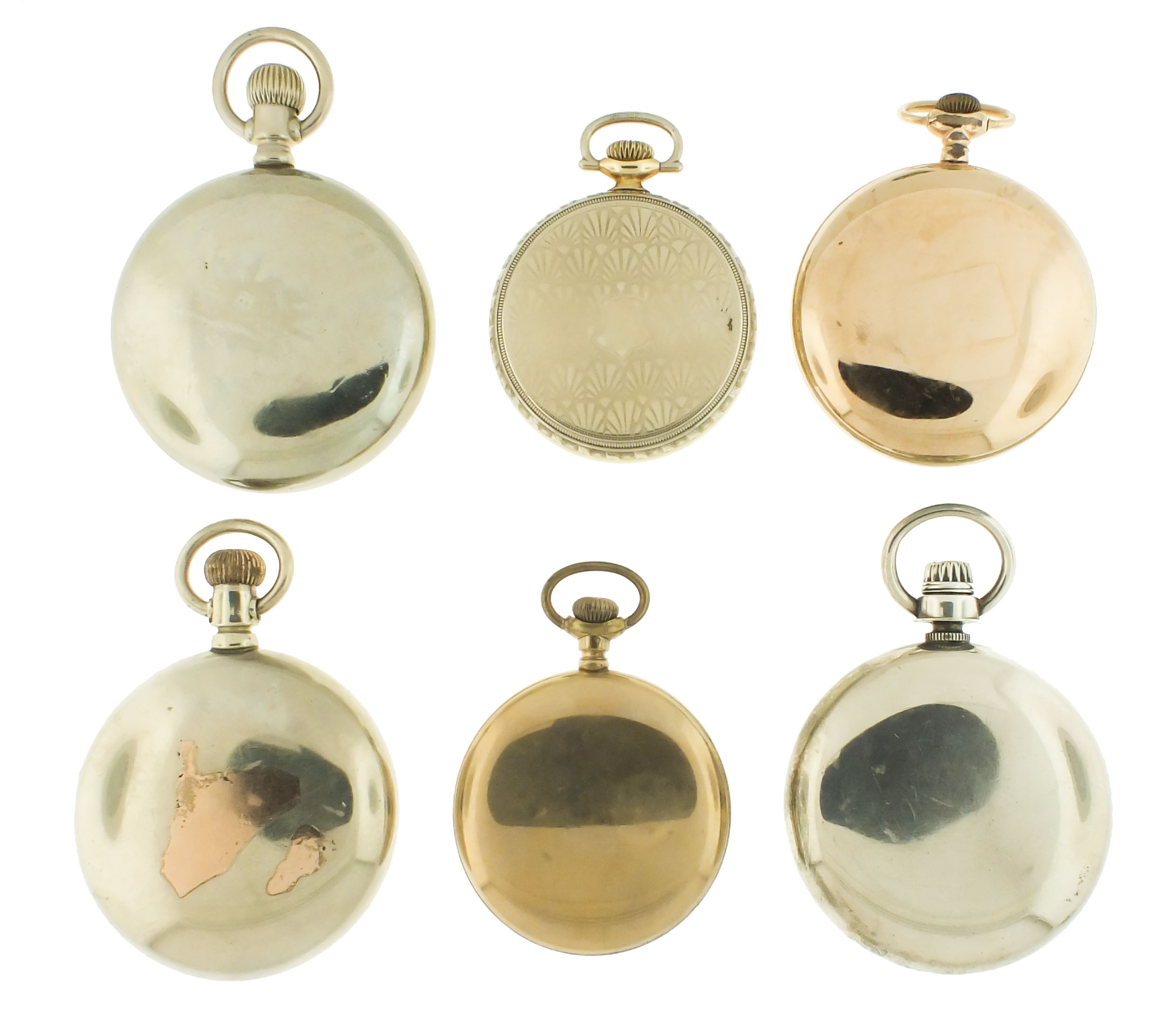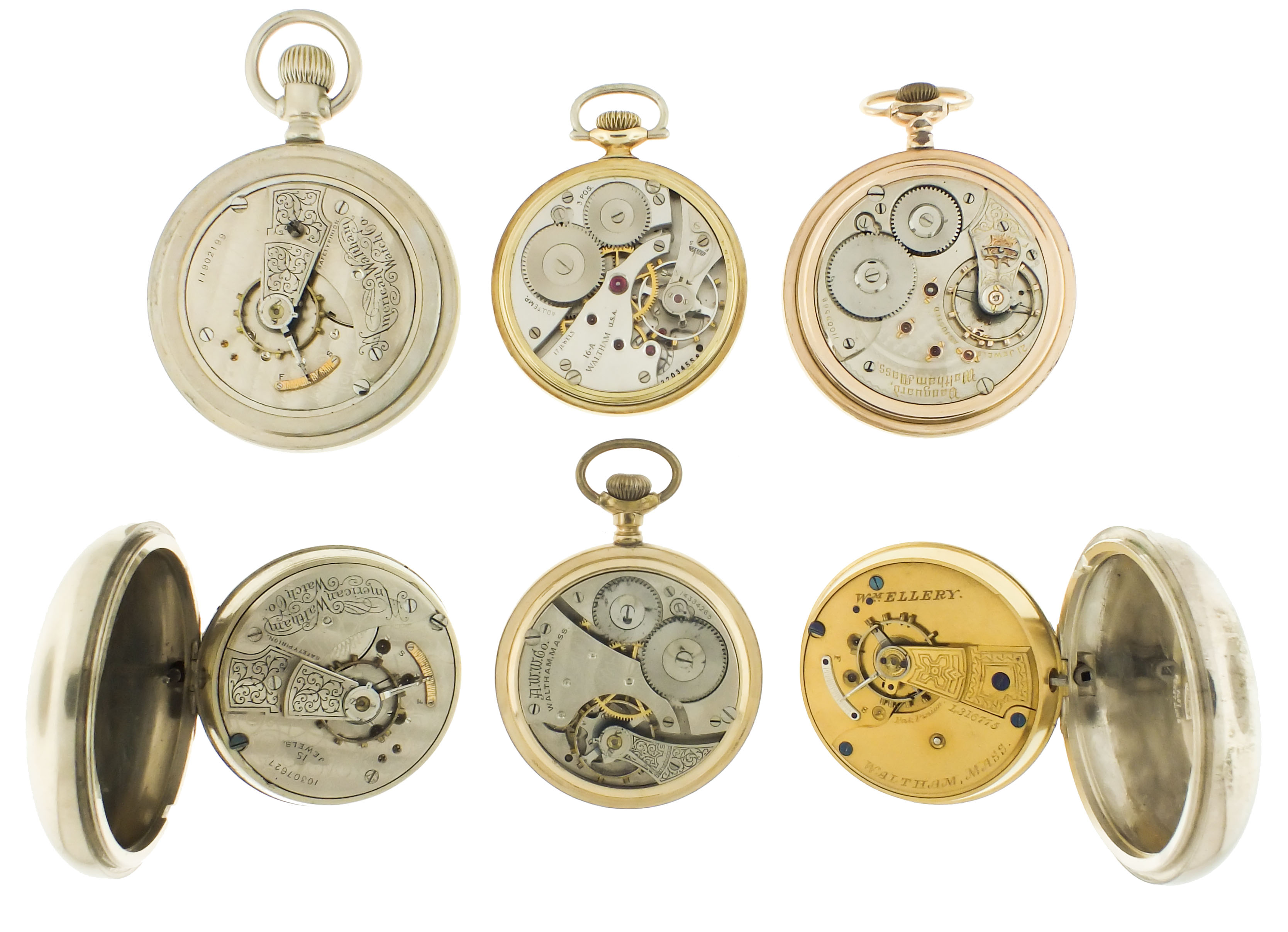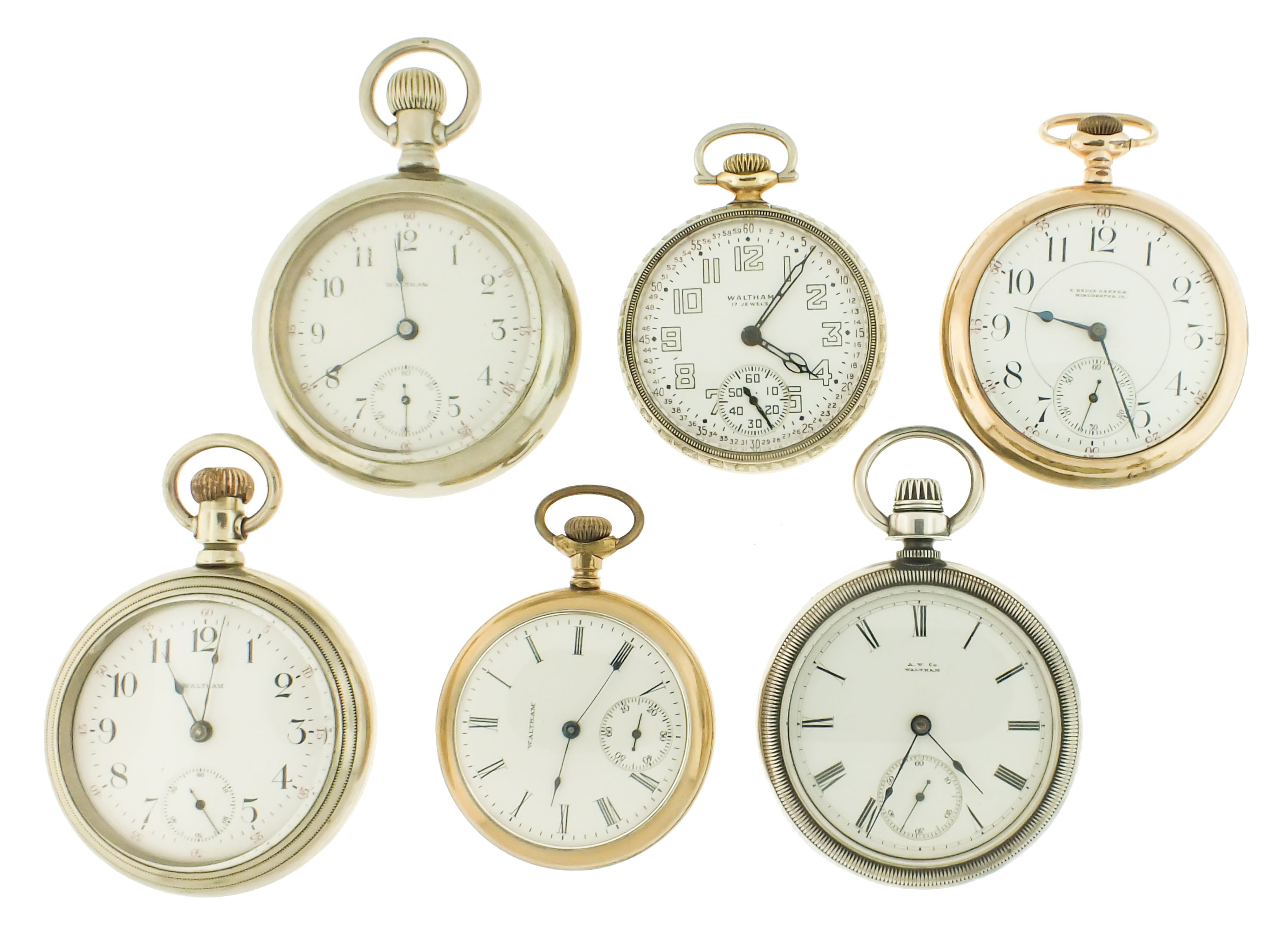Pocket watches- 6 (Six), all Waltham, 18- 16 size, 7- 21 jewel movements, roman and arabic numeral white enamel dials, silver, nickel, and gold filled open face cases