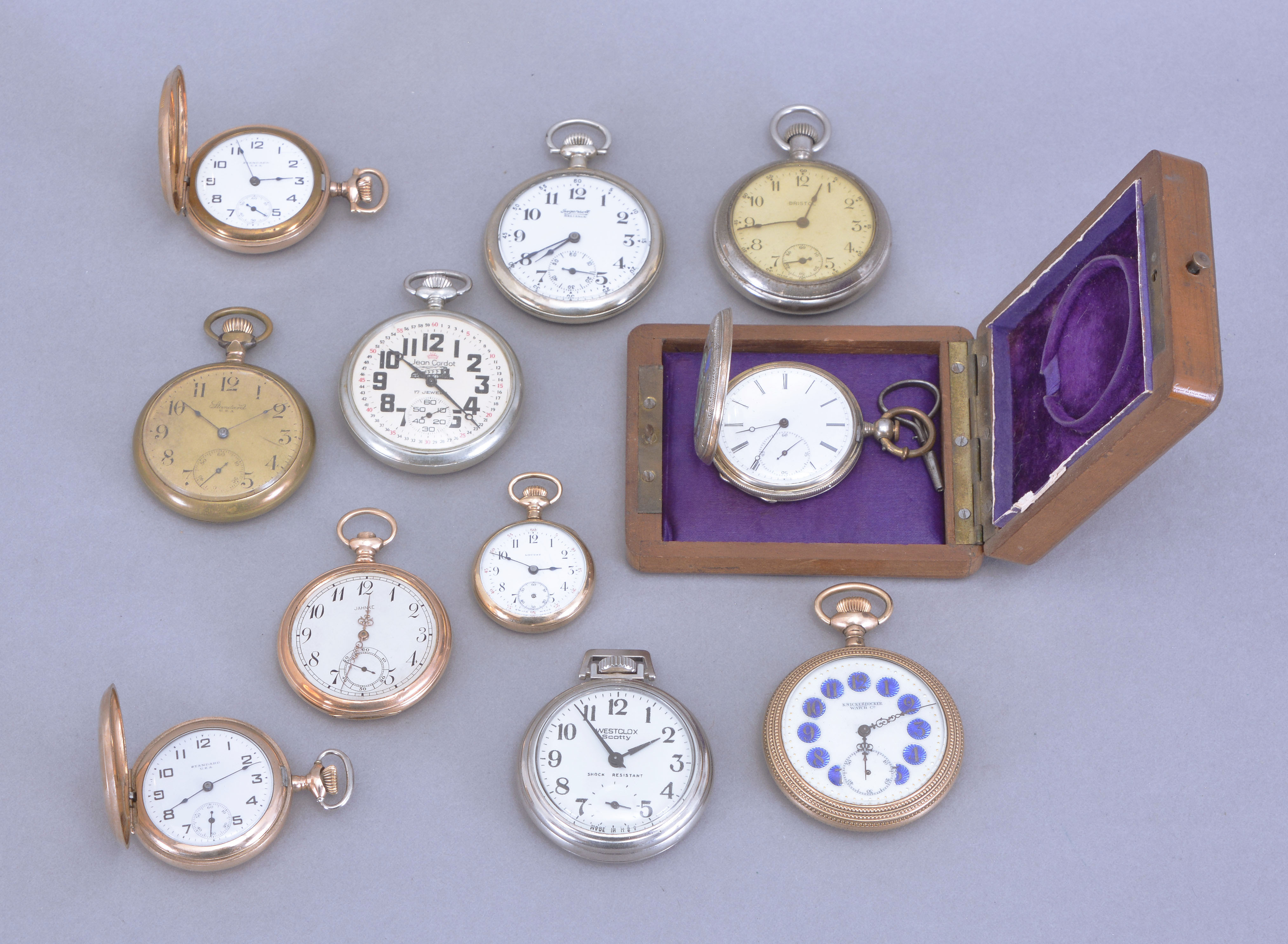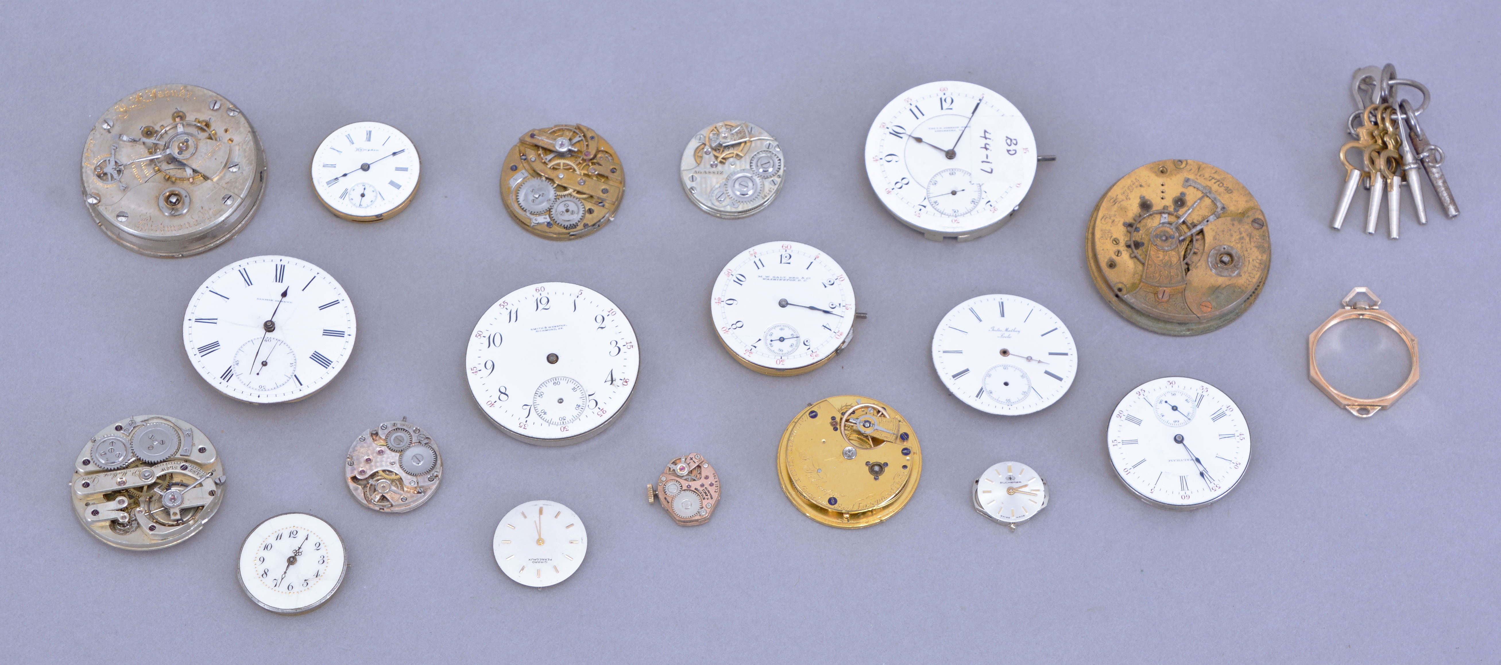 Pocket watches- 11 (Eleven), including a Swiss enamel decorated, key wound pocket watch with lever escapement and mahogany box, the rest are 16- 0 size stem wind, makers including New York Standard, Ingersoll, Jean Cardot, Knickerbocker, and others, together with 17 pocket and wrist watch watch movements, by Girard Perregaux, Elgin, Waltham, Mathey, Hampden, Illinois and others, and a small group of watch keys