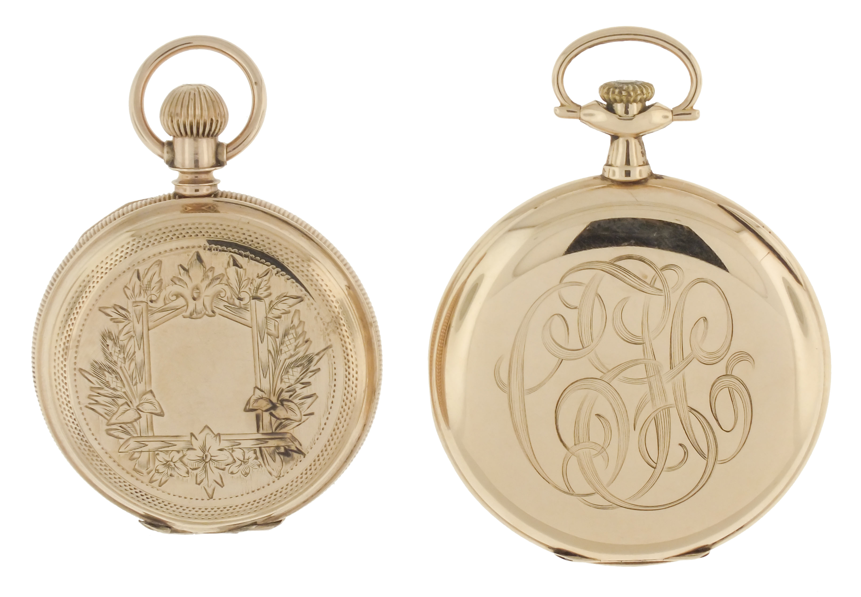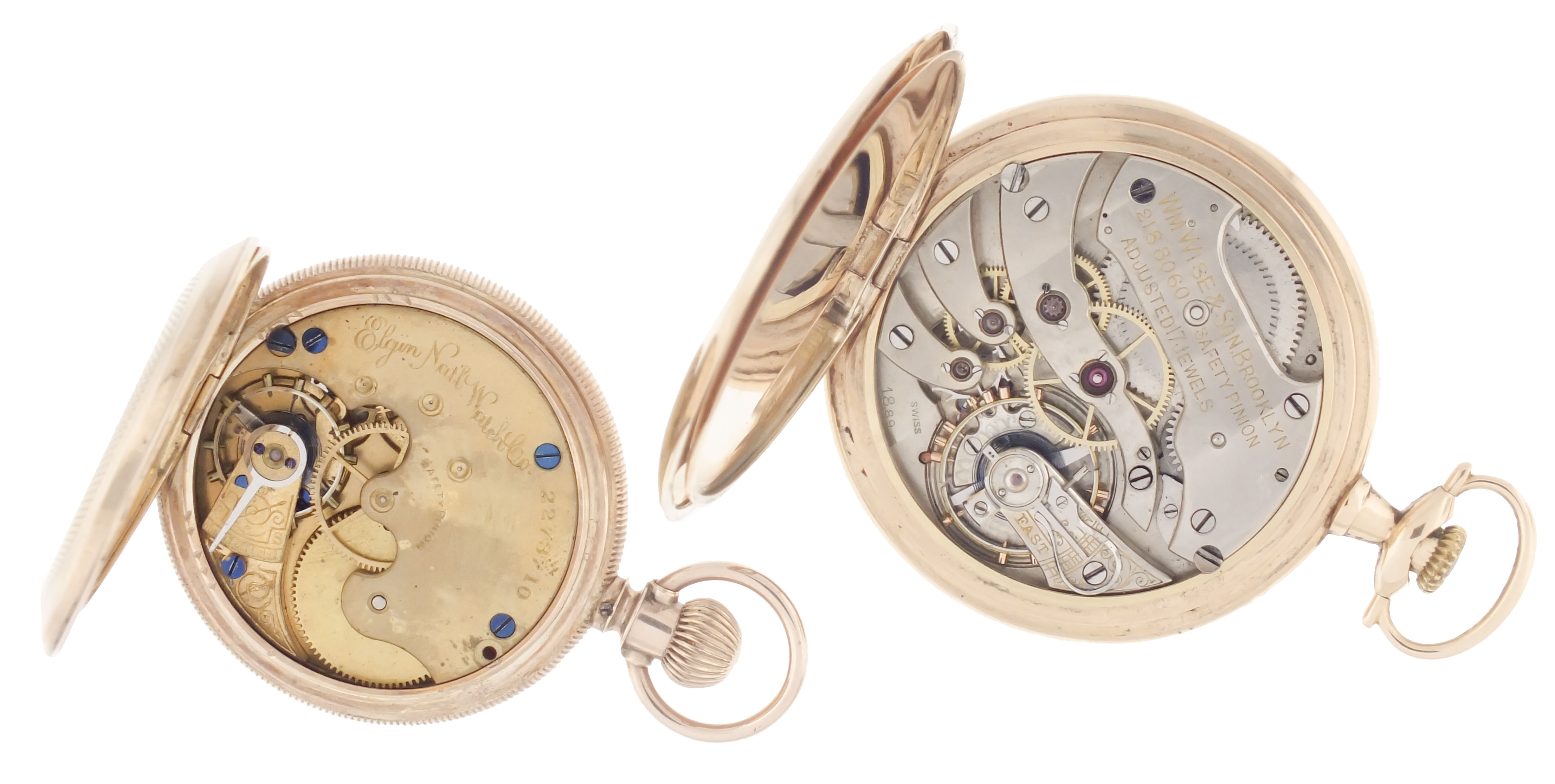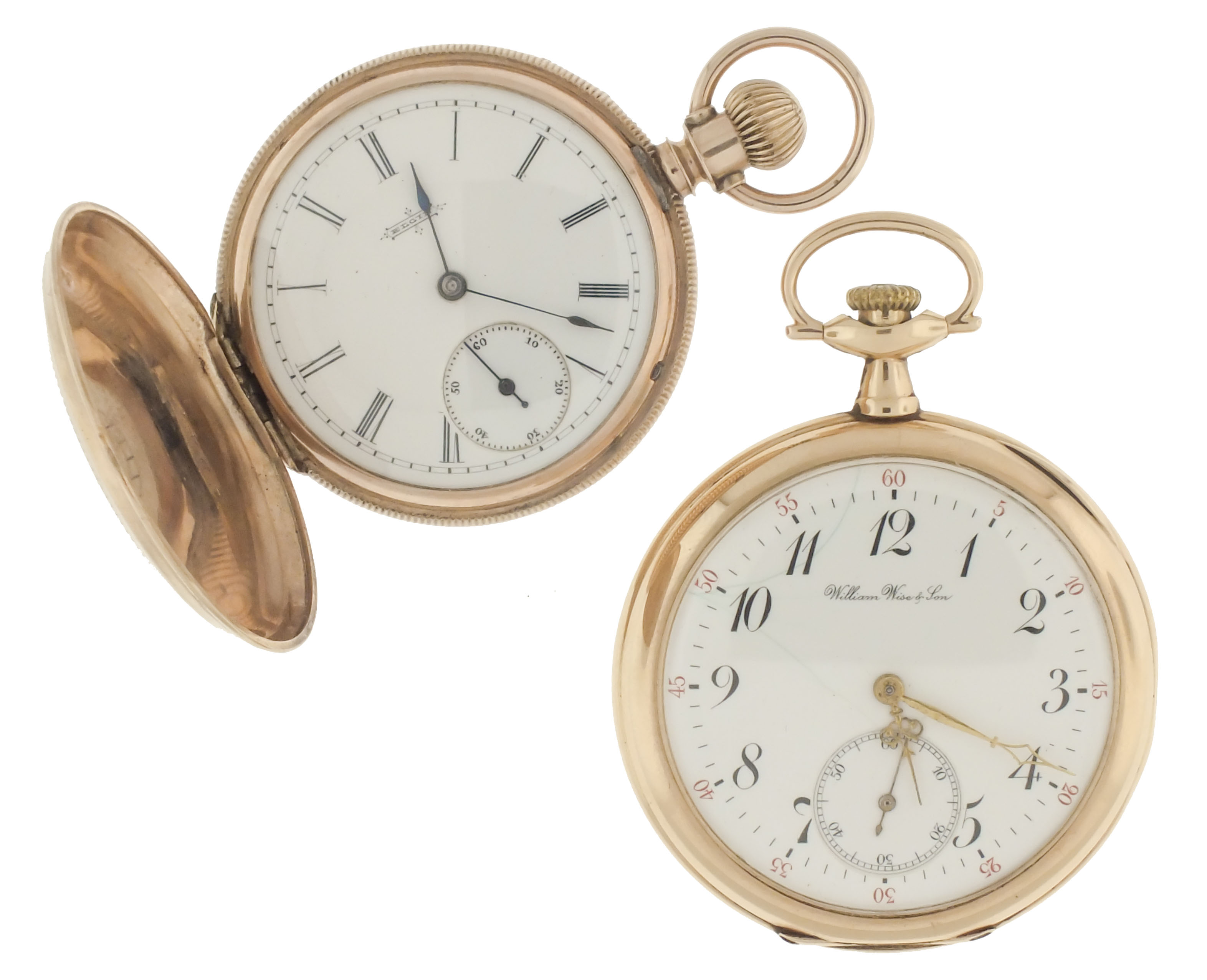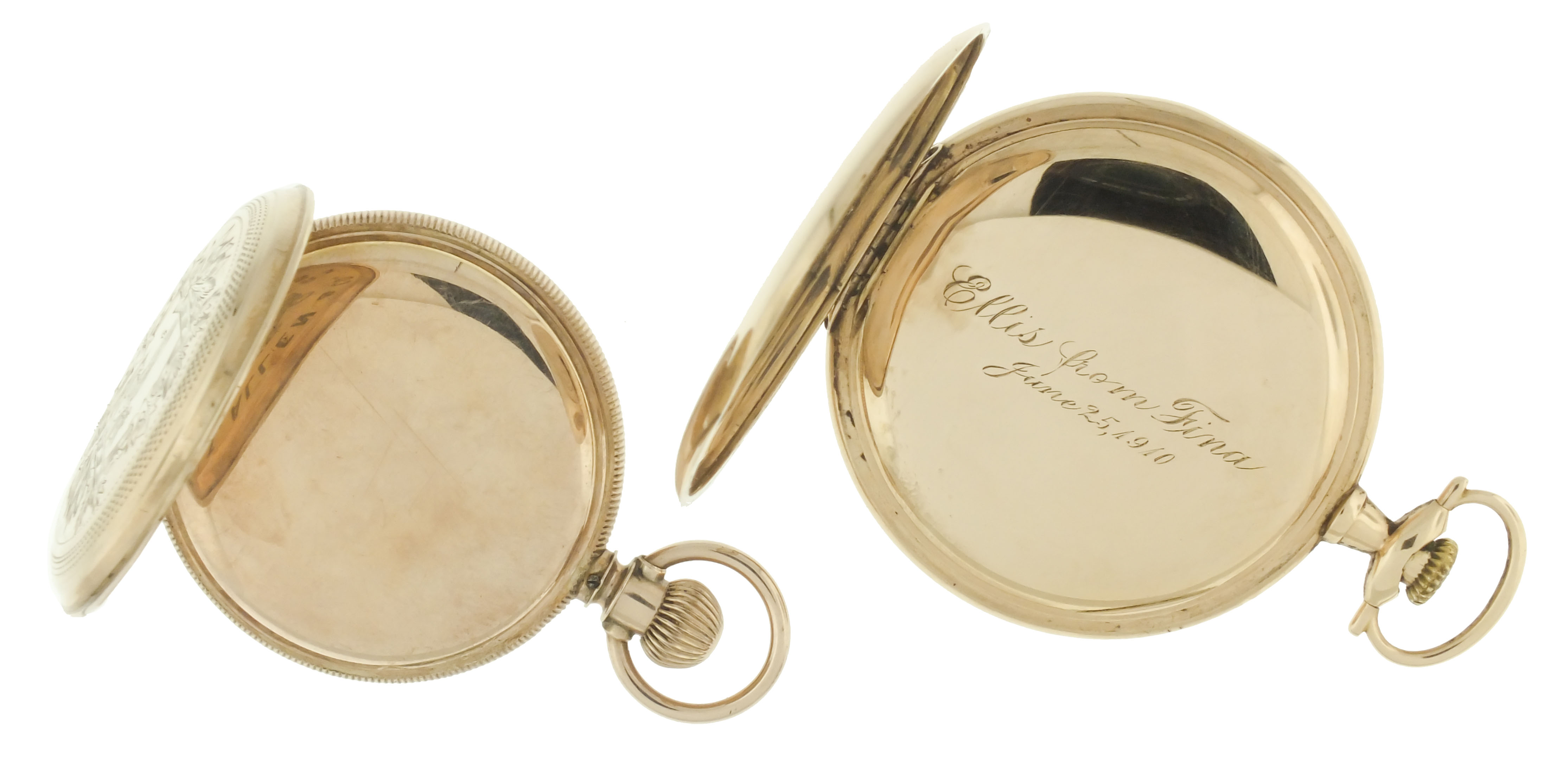 Pocket watches- 2 (Two), the first a 12 size Longines, 17 jewel nickel movement, arabic numeral white enamel dial, 14 karat yellow gold open face case, the other a 6 size Elgin, 7 jewel gilt movement, roman numeral white enamel dial, 8 karat yellow gold "Brooklyn Eagle" case, 14k, 61.2g TW, 8k, 52.1g TW