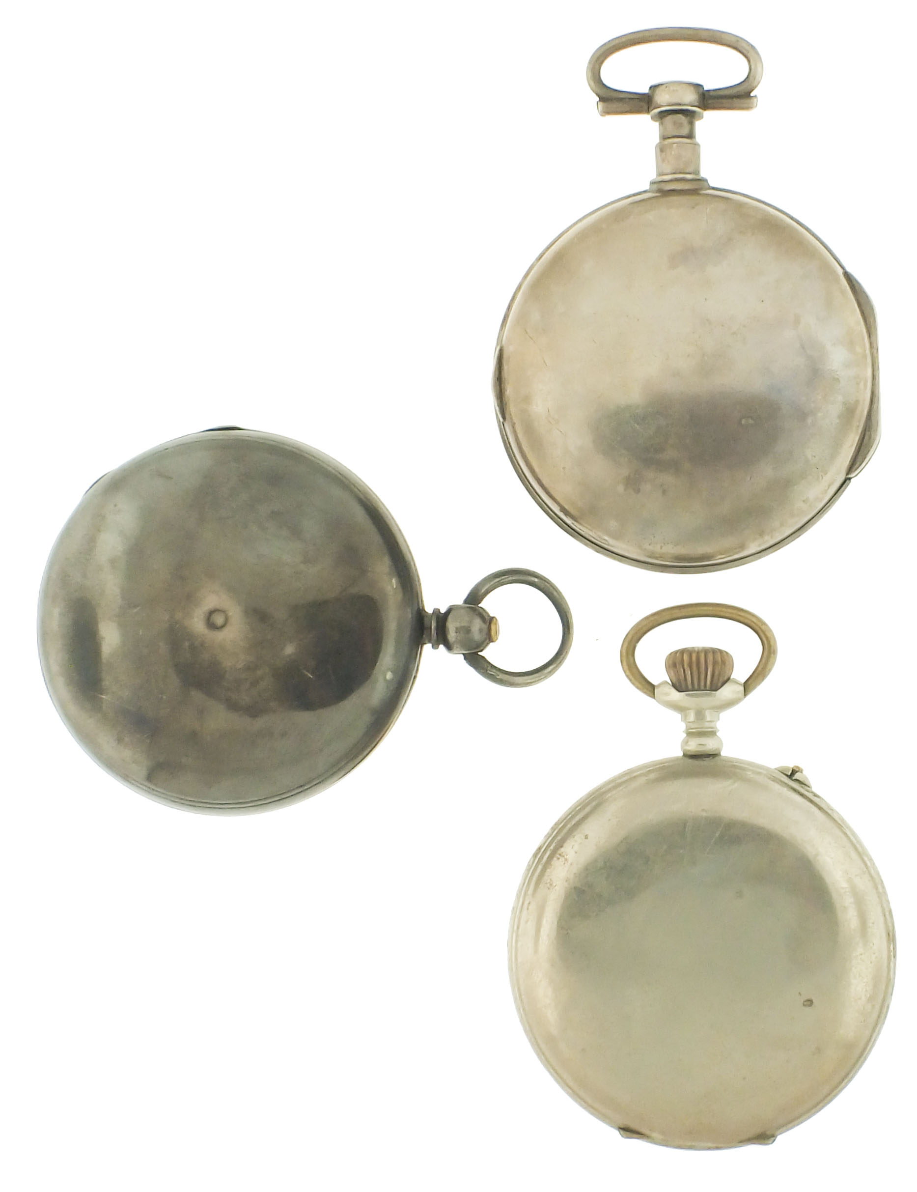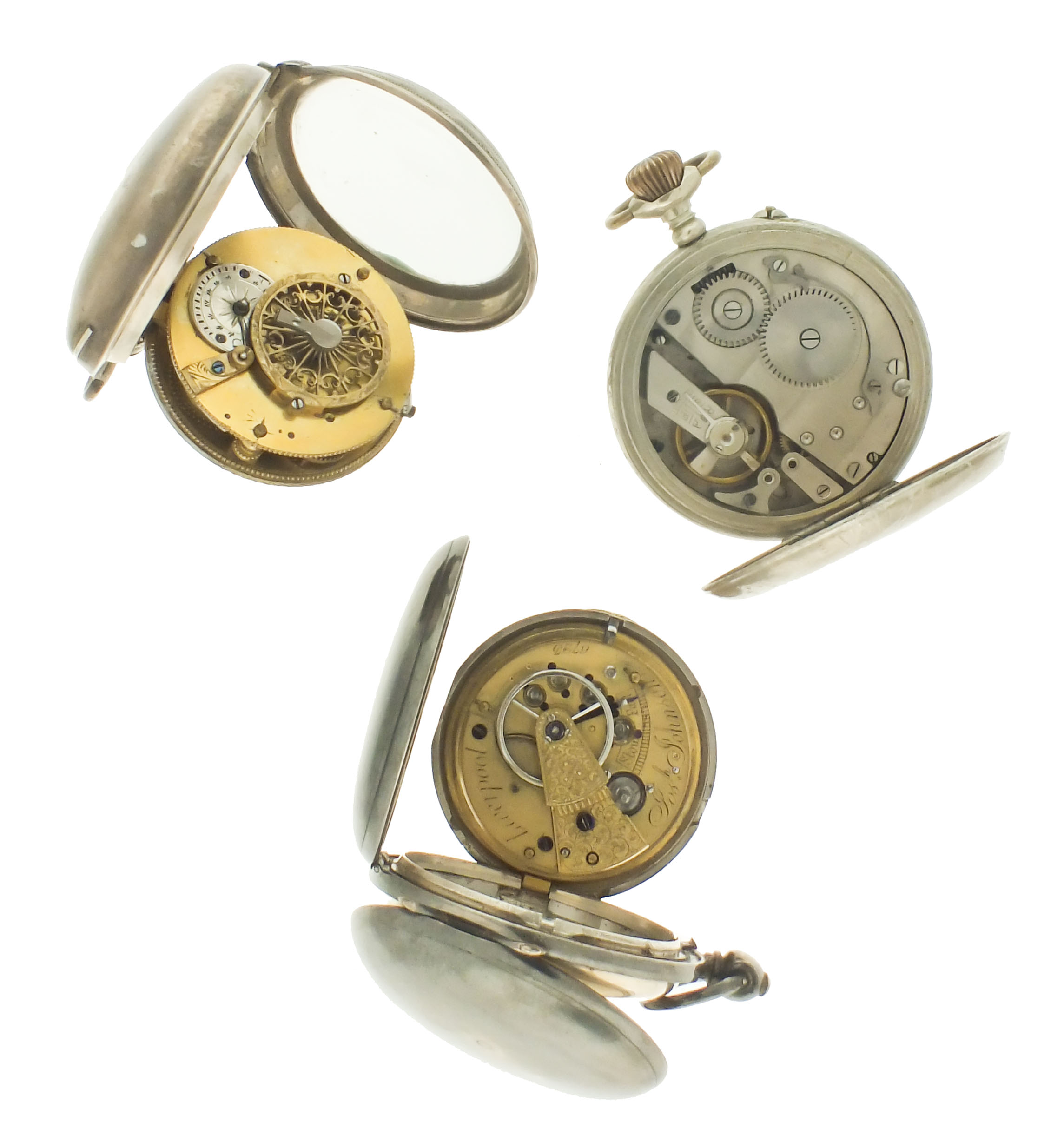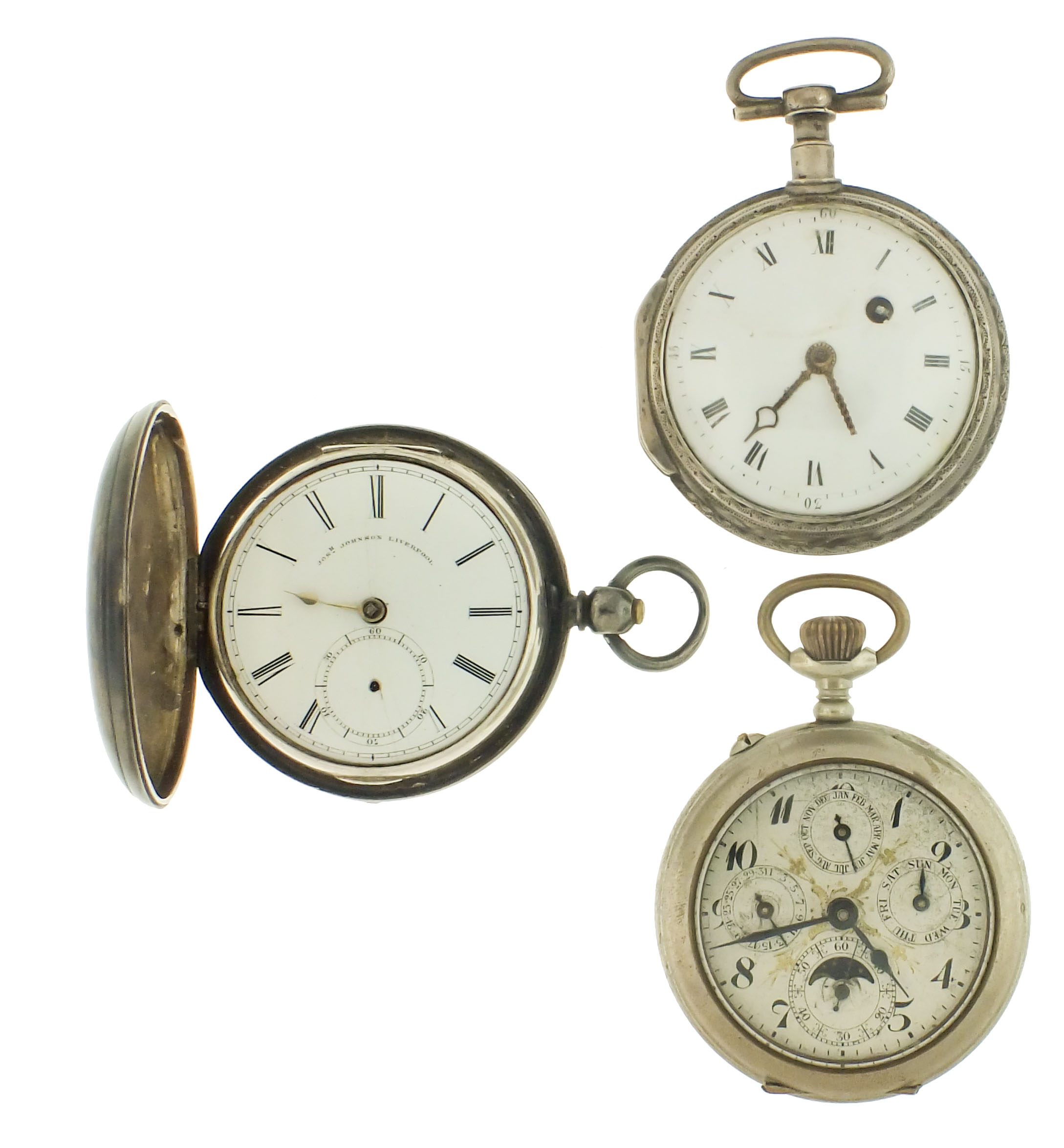Pocket watches- 3 (Three), the first a Continental verge fusee with gilt full plate movement, roman numeral white enamel dial, and silver consular case, c1830, the next a lever fusee by Joseph Johnson, 16- 17 jewel gilt full plate movement, roman numeral white enamel dial, sterling silver hunting case with London hallmark and date letter for the year 1856, and a Swiss triple calendar with moon phase display, jeweled nickel movement with lever escapement, arabic numeral silvered dial, and nickel open face case, c1900