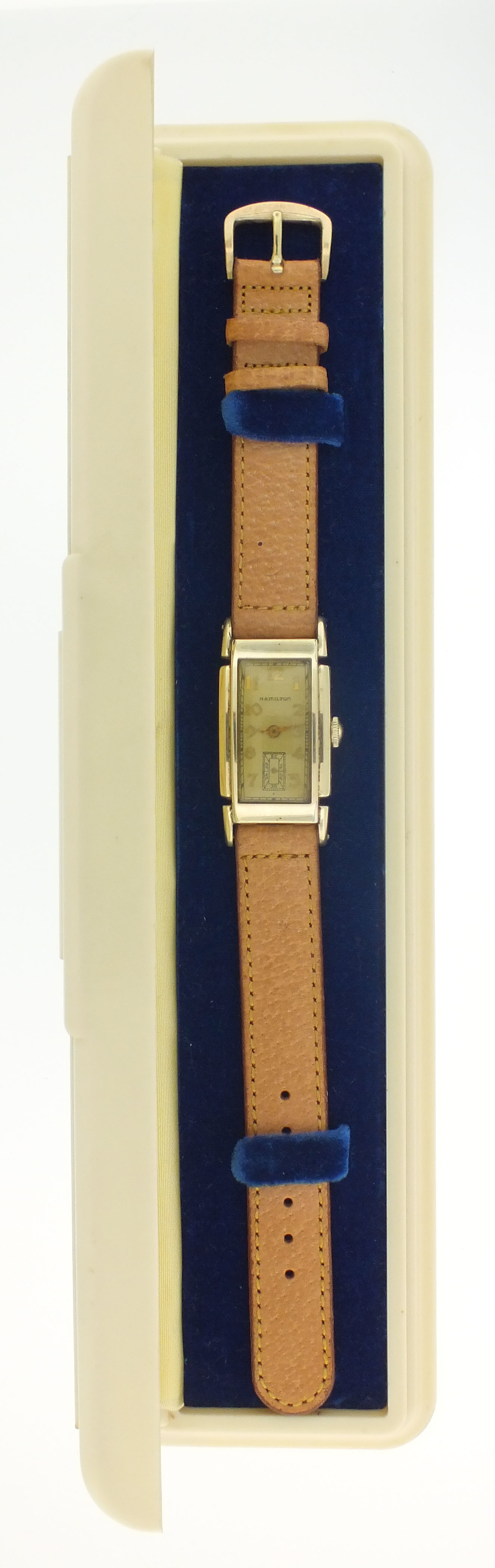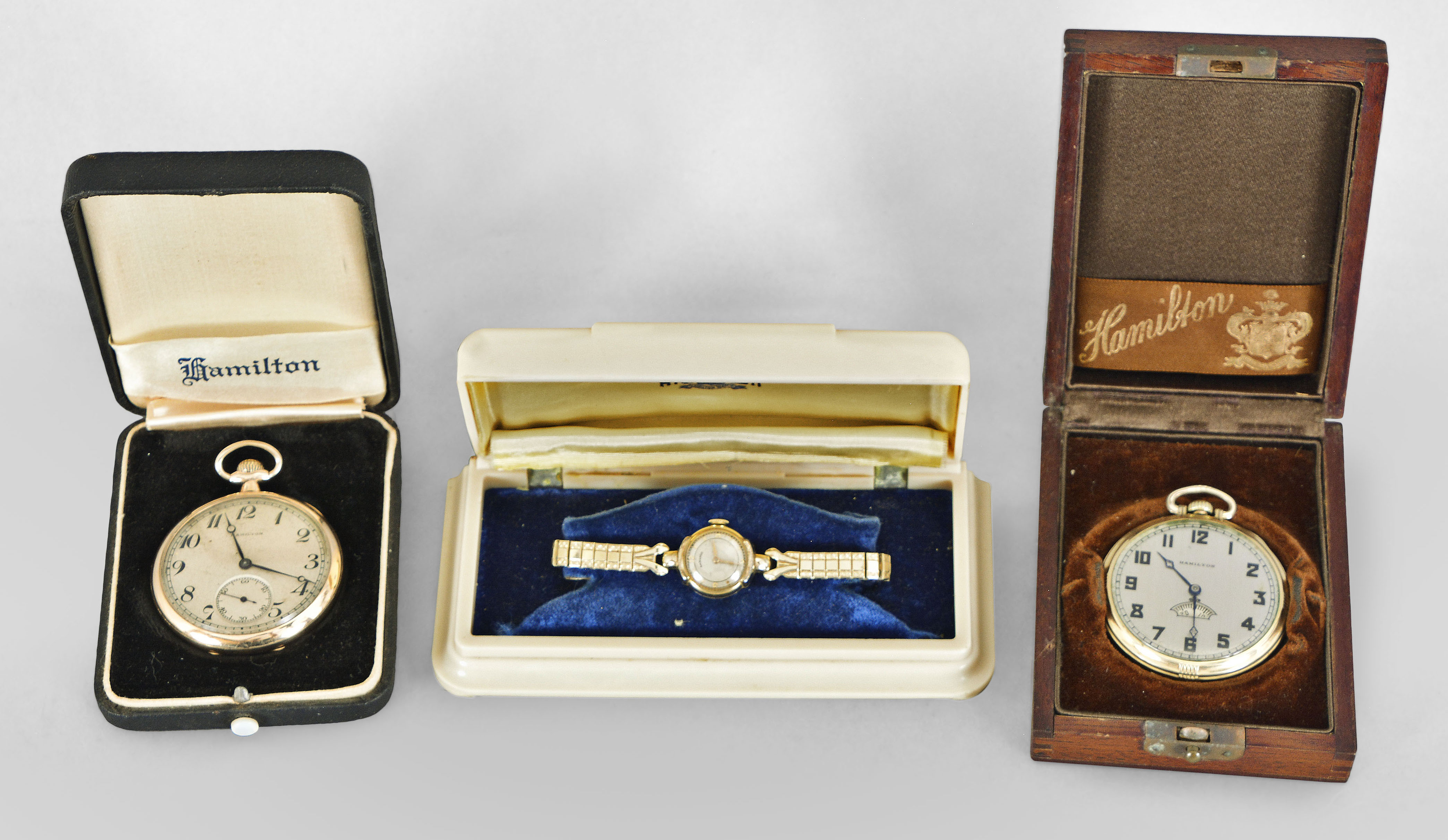 Wrist and pocket watches- 4 (Four), all Hamilton and in Hamilton boxes, the first a 12 size "912", 17 jewel nickel movement, arabic numeral silvered dial with rotating seconds disc above 6:00, blued steel hands, and gold filled open face case, serial #3397949, the next a 12 size "900", 19 jewel damascened nickel movement, arabic numeral silvered dial, plum colored Breguet style hands, and gold filled open face case, serial #1910821, the third a lady's wrist watch with 17 jewel 911 movement, dot and arabic numeral metal dial, and gold filled case with stretch band, serial #T350744, and the last a "Dickens", 17 jewel 980 movement, arabic numeral silvered dial, gold filled case, serial #G217558
