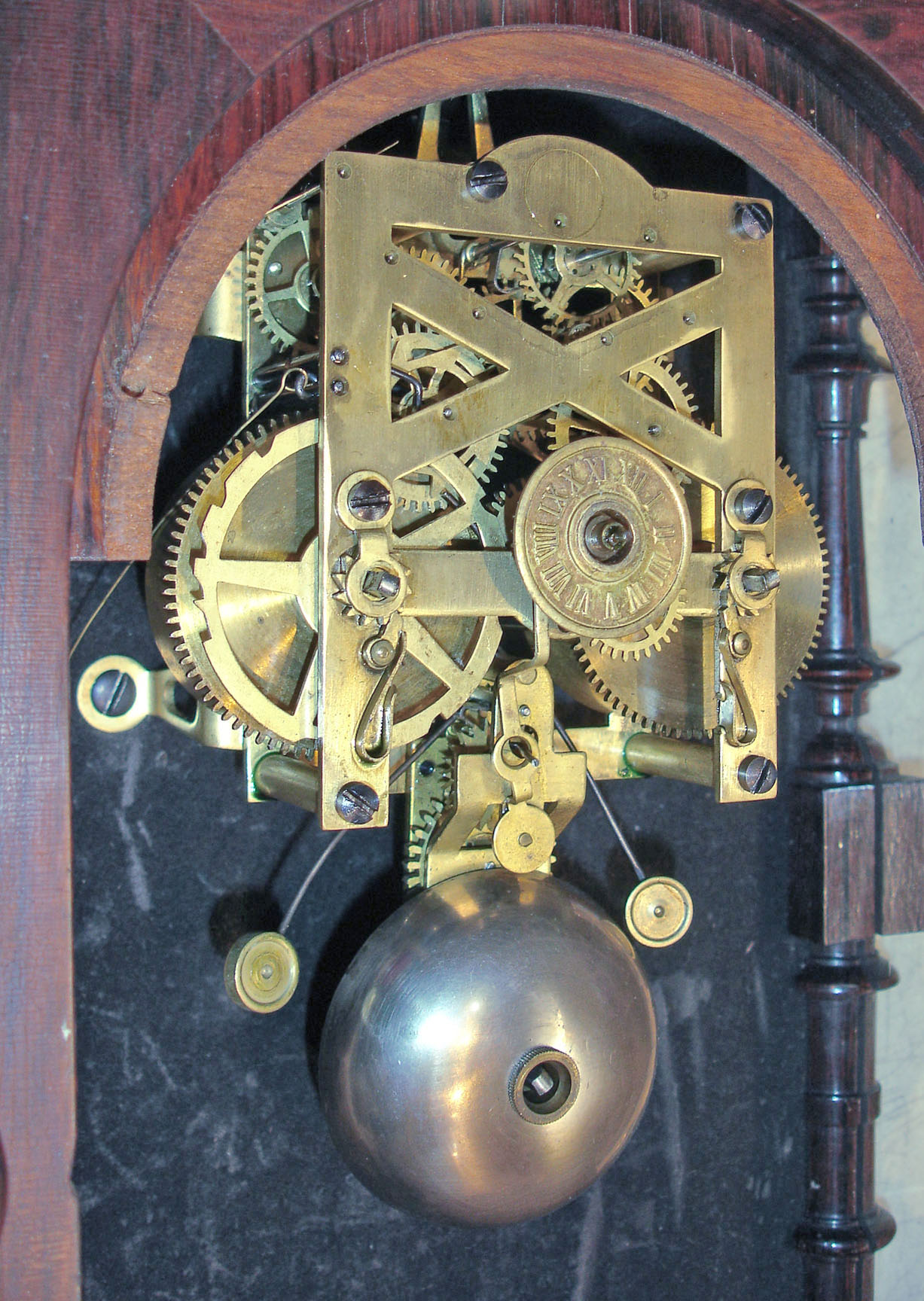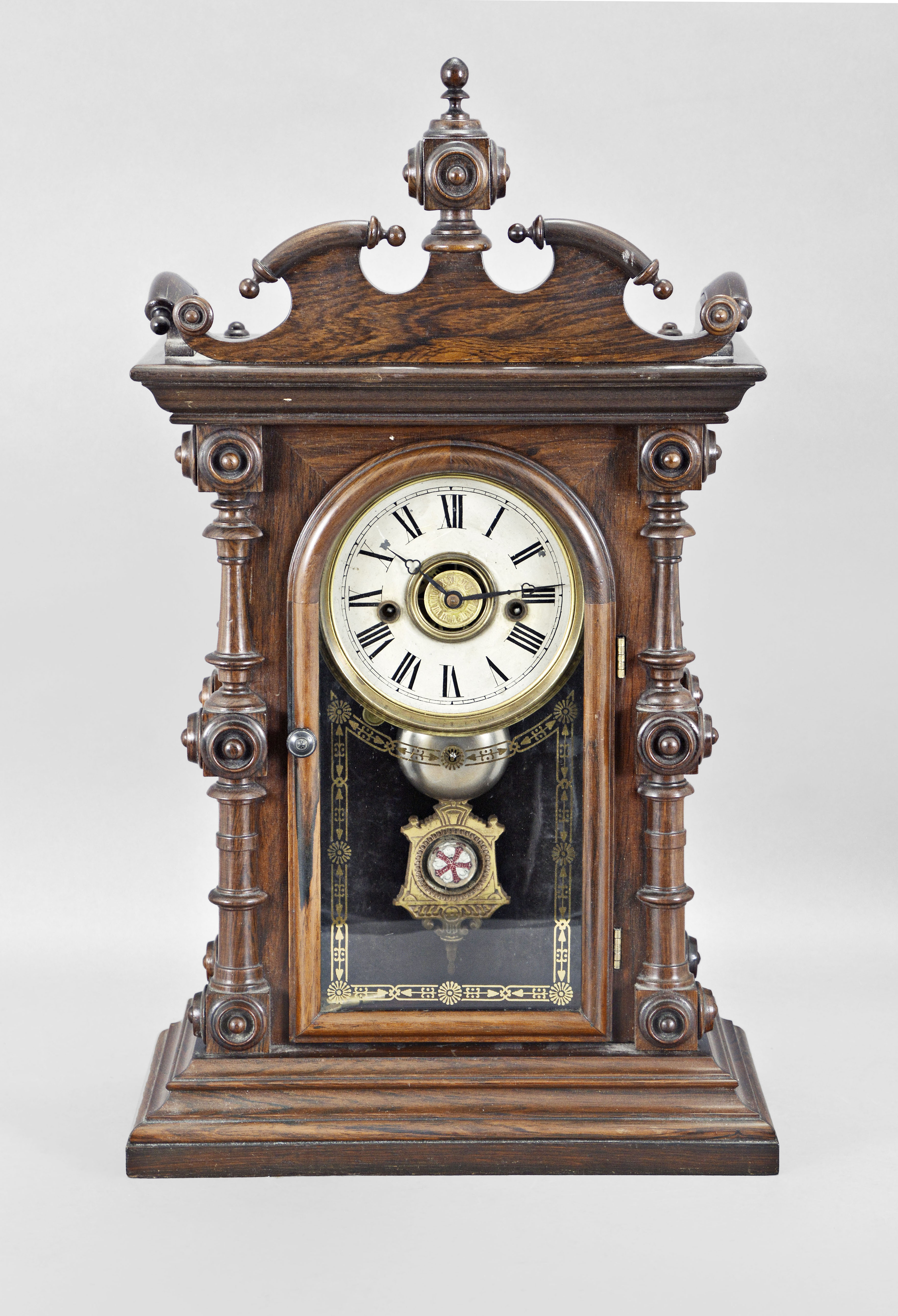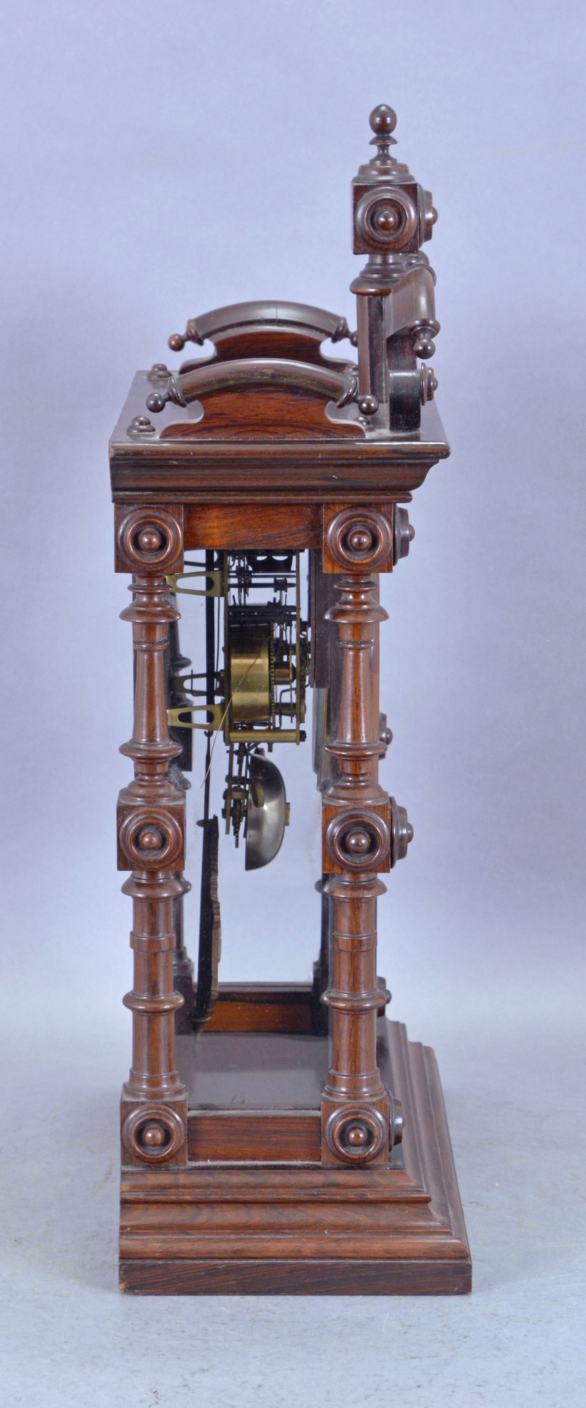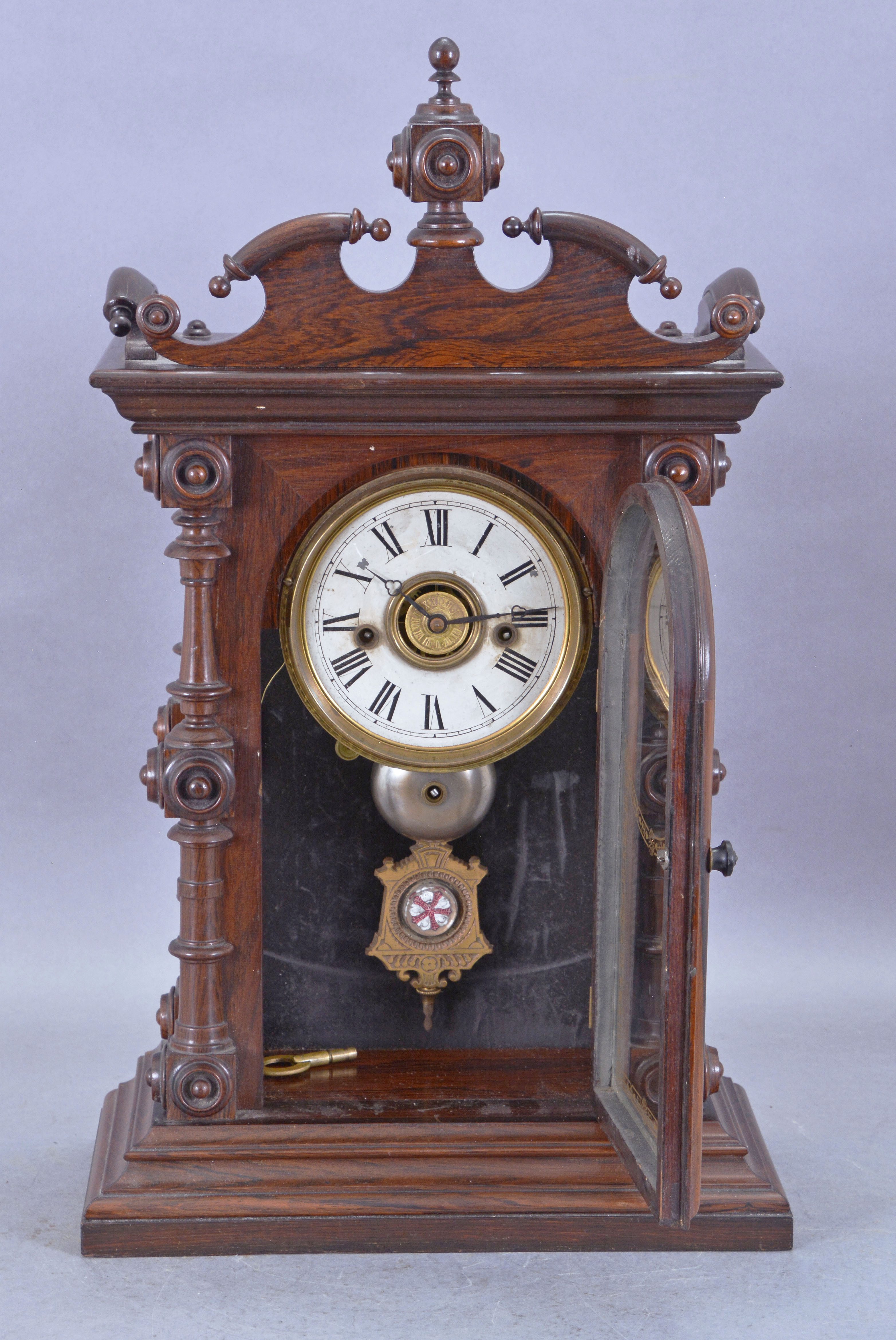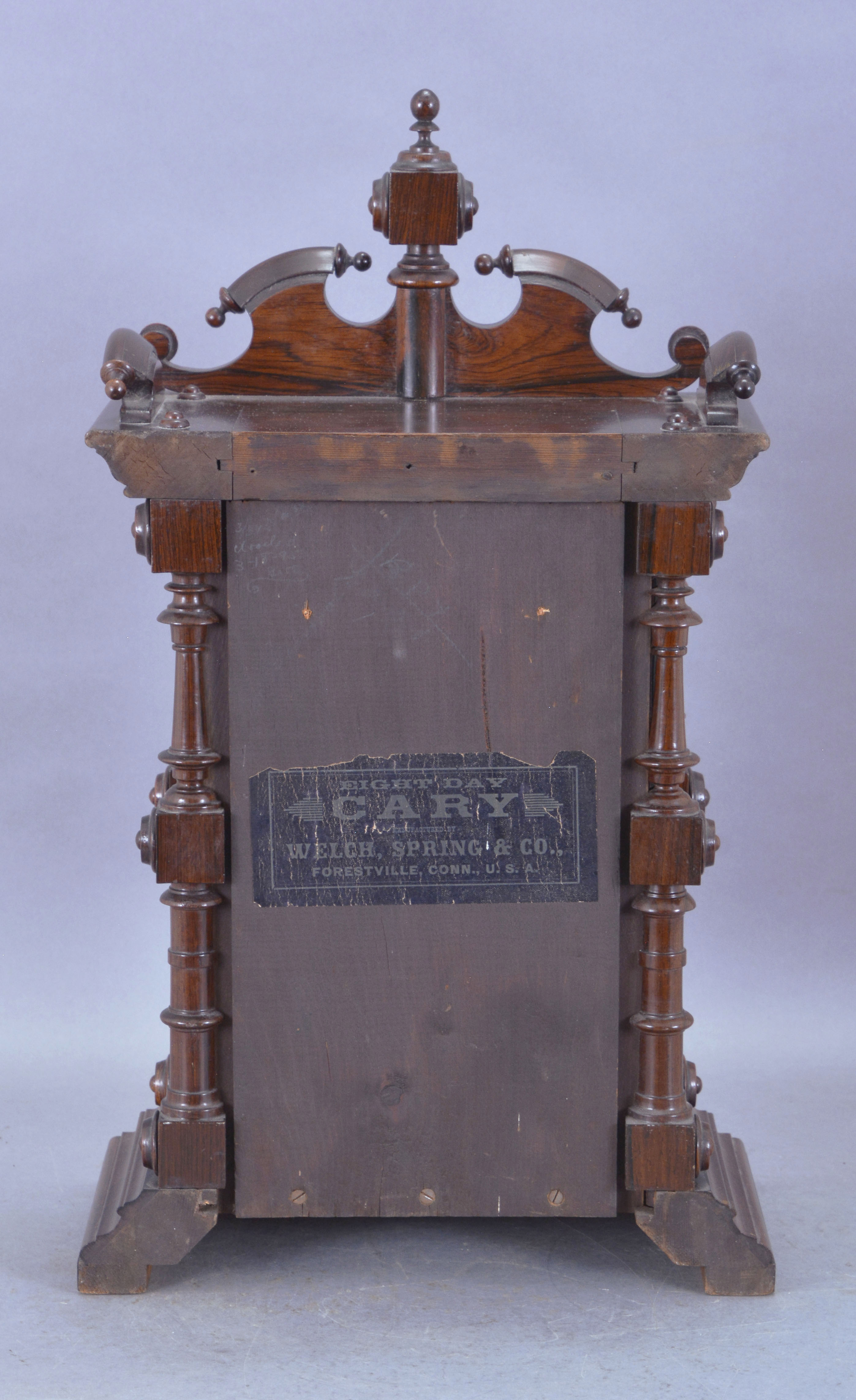 Welch, Spring & Co., Forestville, Conn., "Cary V.P." shelf clock with a spring driven 8 day time, strike and alarm brass Patti movement in a rosewood and rosewood veneered case.