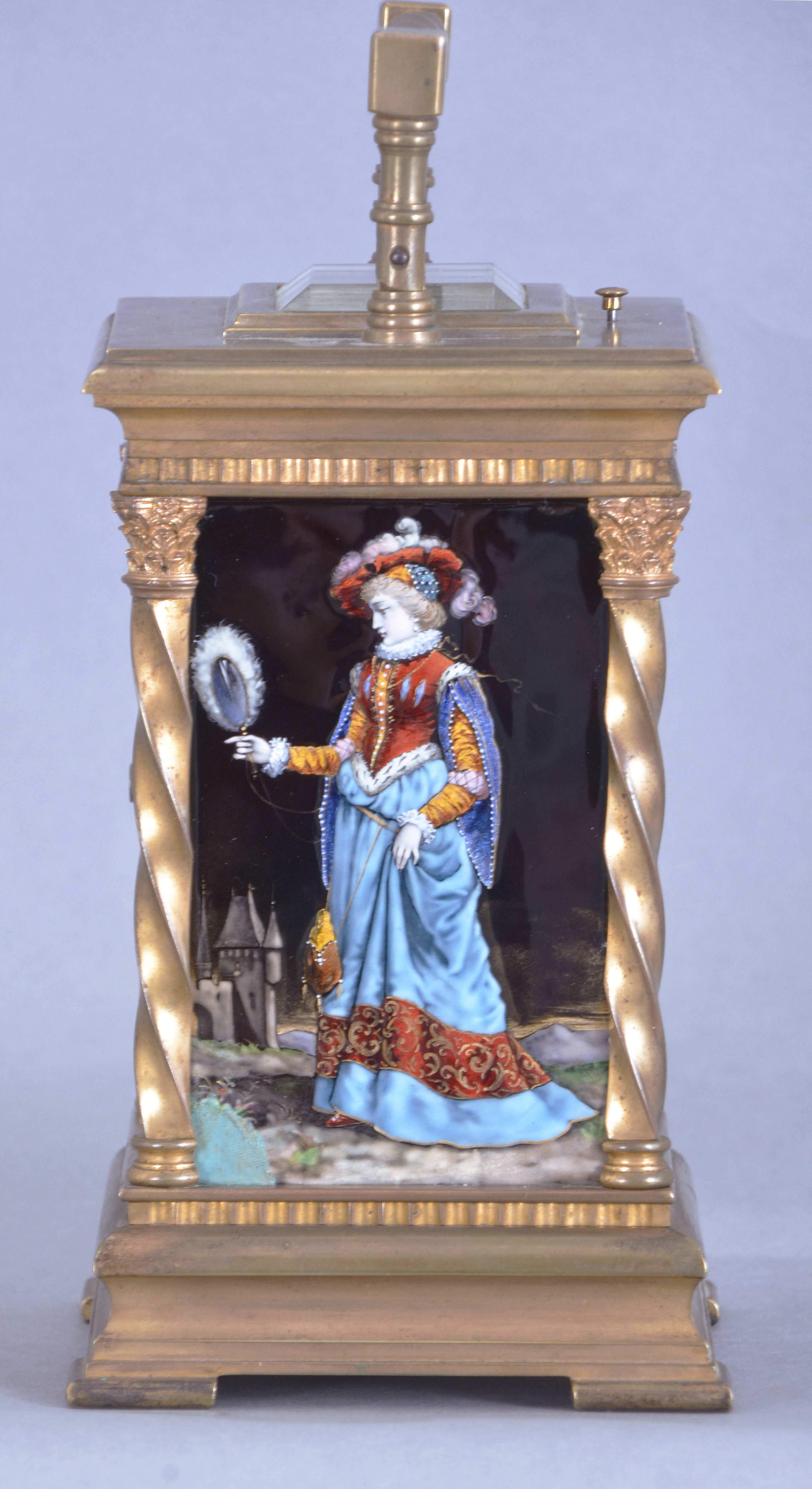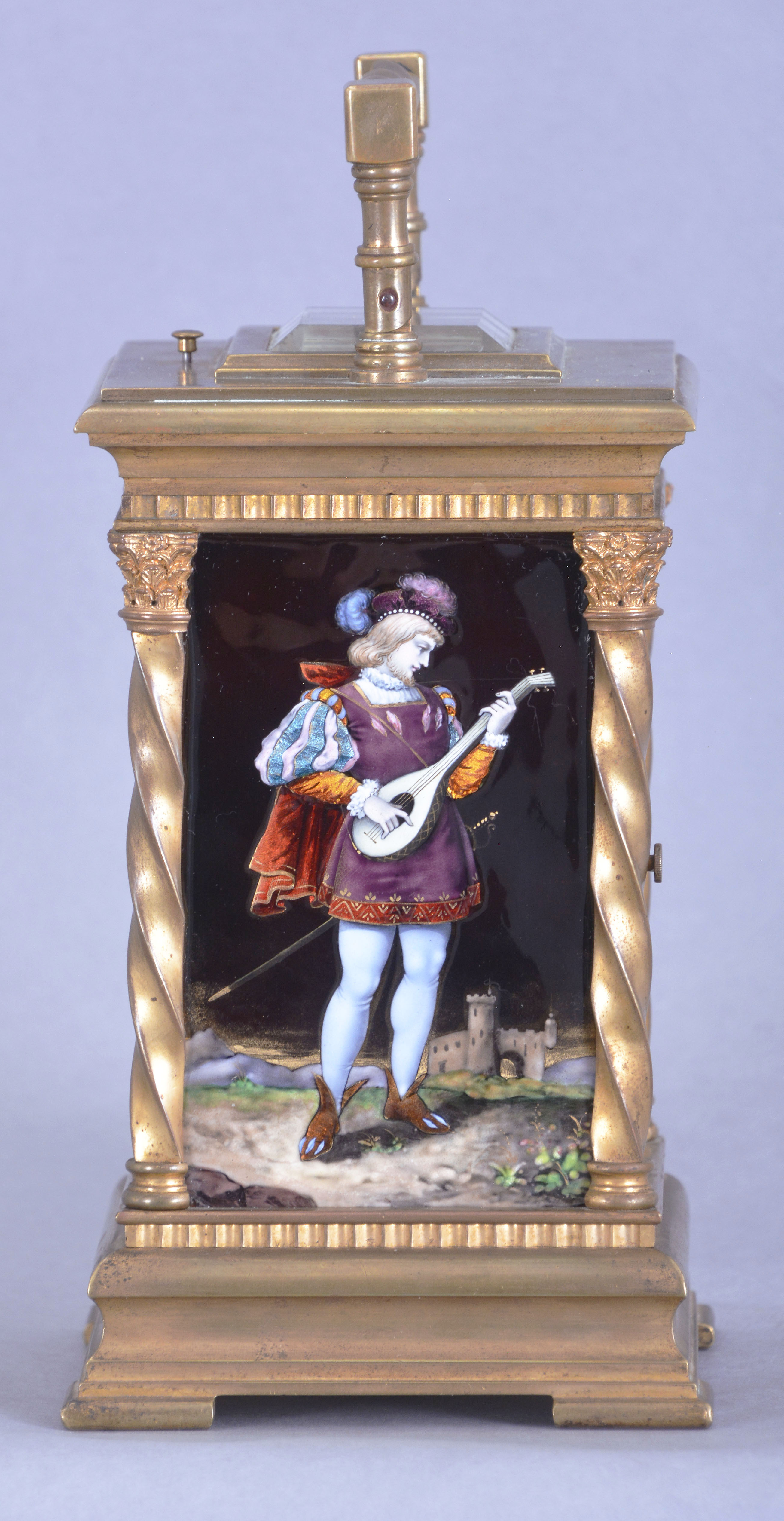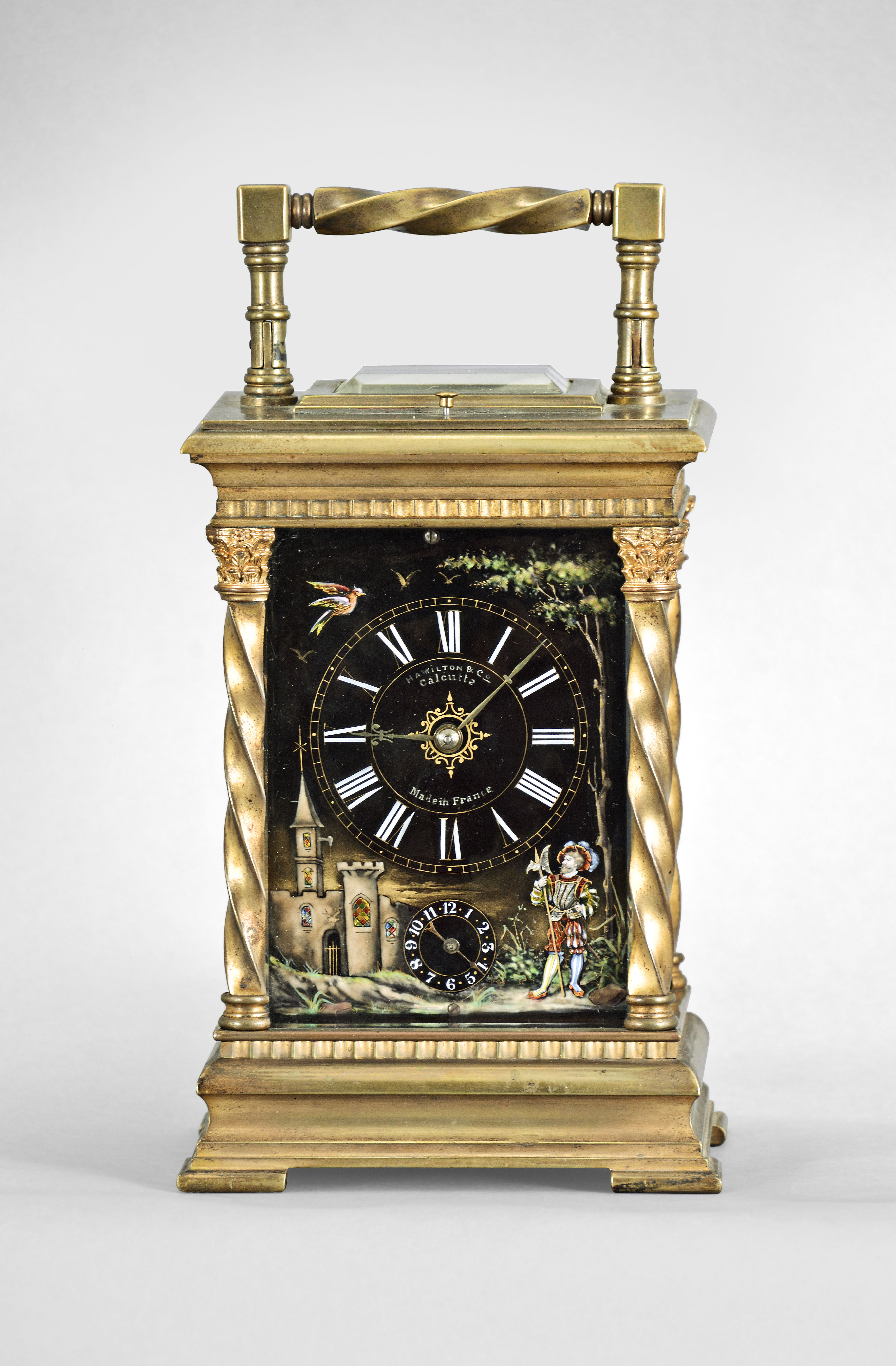 France, for Hamilton & Co., Calcutta, an exceptional hour repeating carriage clock with Limoges panels and dial, the Anglaise variant case with molded base below a fluted band, the corners with twisted columns having Corinthian capitals, and supporting a molded top with twisted carrying handle and thick bevelled glass, the case sides with polychrome opaque and transparent enamel scenes on a dark plum colored ground, featuring a young woman on the left, and a young man on the right, both in Elizabethan costume, in landscapes with castle in the background, the roman numeral dial also with landscape, castle, male figure and bird, the colored transparent enamels applied over colored foils, adding depth to the compositions, 8 day, three train movement with lever platform and cut bimetallic balance, sounding the hours and half hour on a gong, and repeating the last hour on demand