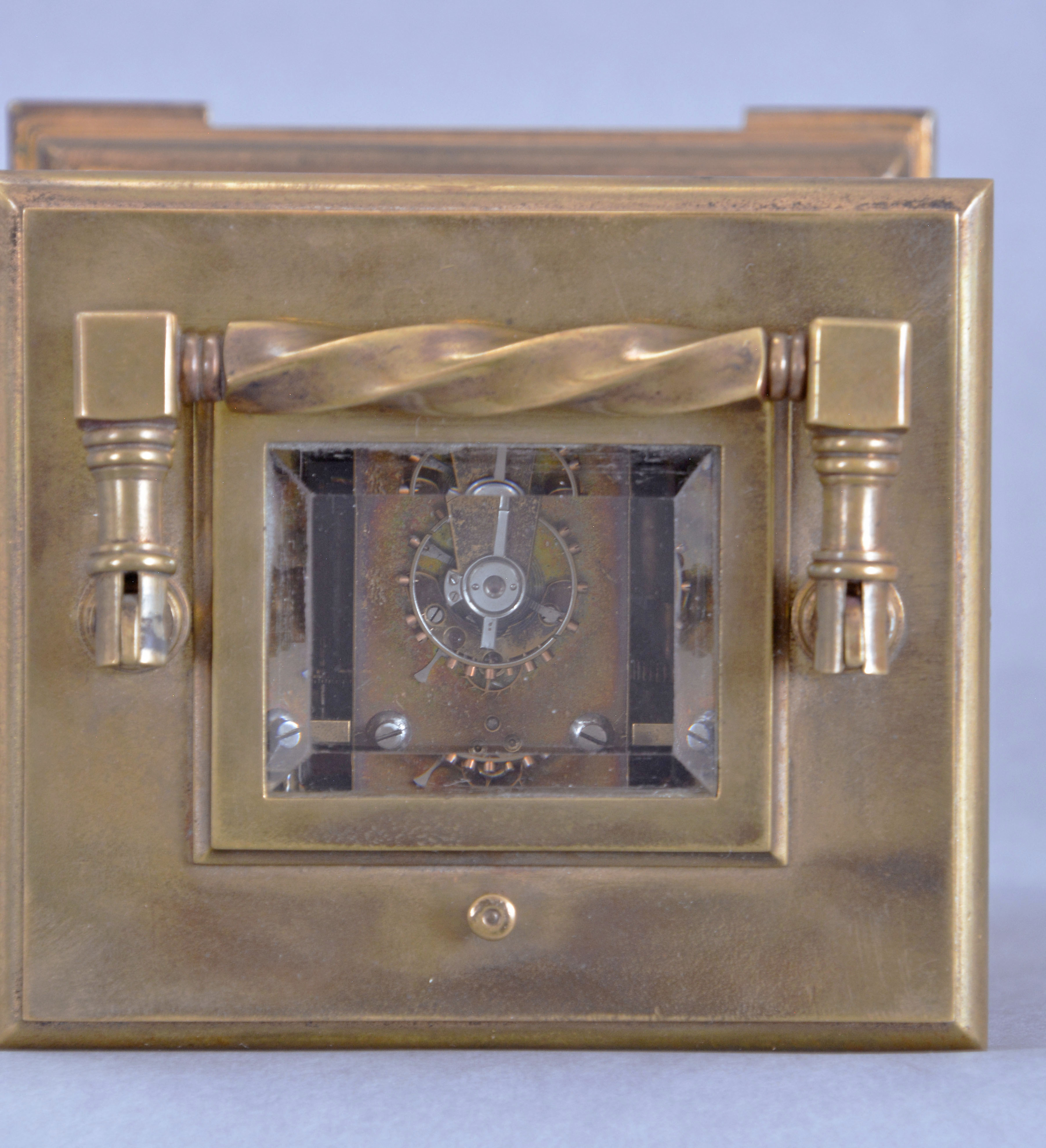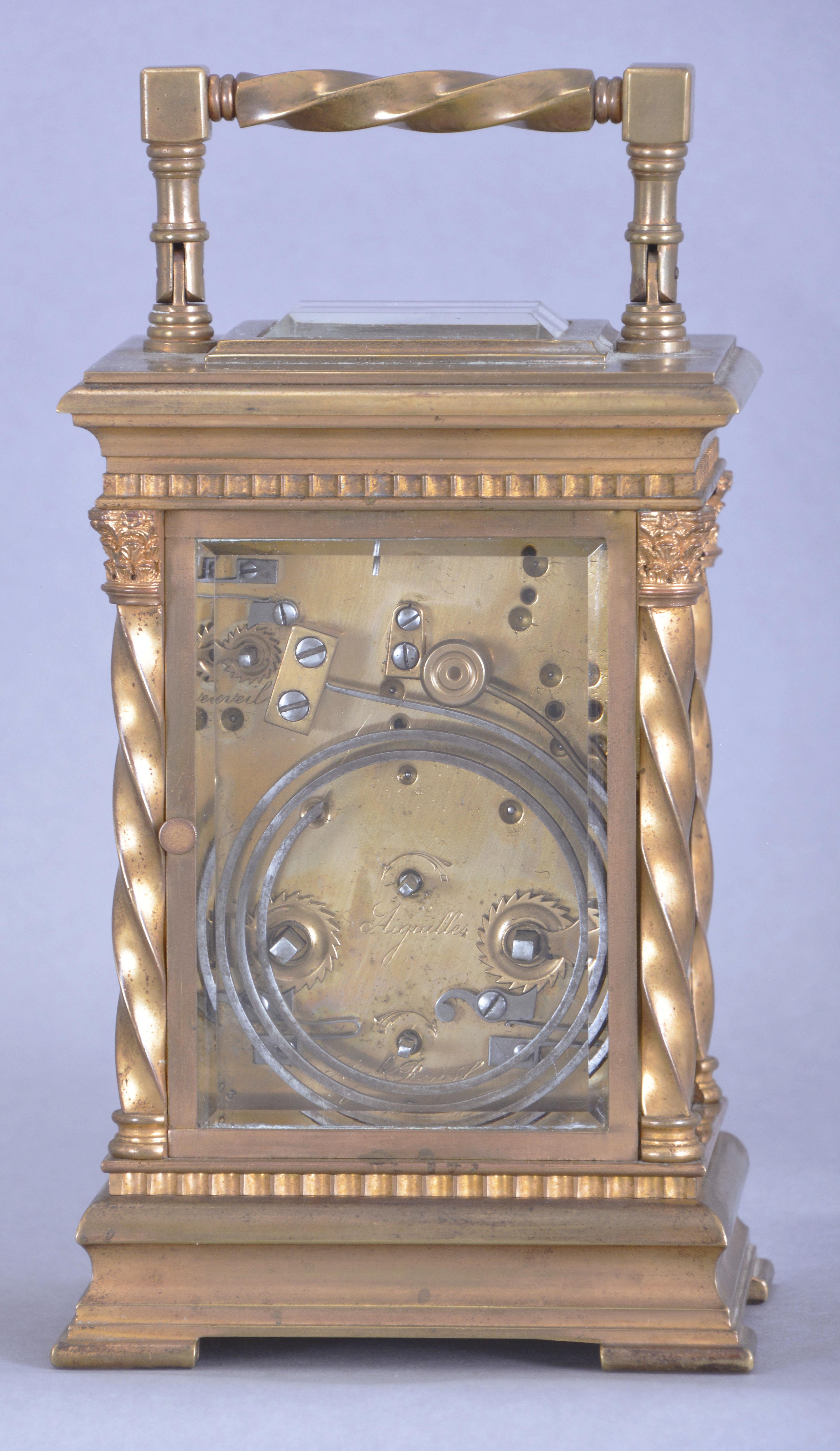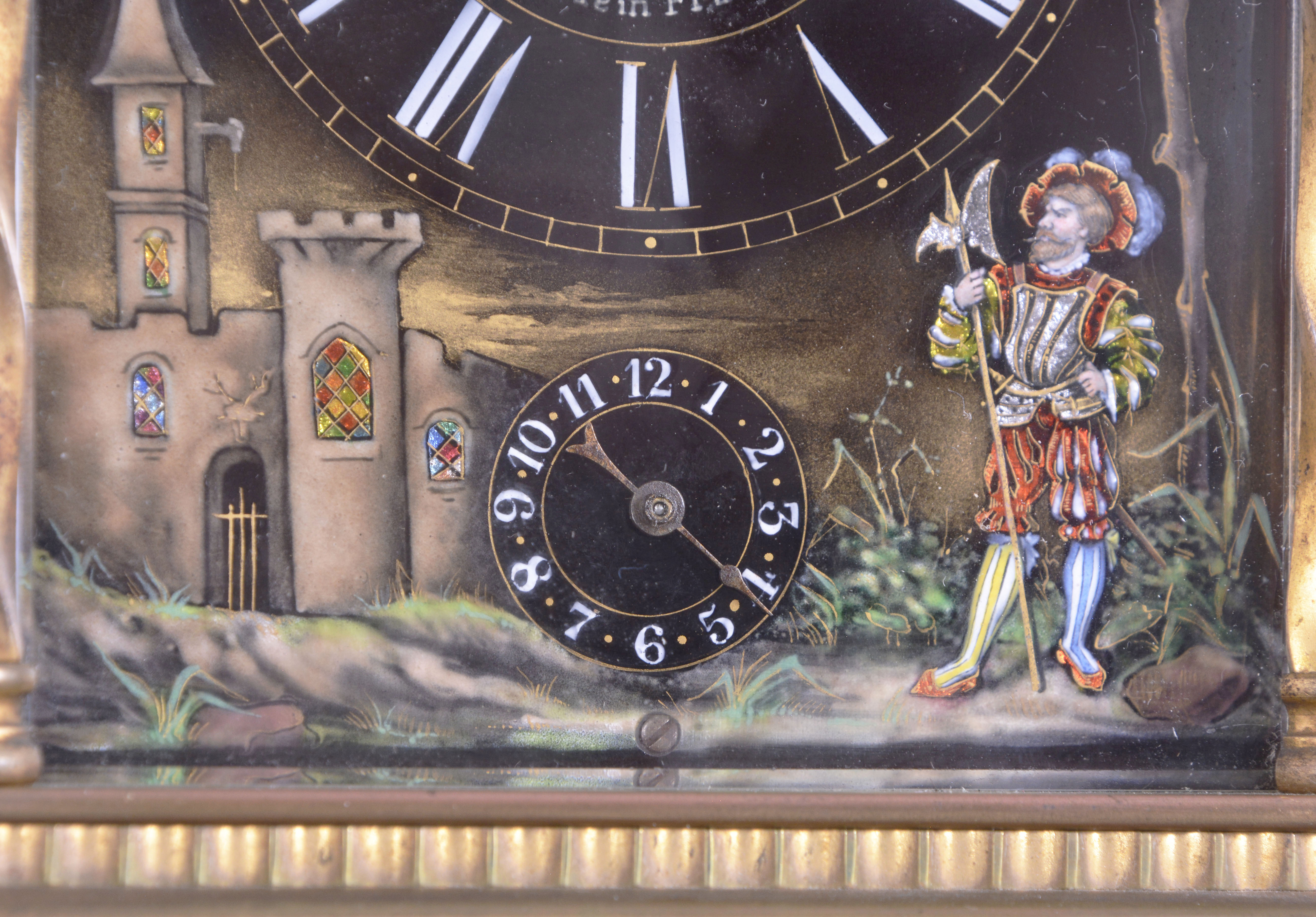 France, for Hamilton & Co., Calcutta, an exceptional hour repeating carriage clock with Limoges panels and dial, the Anglaise variant case with molded base below a fluted band, the corners with twisted columns having Corinthian capitals, and supporting a molded top with twisted carrying handle and thick bevelled glass, the case sides with polychrome opaque and transparent enamel scenes on a dark plum colored ground, featuring a young woman on the left, and a young man on the right, both in Elizabethan costume, in landscapes with castle in the background, the roman numeral dial also with landscape, castle, male figure and bird, the colored transparent enamels applied over colored foils, adding depth to the compositions, 8 day, three train movement with lever platform and cut bimetallic balance, sounding the hours and half hour on a gong, and repeating the last hour on demand