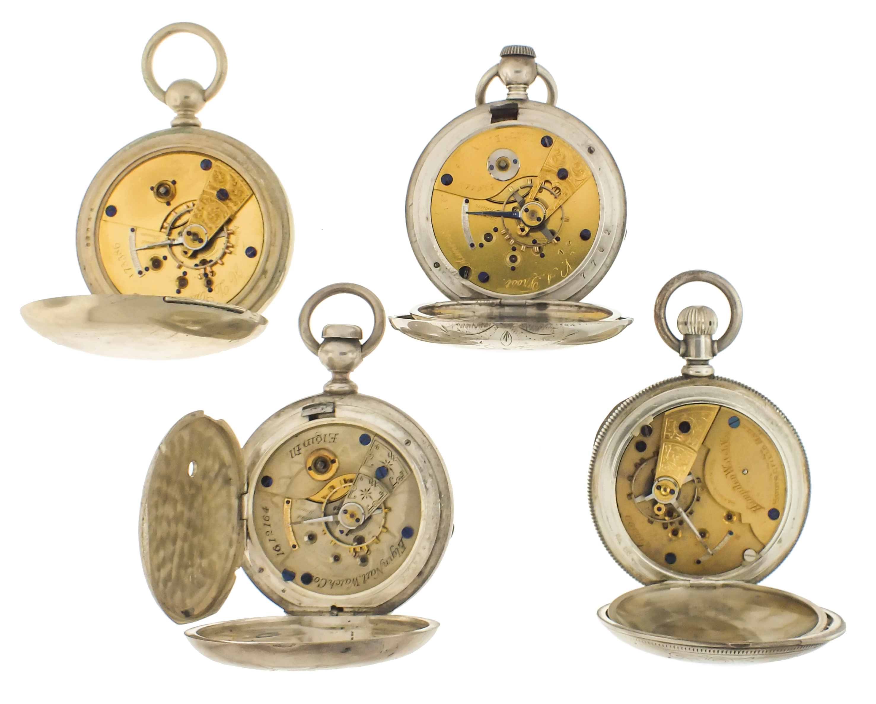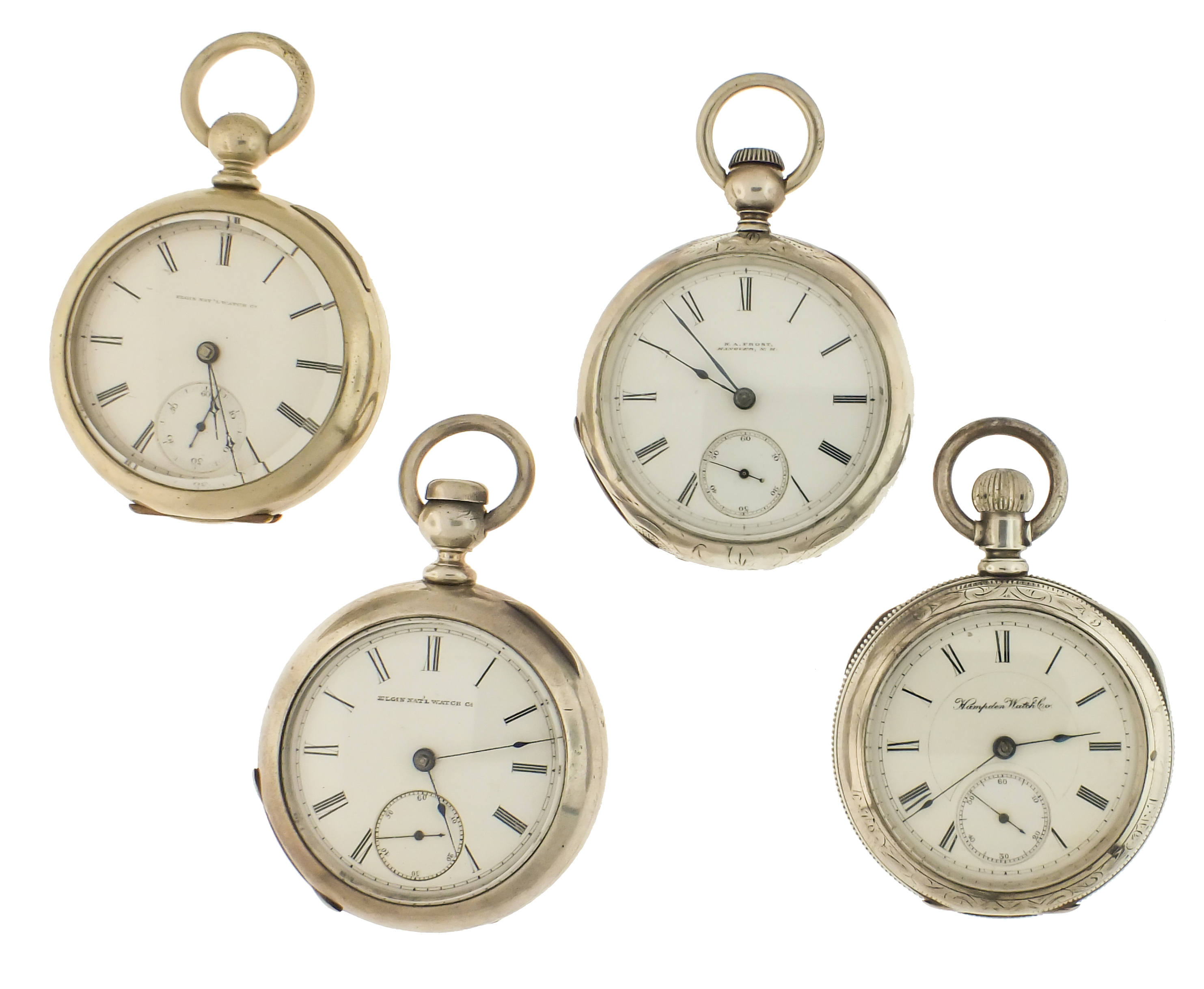 Pocket watches- 7 (Seven), all 18 size, makers including Elgin, Seth Thomas, Hamilton, and Hampden, key and stem wound, 11- 21 jewel movements, arabic and roman numeral white enamel dials, silver, gold filled, and nickel open face cases