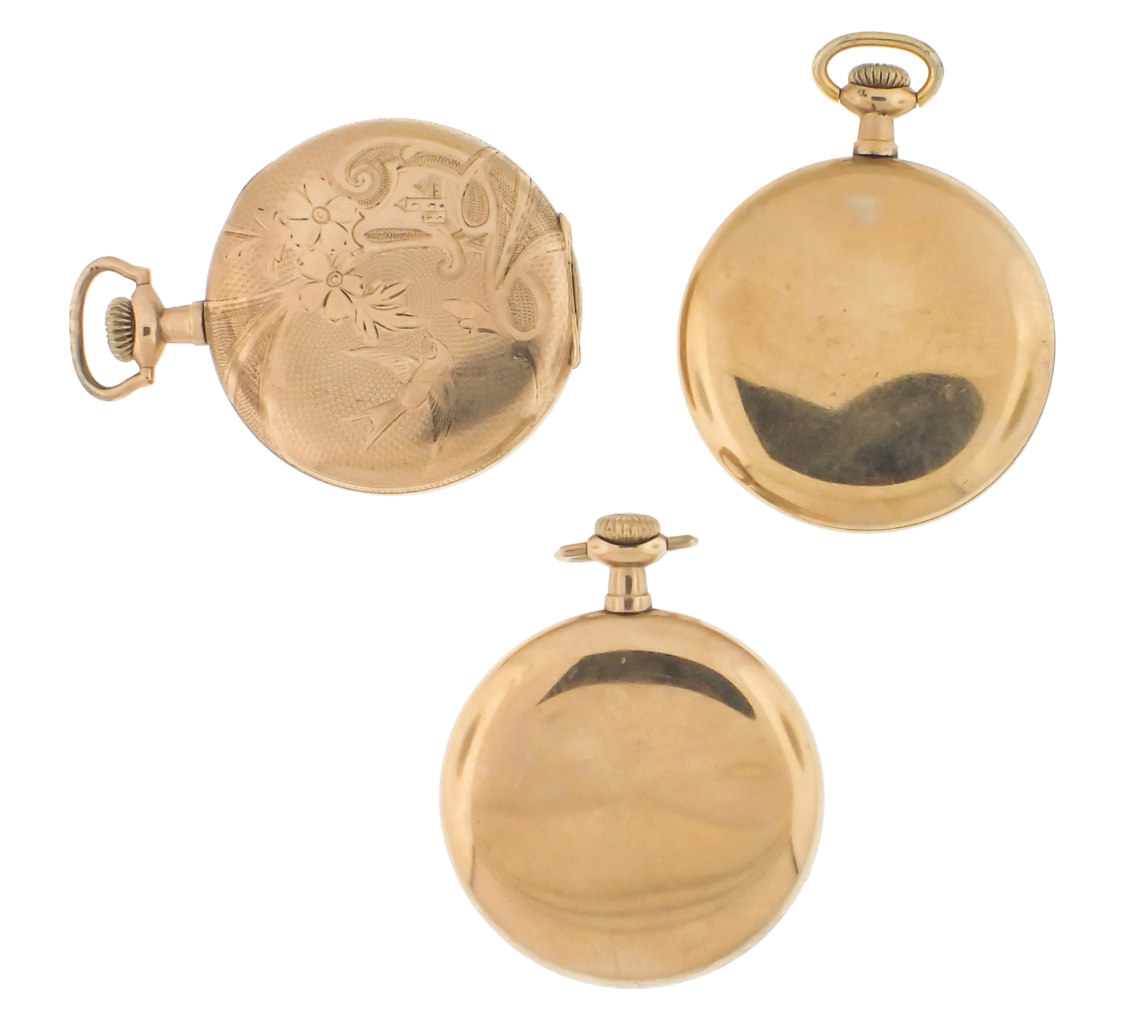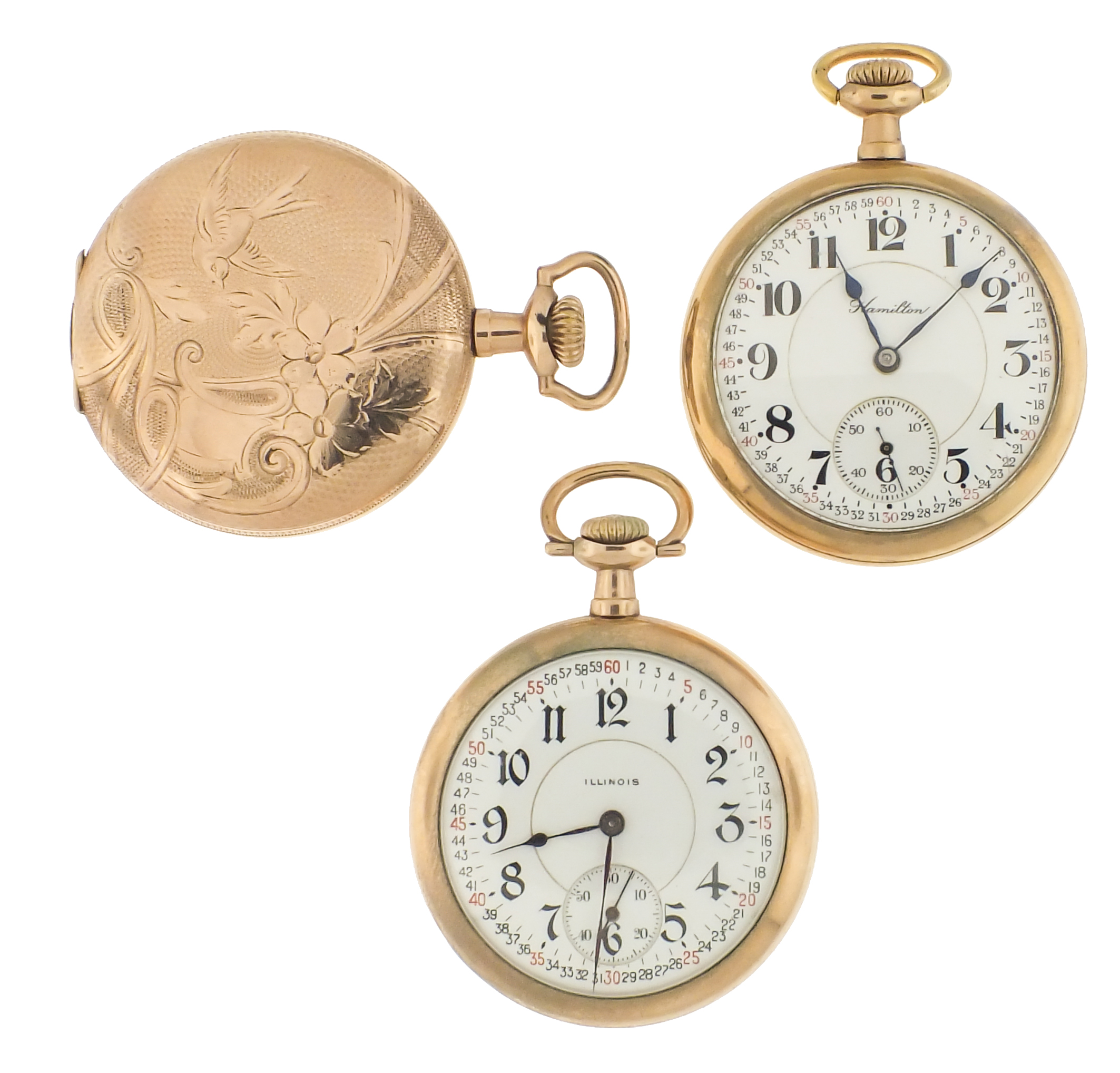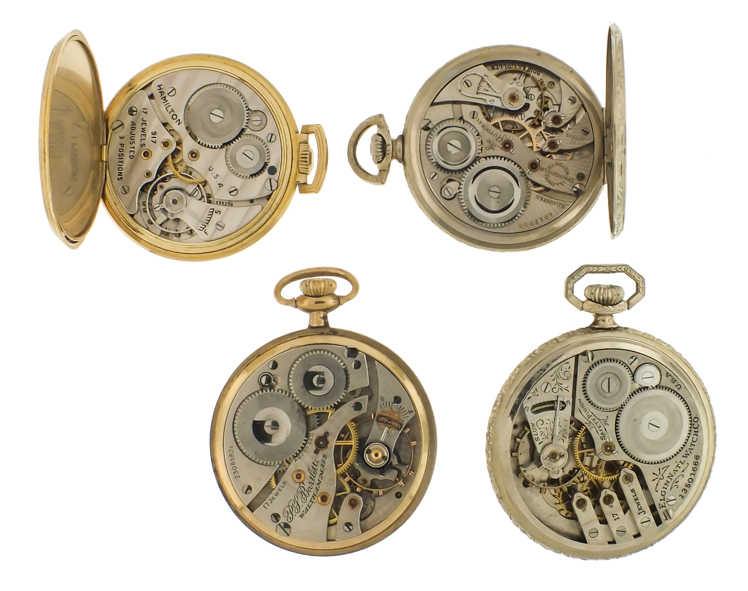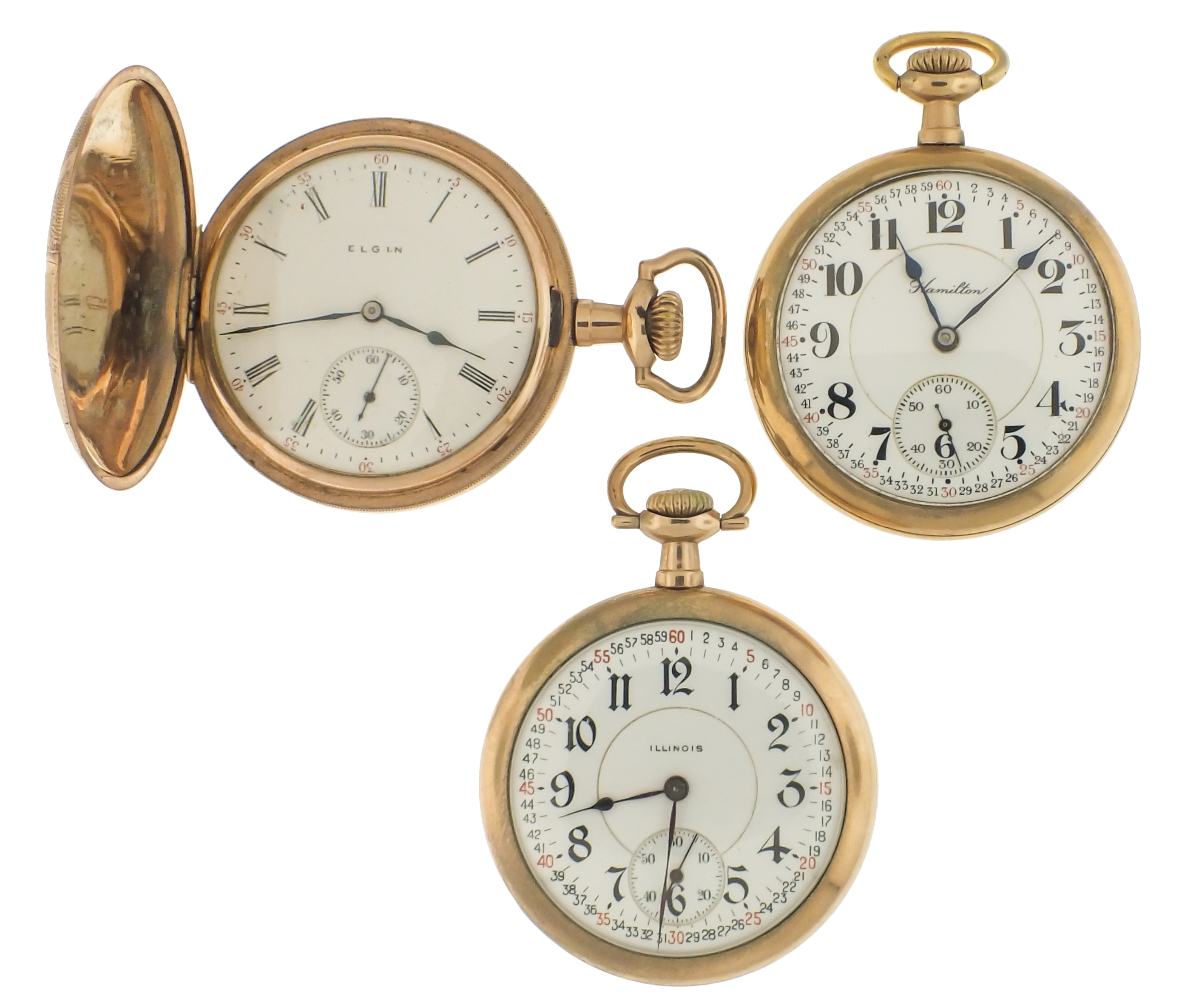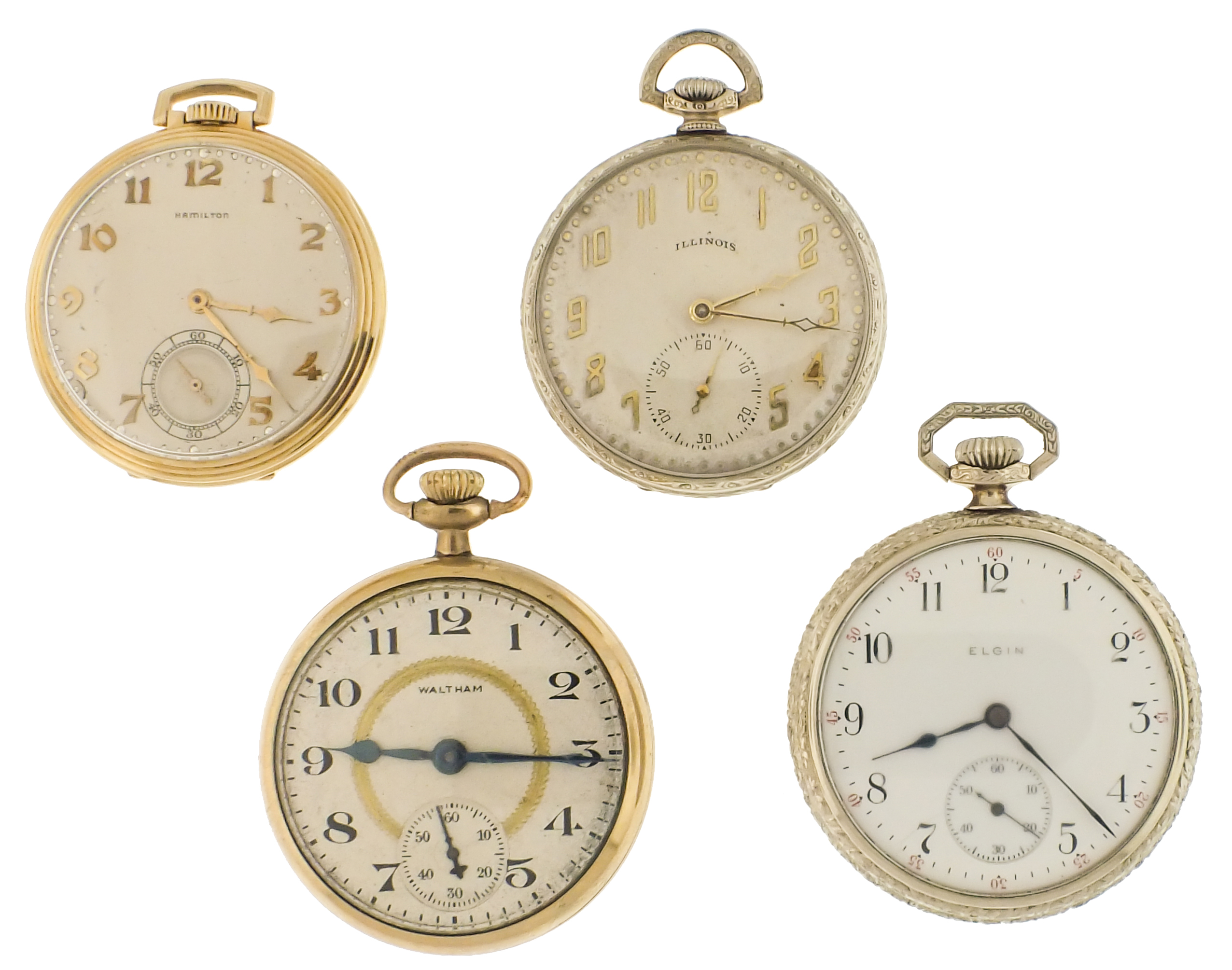 Pocket watches- 7 (Seven), 16 and 12 size, makers including Hamilton, Waltham, Illinois, and Elgin, 17- 21 jewel movements, roman and arabic numeral enamel and metal dials, gold filled hunting and open face cases