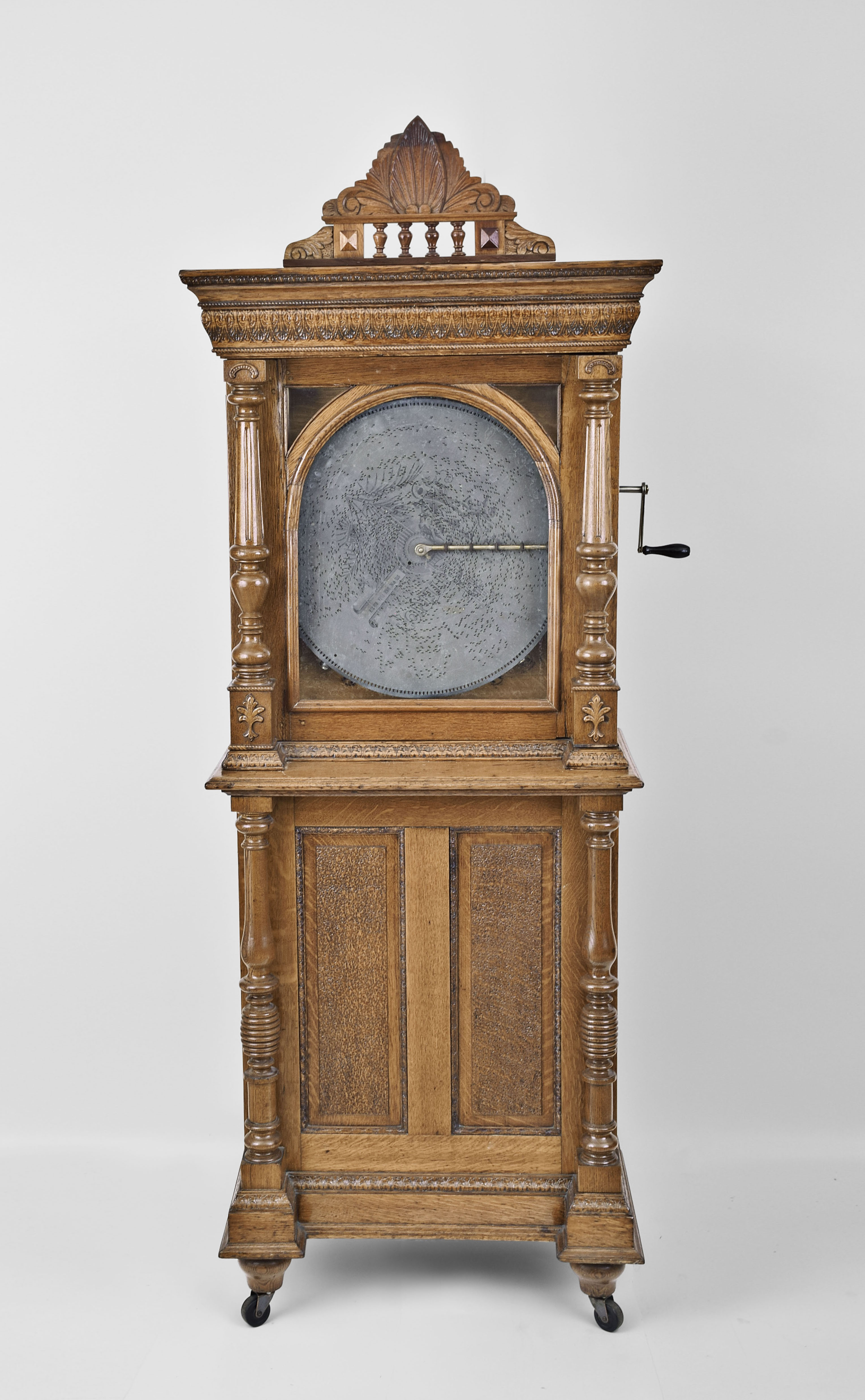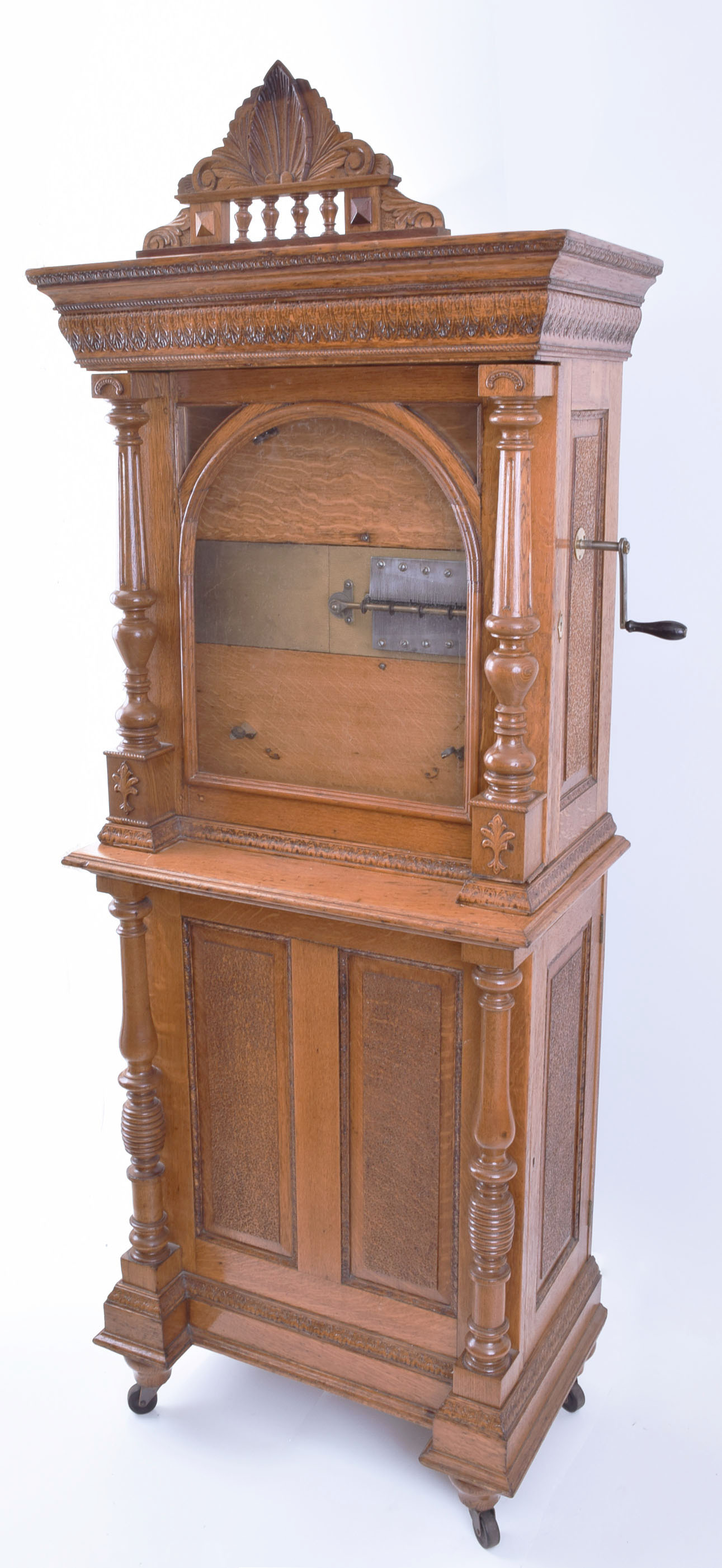 F.G. Otto & Sons, Jersey City, N.J., a "Criterion" 20 1/2 inch standing music box, the oak case with molded, paneled disc cabinet, turned columns and side doors below the music box case, with panelled sides, glazed door with turned columns, and molded cornice with pressed ornament, the top with scroll and shell carved crest, the two comb, spring driven mechanism playing 20 1/2 inch discs, 30 included