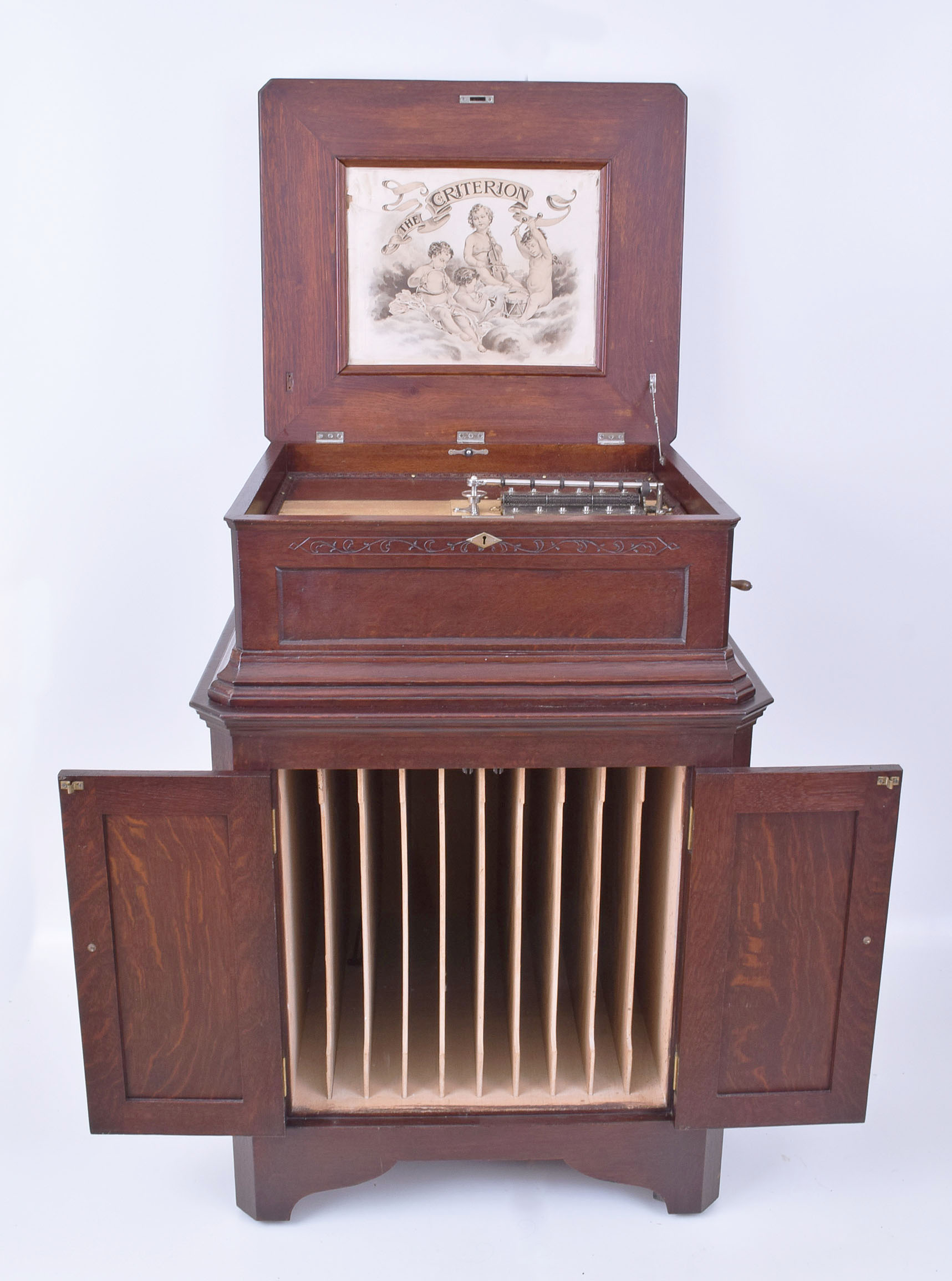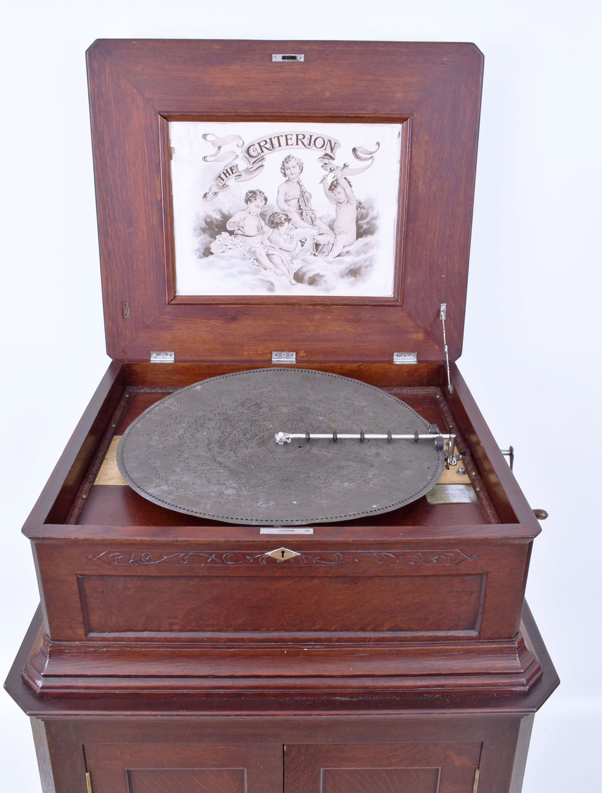 F.G. Otto & Sons, a "Criterion" 20 1/2 inch disc music box with cabinet base, dark oak case with molded base and top, recessed faux panel, simple vine and foliate carving, and canted corners, resting on a purpose made, conforming cabinet base with two paneled doors, panelled sides and back, on casters, the mechanism with two combs, and framed lithograph on underside of lid, playing 20 1/2 inch discs, 30 included