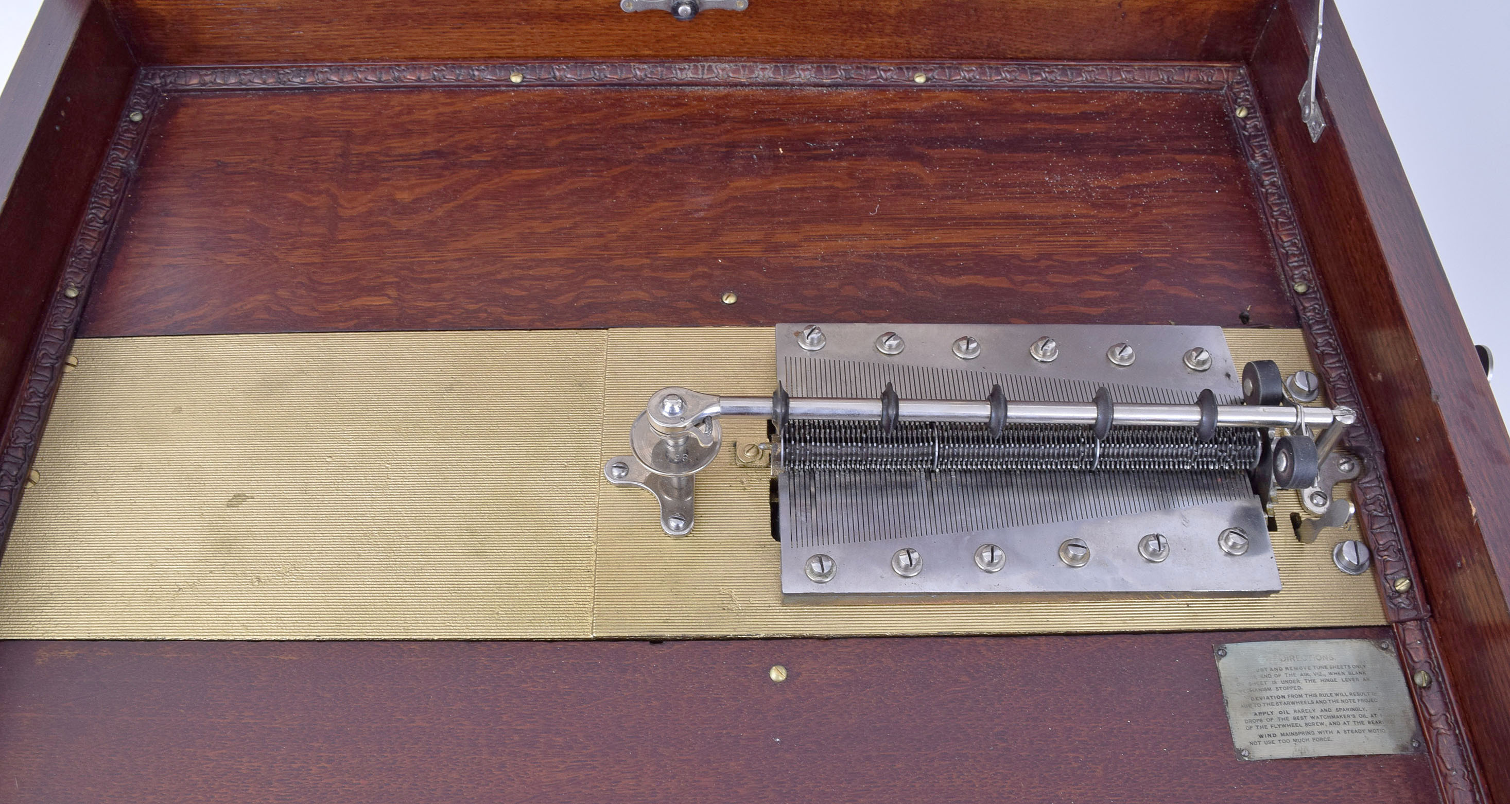 case refinished, base later and with a few minor dings and scrapes, music box base molding with bead removed, faux panel and carving later additions, lithograph inside lid with minor staining, creasing and losses, lid support on left side missing, no broken teeth