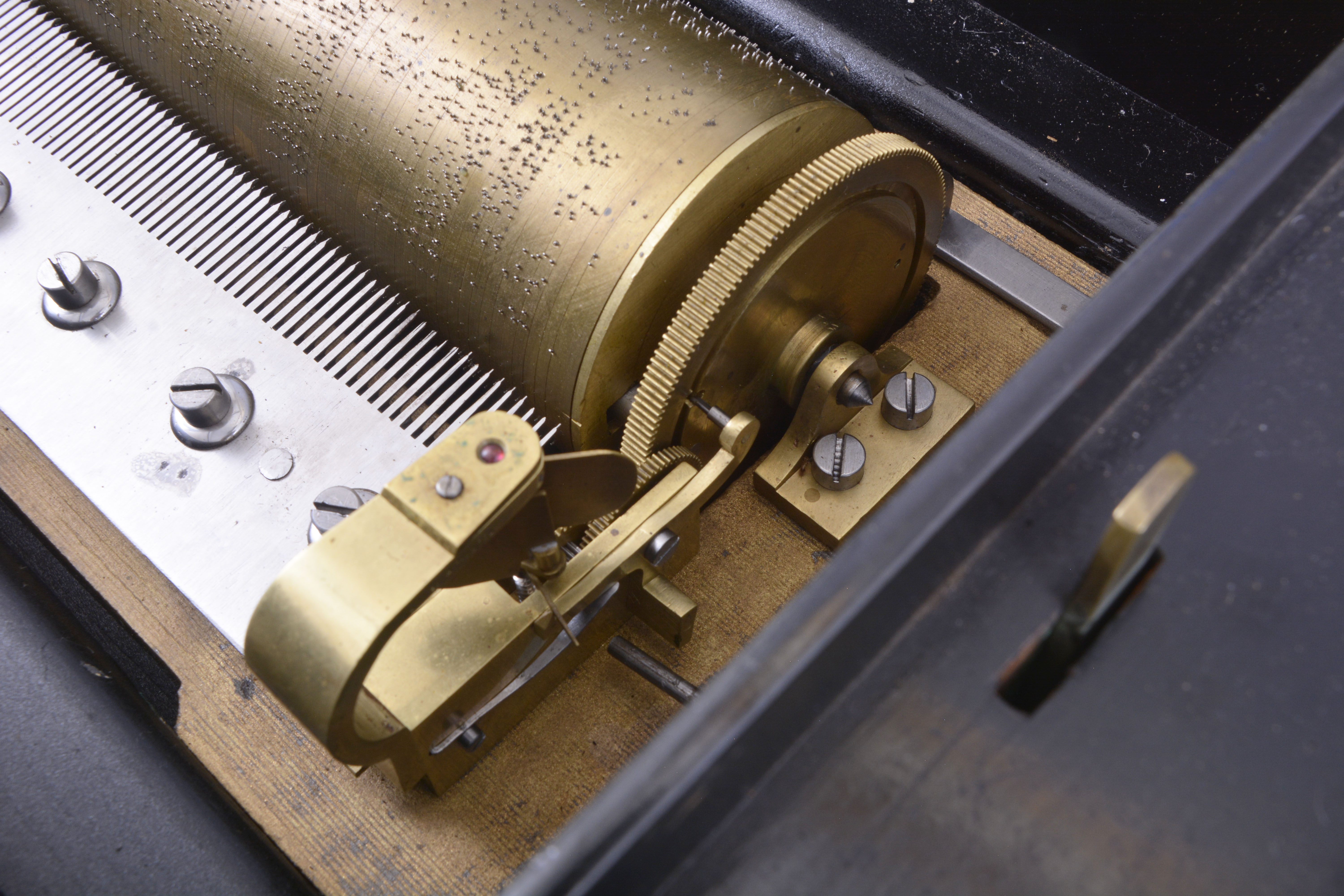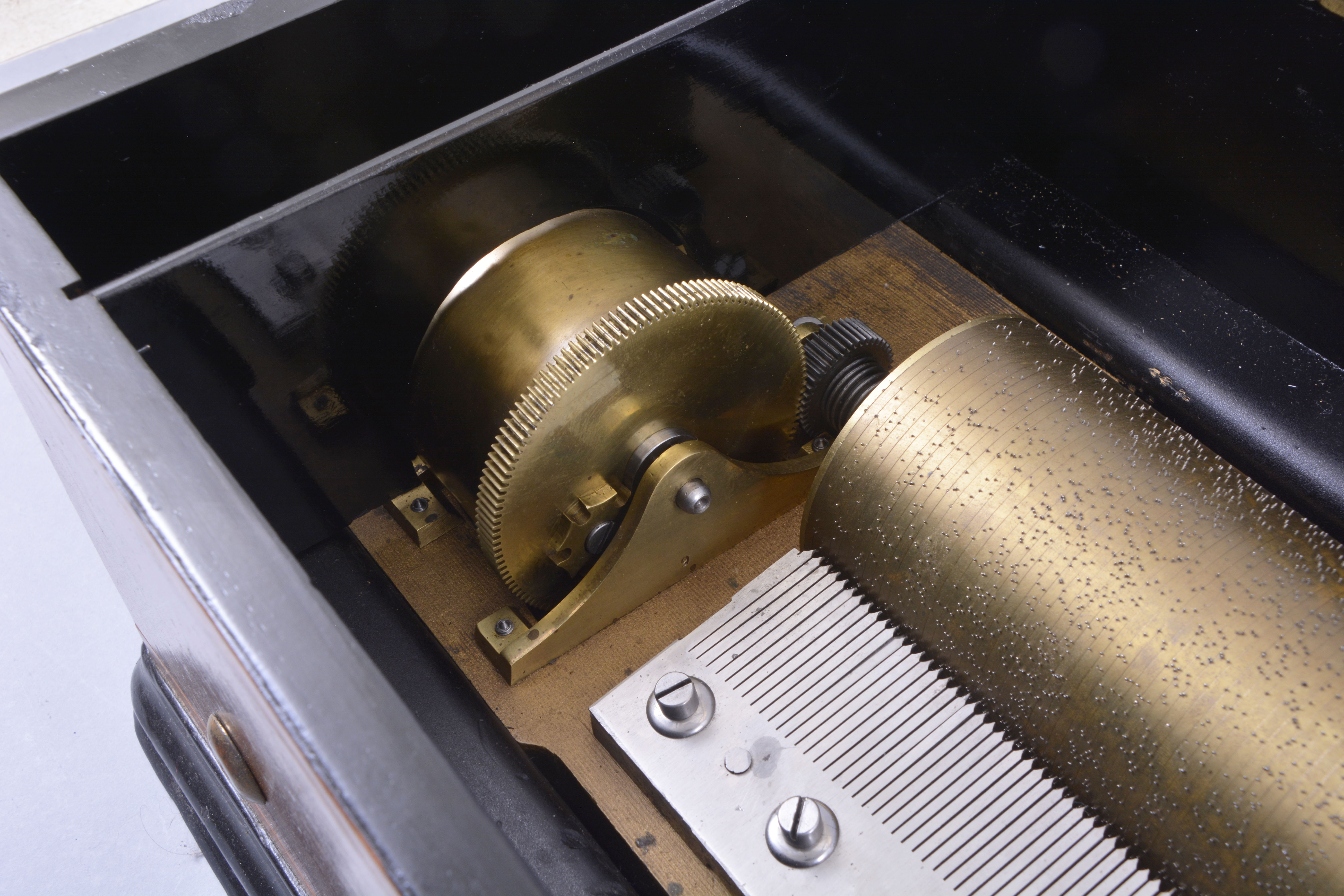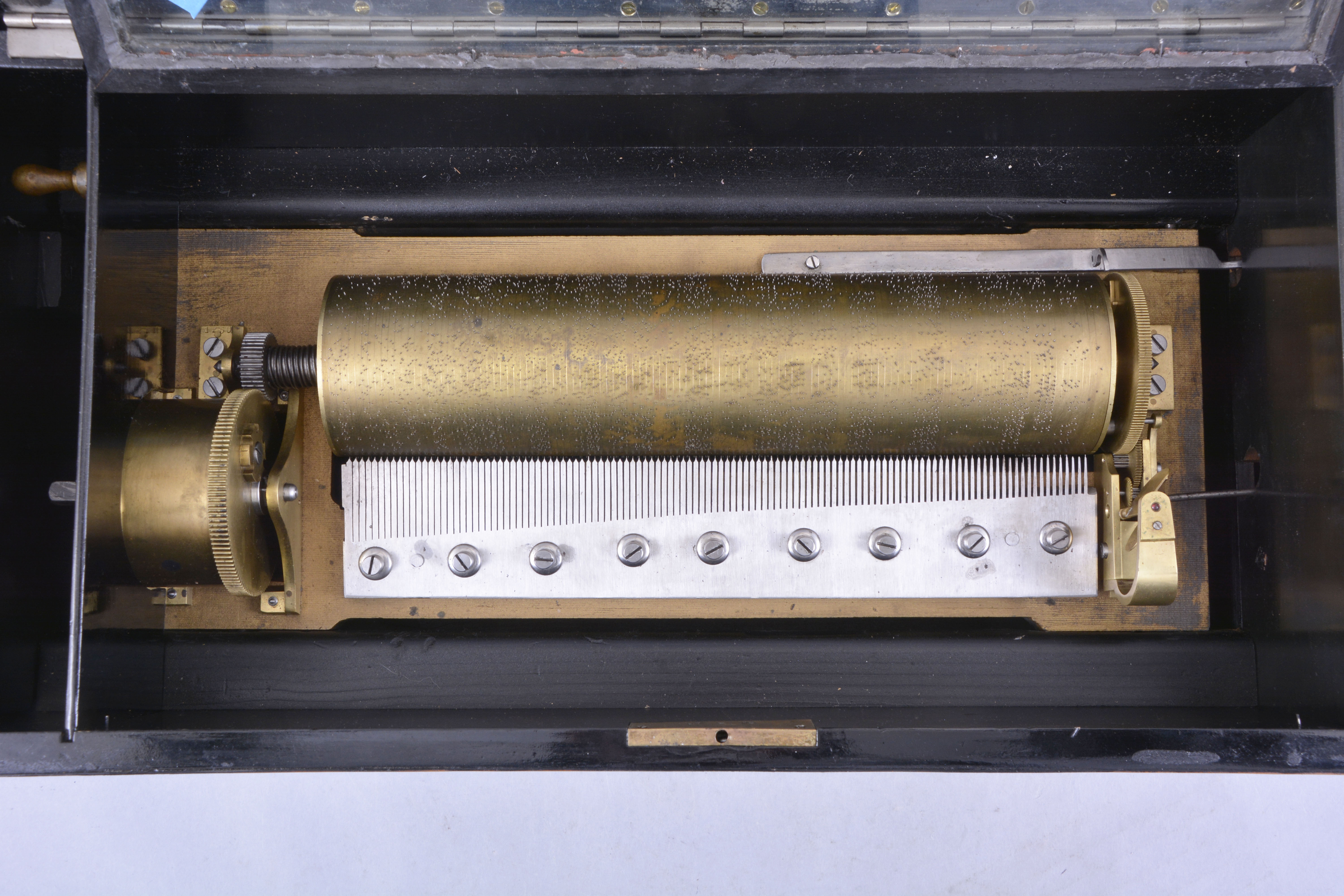 ebonized surfaces now painted black, significant replacements to rosewood banding, case poorly refinished, the grain painted back with losses and poor restoration, tune card with staining and significant losses, now glued to another card in an attempt to stabilize the remnants, and with black overspray, glass cracked, movement and cylinder fairly clean, box plays well, but needs damping