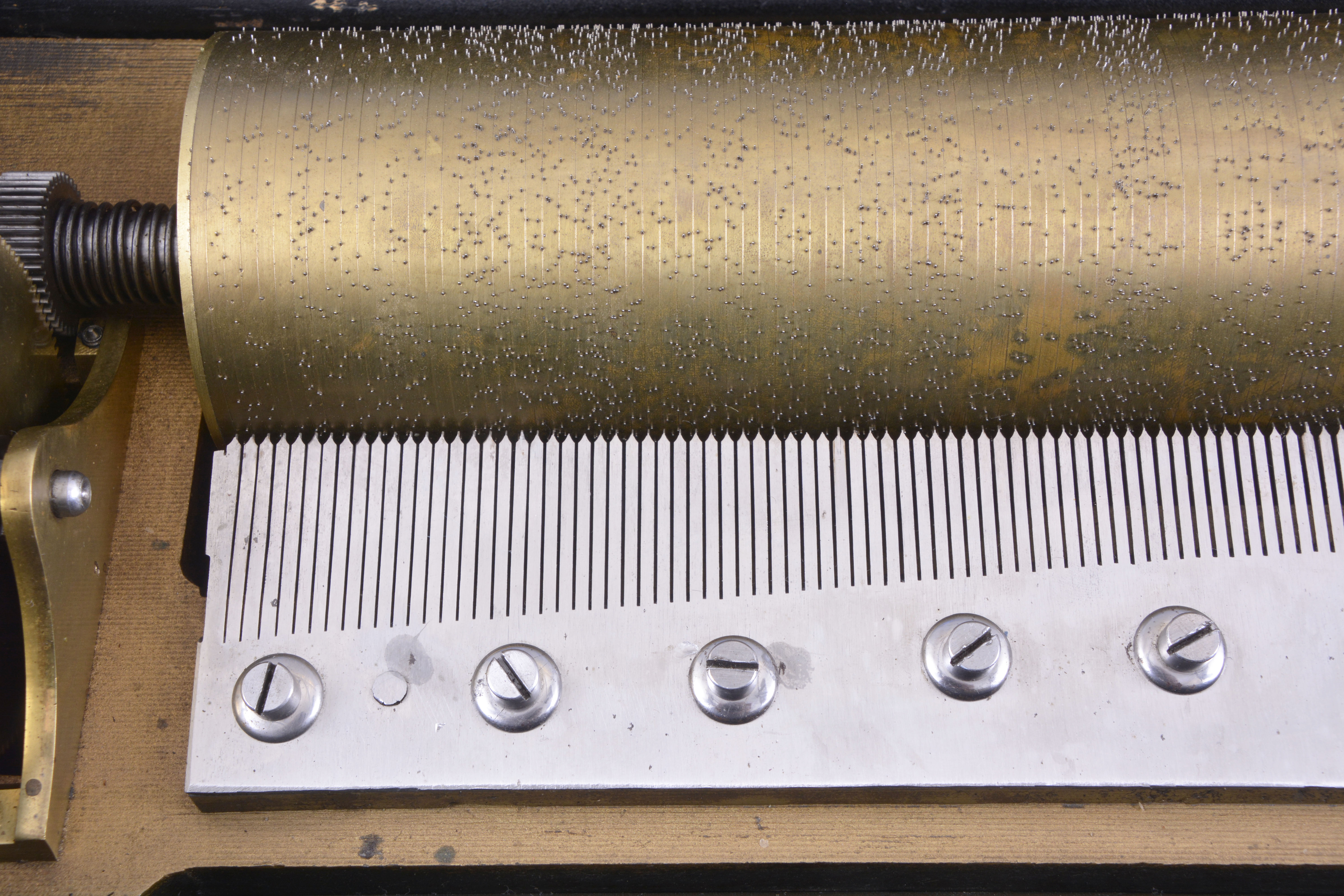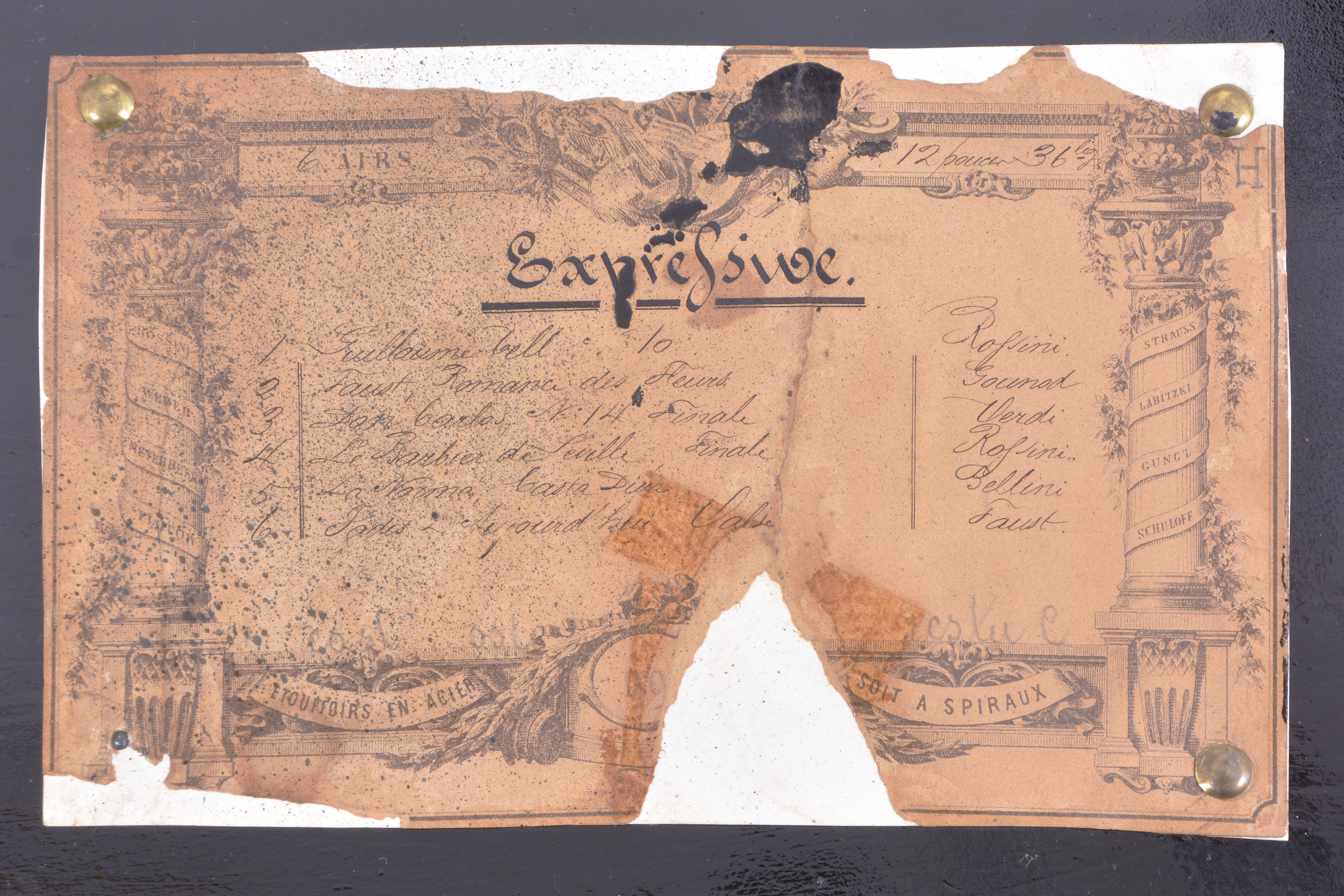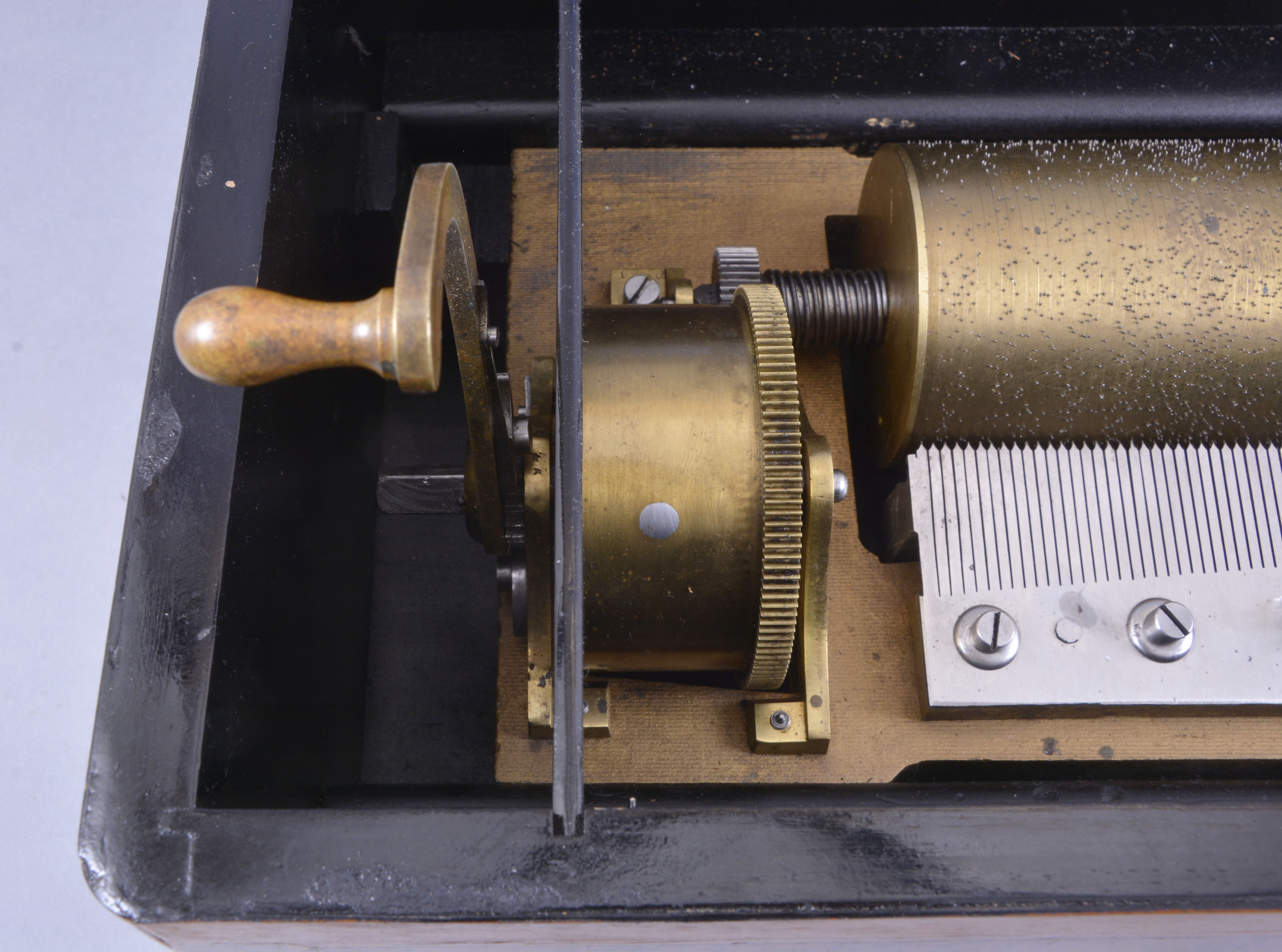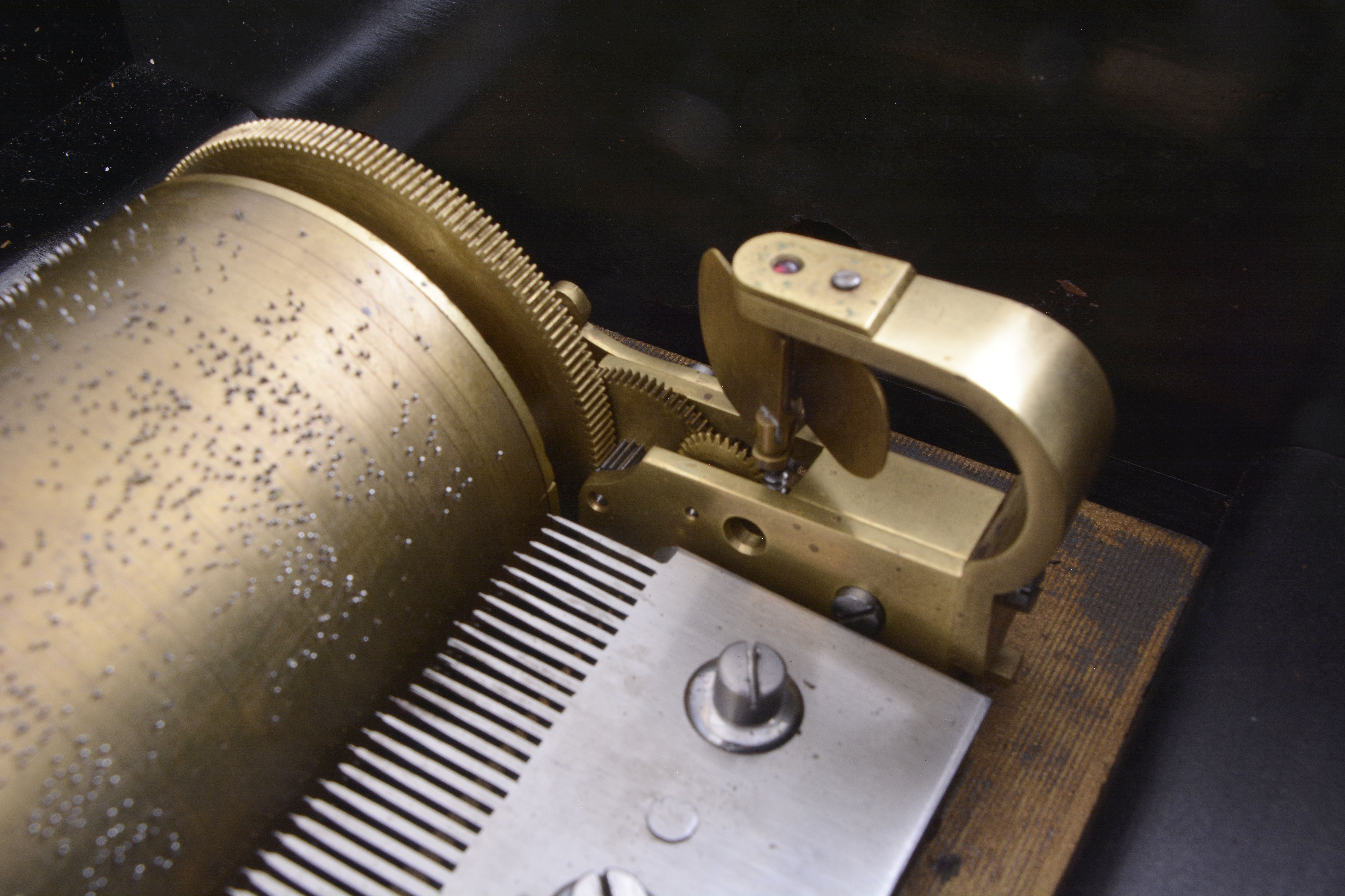 ebonized surfaces now painted black, significant replacements to rosewood banding, case poorly refinished, the grain painted back with losses and poor restoration, tune card with staining and significant losses, now glued to another card in an attempt to stabilize the remnants, and with black overspray, glass cracked, movement and cylinder fairly clean, box plays well, but needs damping