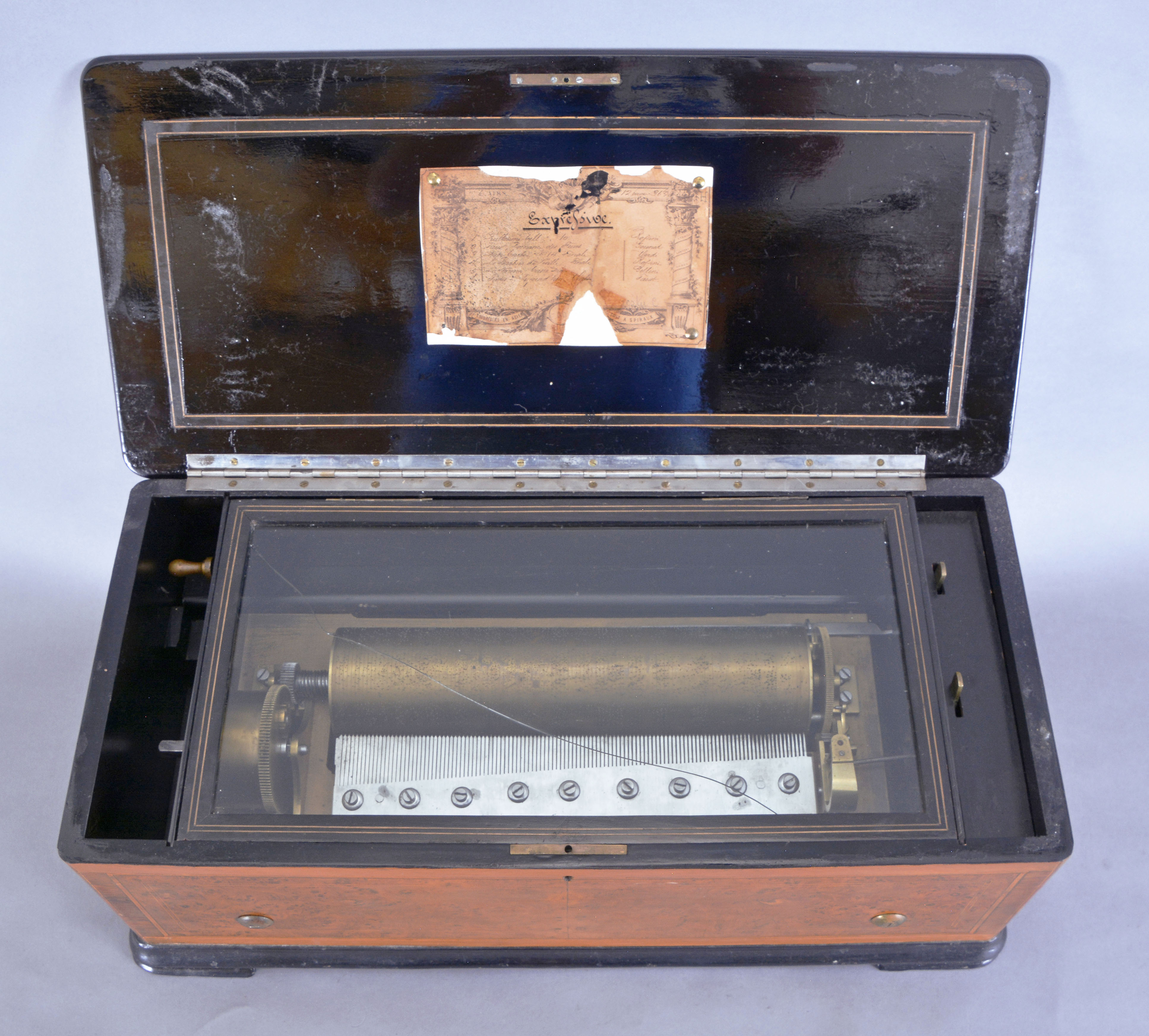 Switzerland, a good 19th century six air music box, the case with rounded corners, slightly domed top, and burl walnut veneer, inlaid with cross grained tulipwood banding with holly border, and framed with rosewood crossbanding, the base with ebonized feet and molding, the top also with an ebonized edge, and ebonized interior with light wood stringing, tune card on underside of lid, and movement protected by a glazed, hinged frame, 13", three inch diameter cylinder, and one piece steel comb