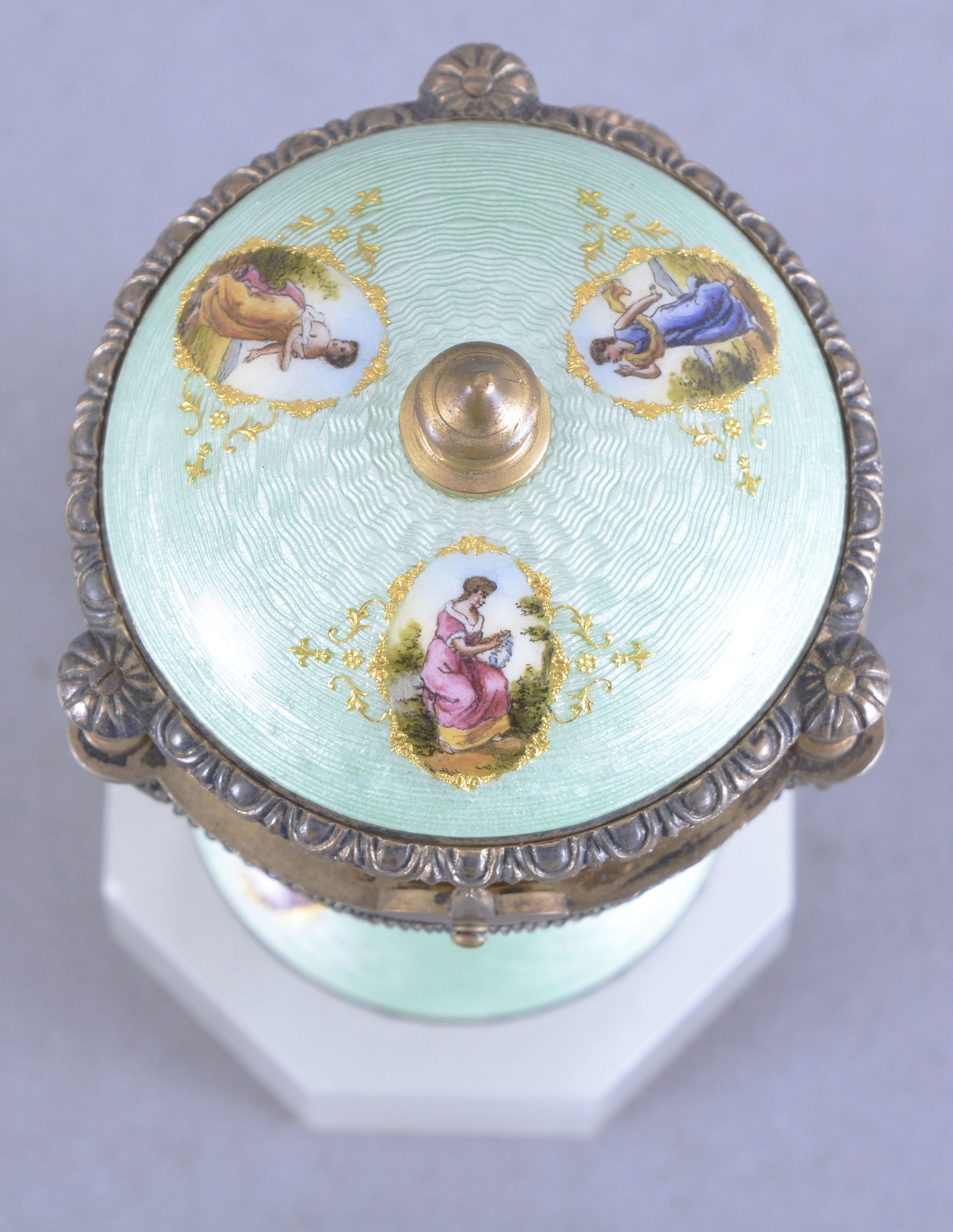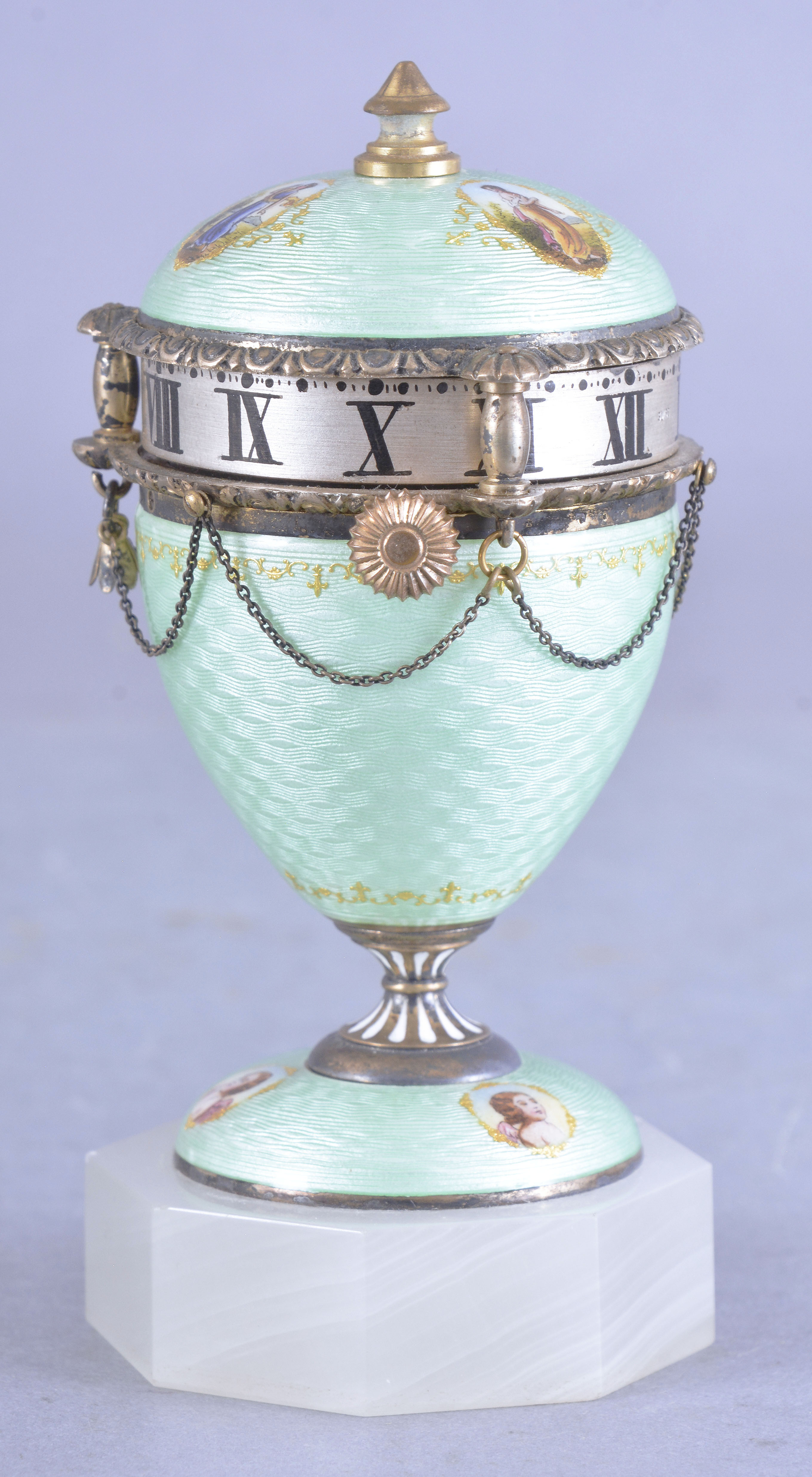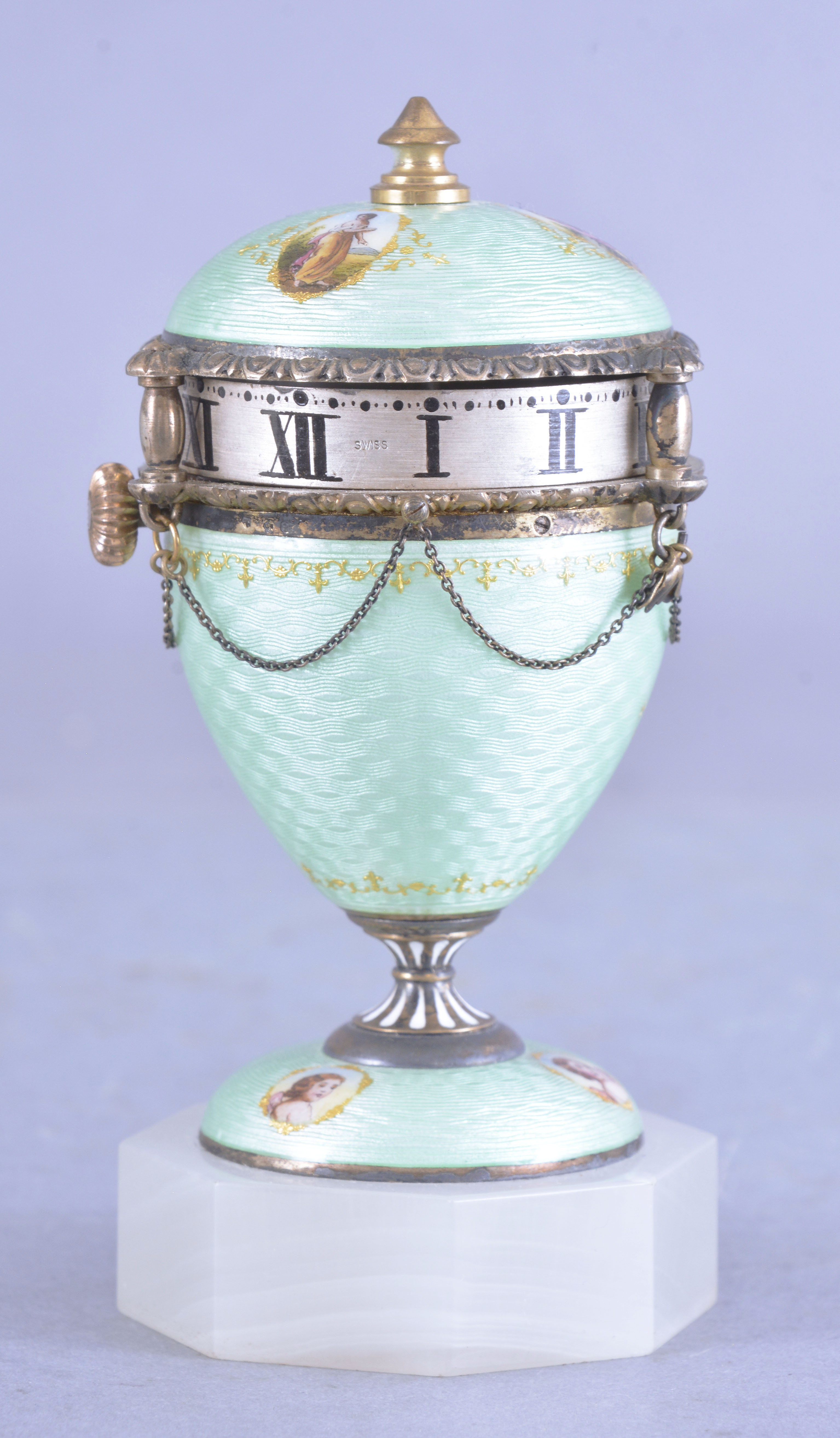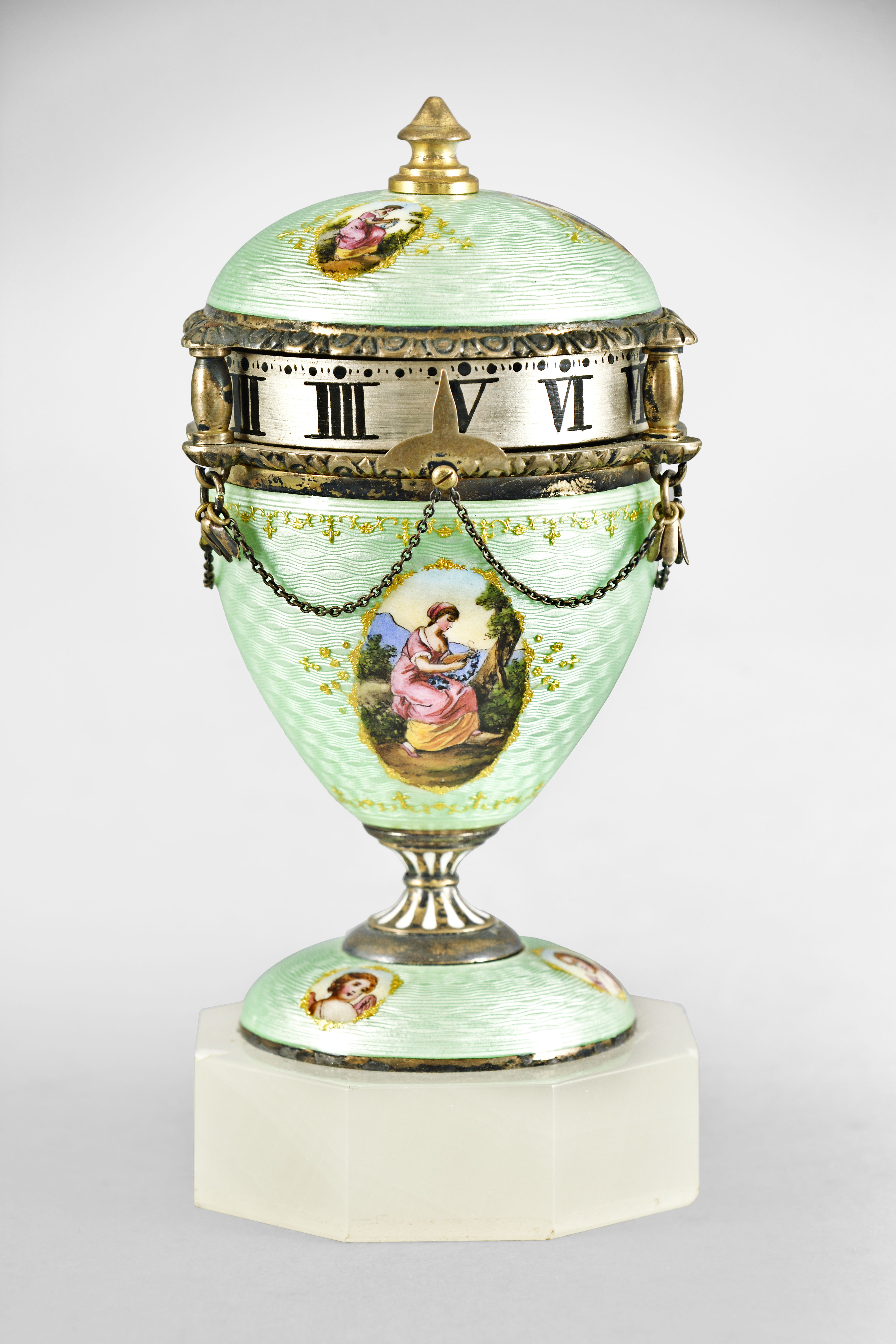 Austria, a good miniature guilloche enamel urn form annular clock, the sterling silver gilt case on an octagonal white agate base, the bottom with three paillon framed polychrome enamel putto, the top with paillon framed females in landscapes, on a mint green enamel ground, the upper and lower sections each with an egg and dart molded edge joined by turned pillars, and bordering the silvered roman numeral annular dial, Swiss 8 day timepiece movement with lever escapement