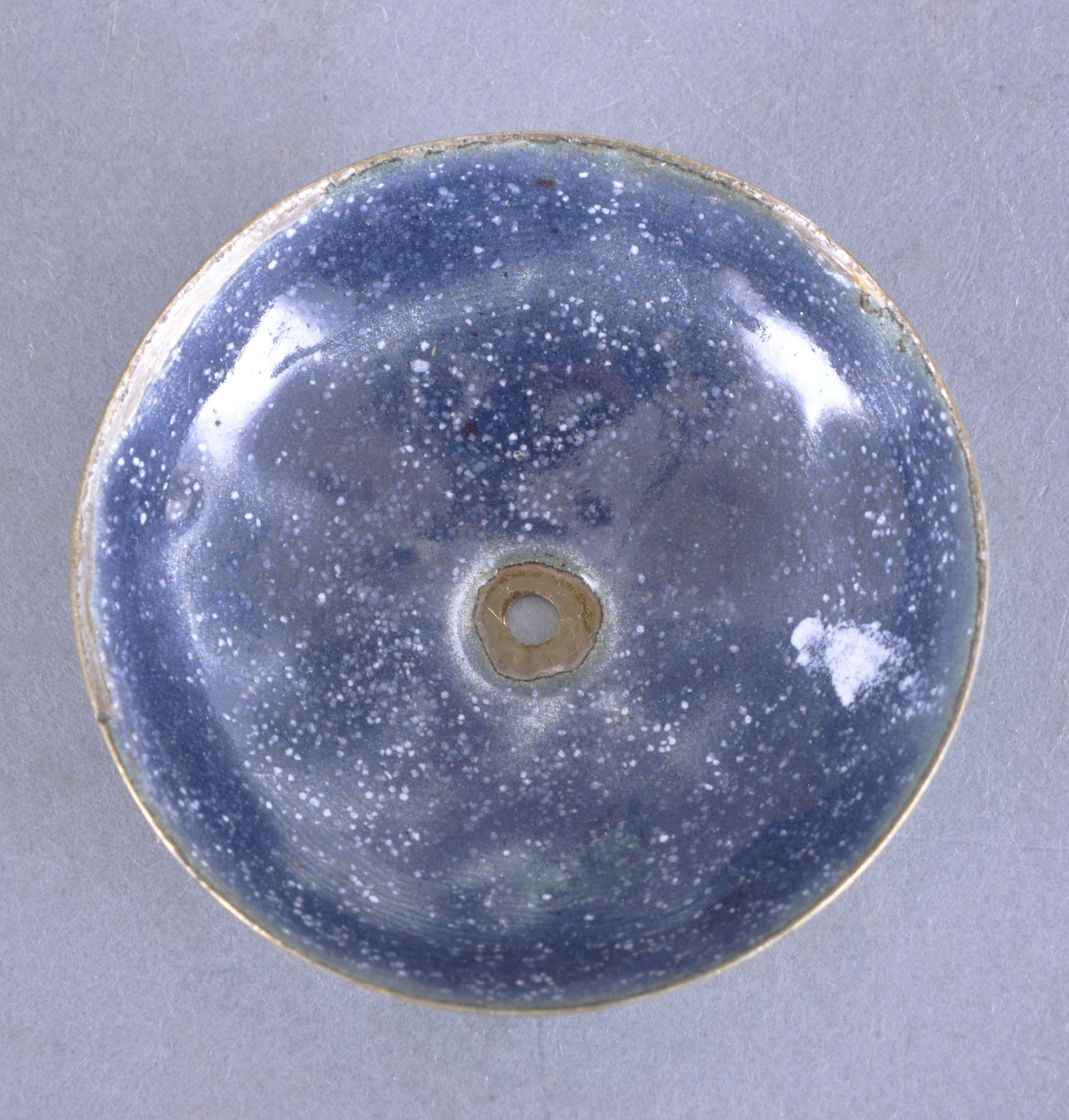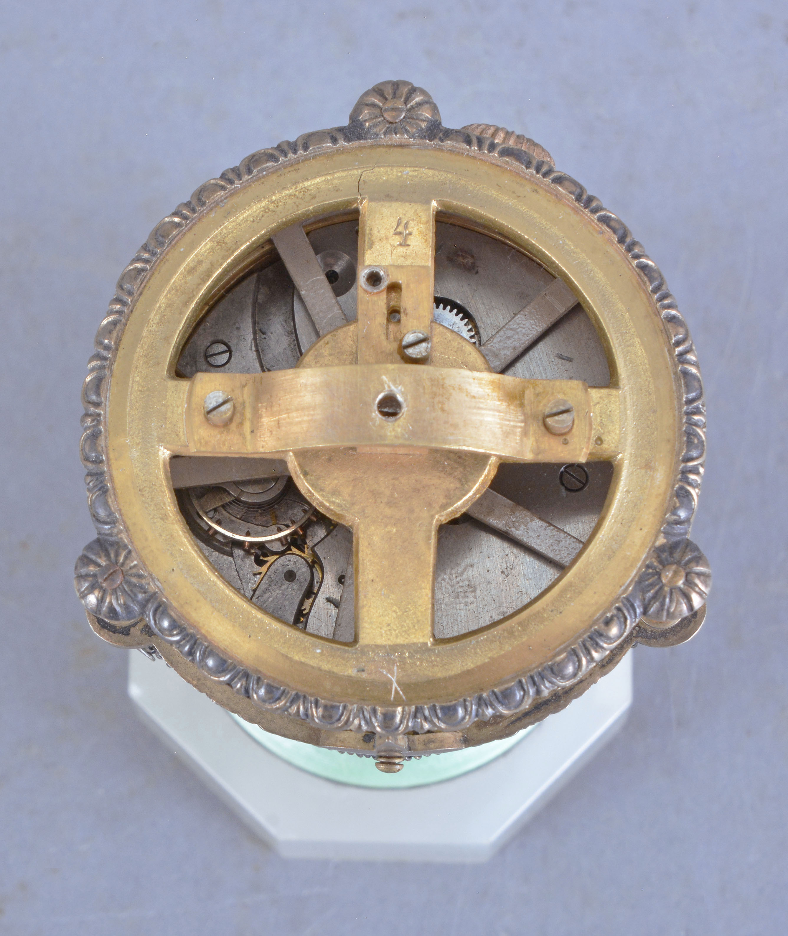 enamel very good, base with bruise and a few flakes, finial replaced, silver dirty and with losses to gilding, dial repainted, running