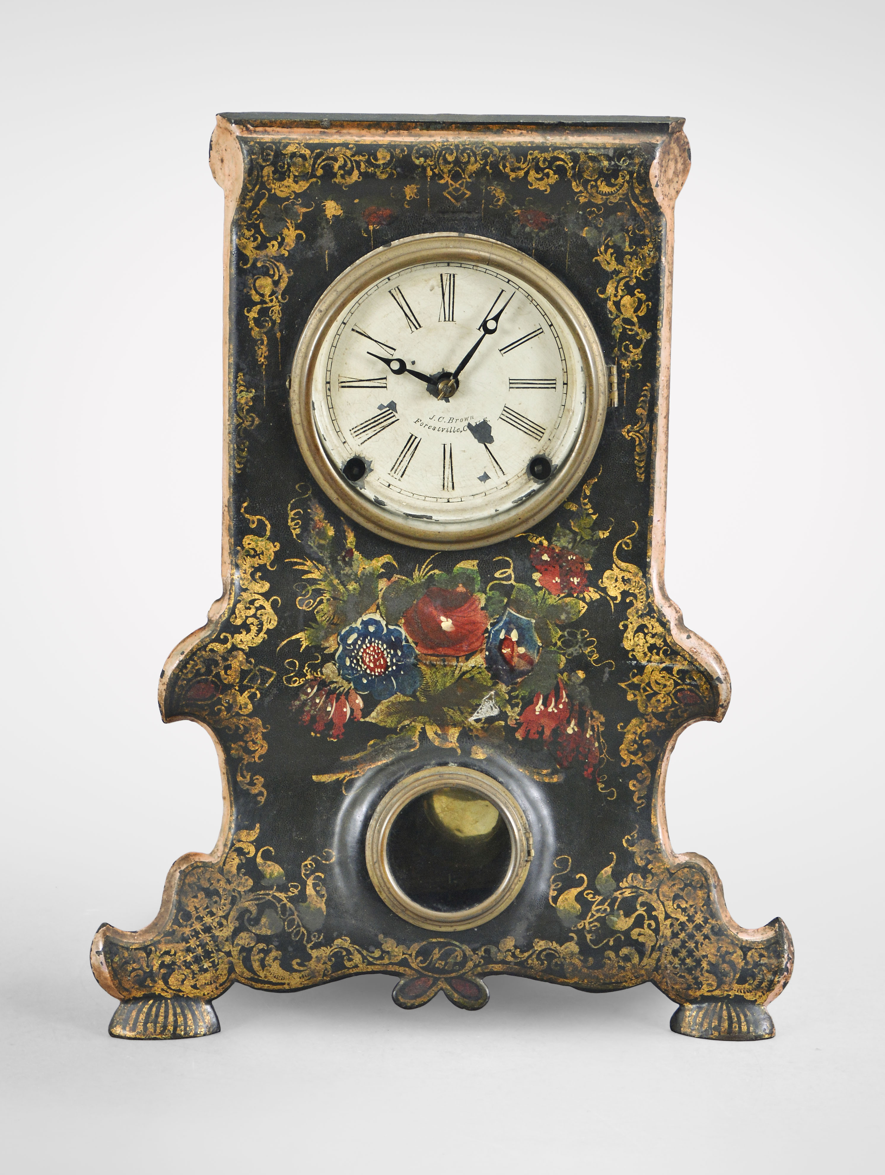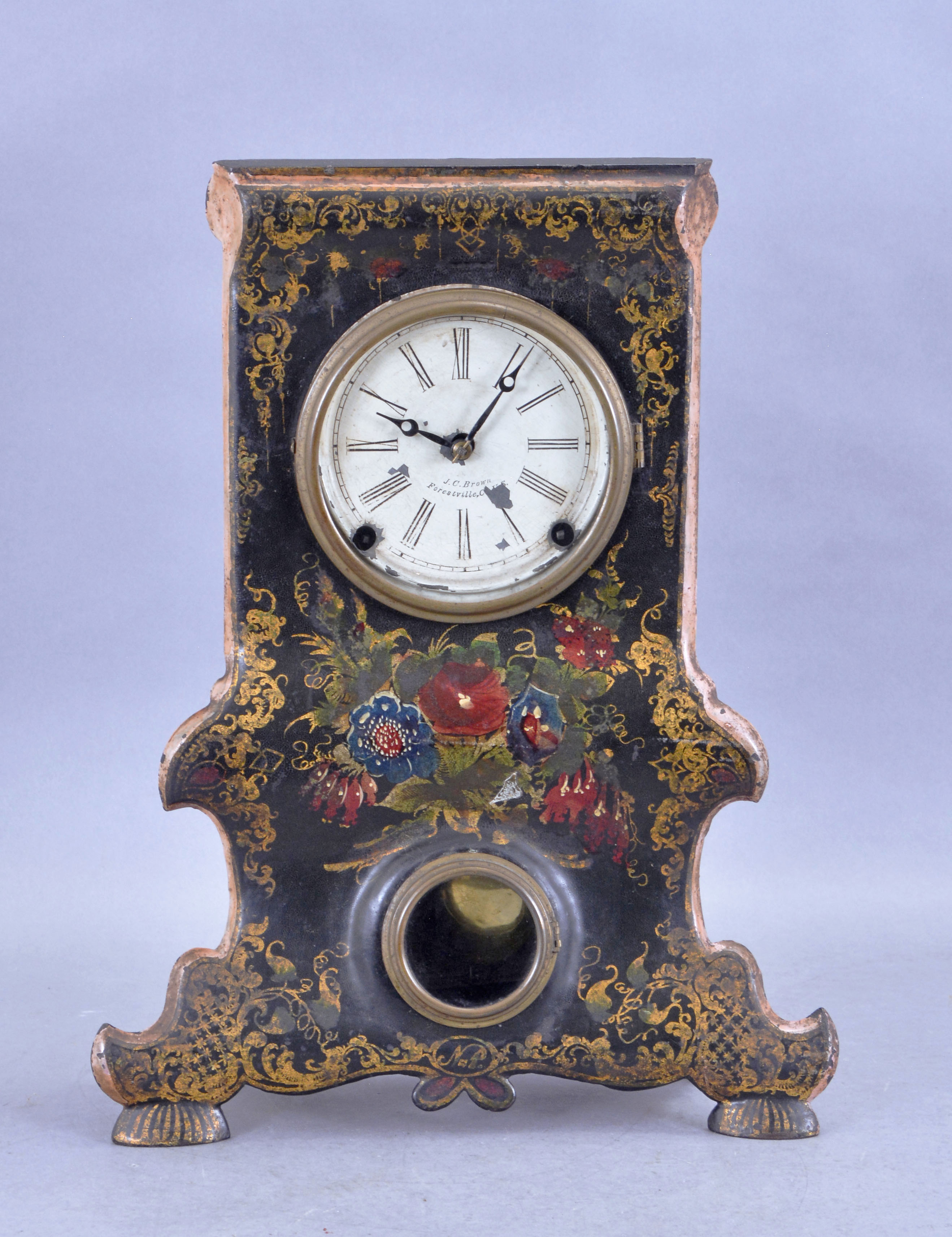 J.C. Brown, Forestville Mfg. Co., Bristol, Conn., 8 day, time and strike spring driven brass movement iron front shelf clock.