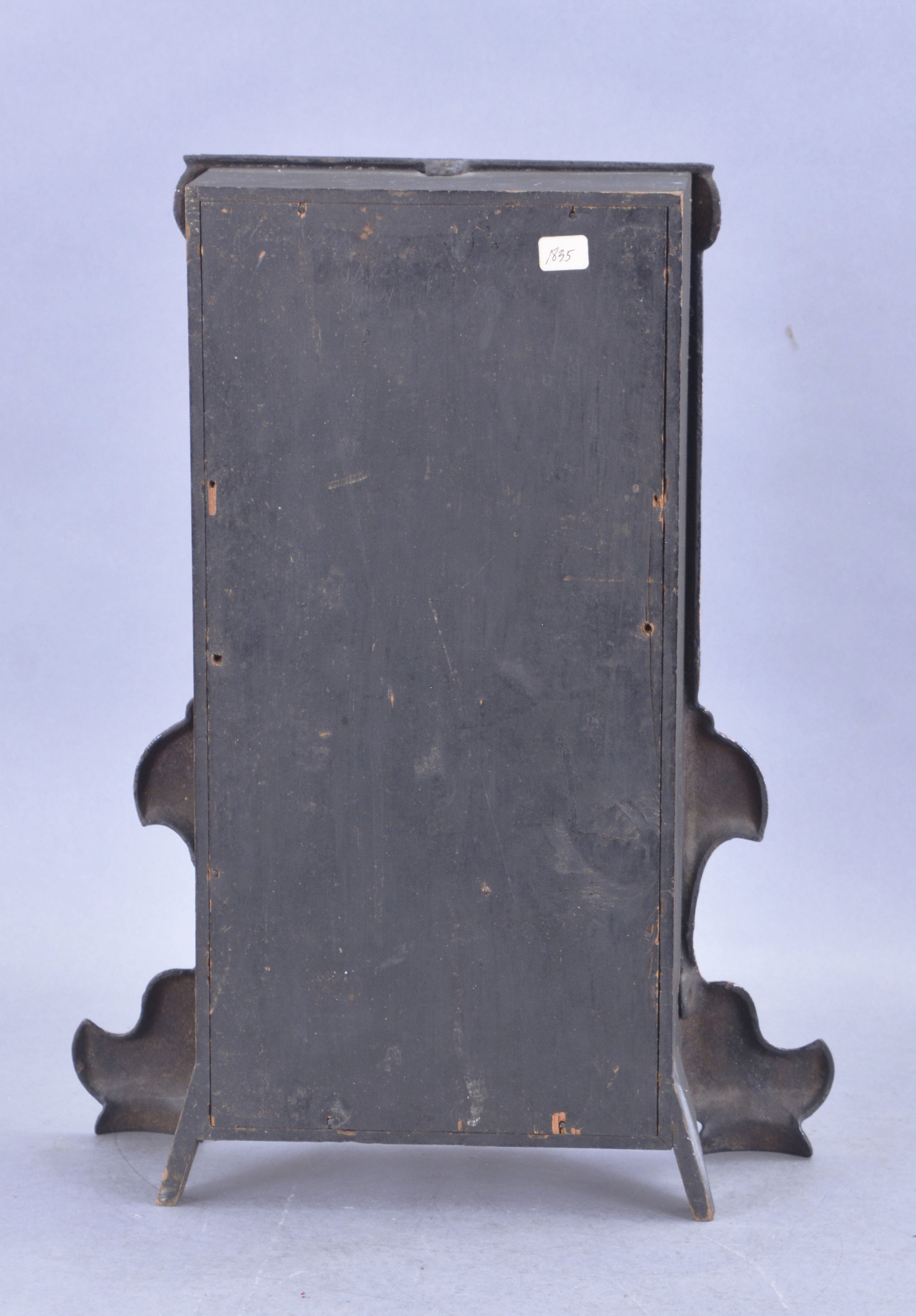 Decorative Iron front case has age darkened with some loss just above the dial, above the bottom door and scattered loss on the edges. Original painted dial has some loss at the winding arbors and a couple other spots. Original hands. Movement is signed.