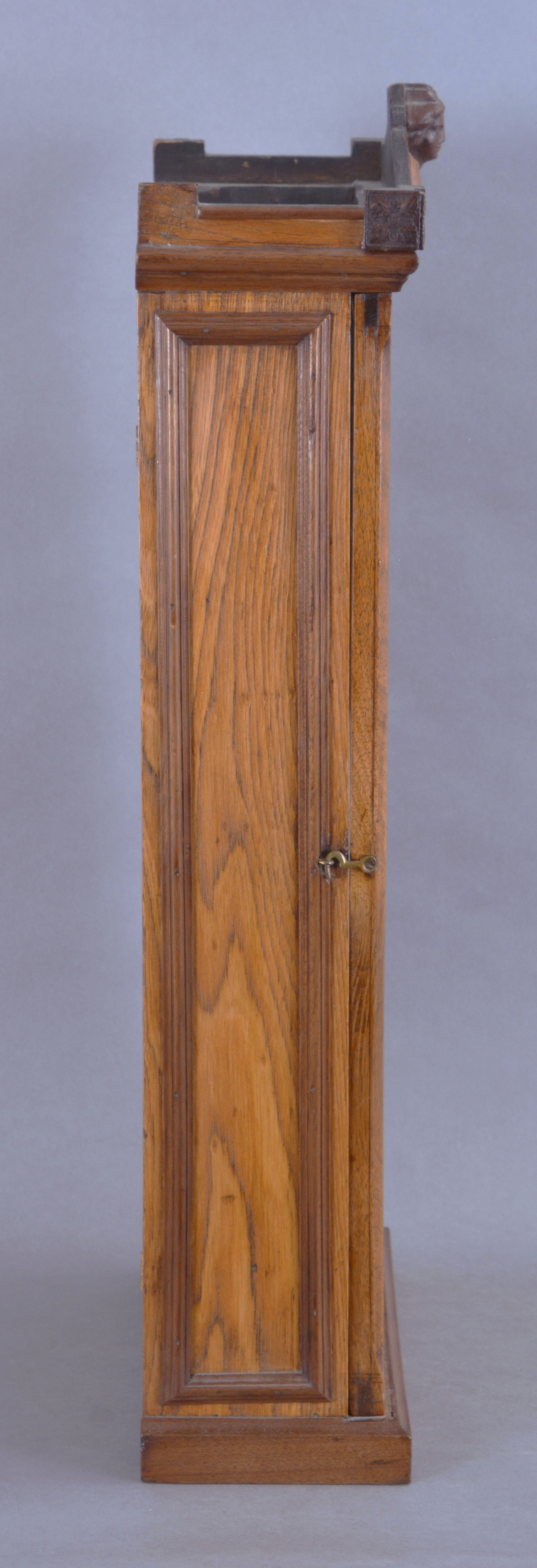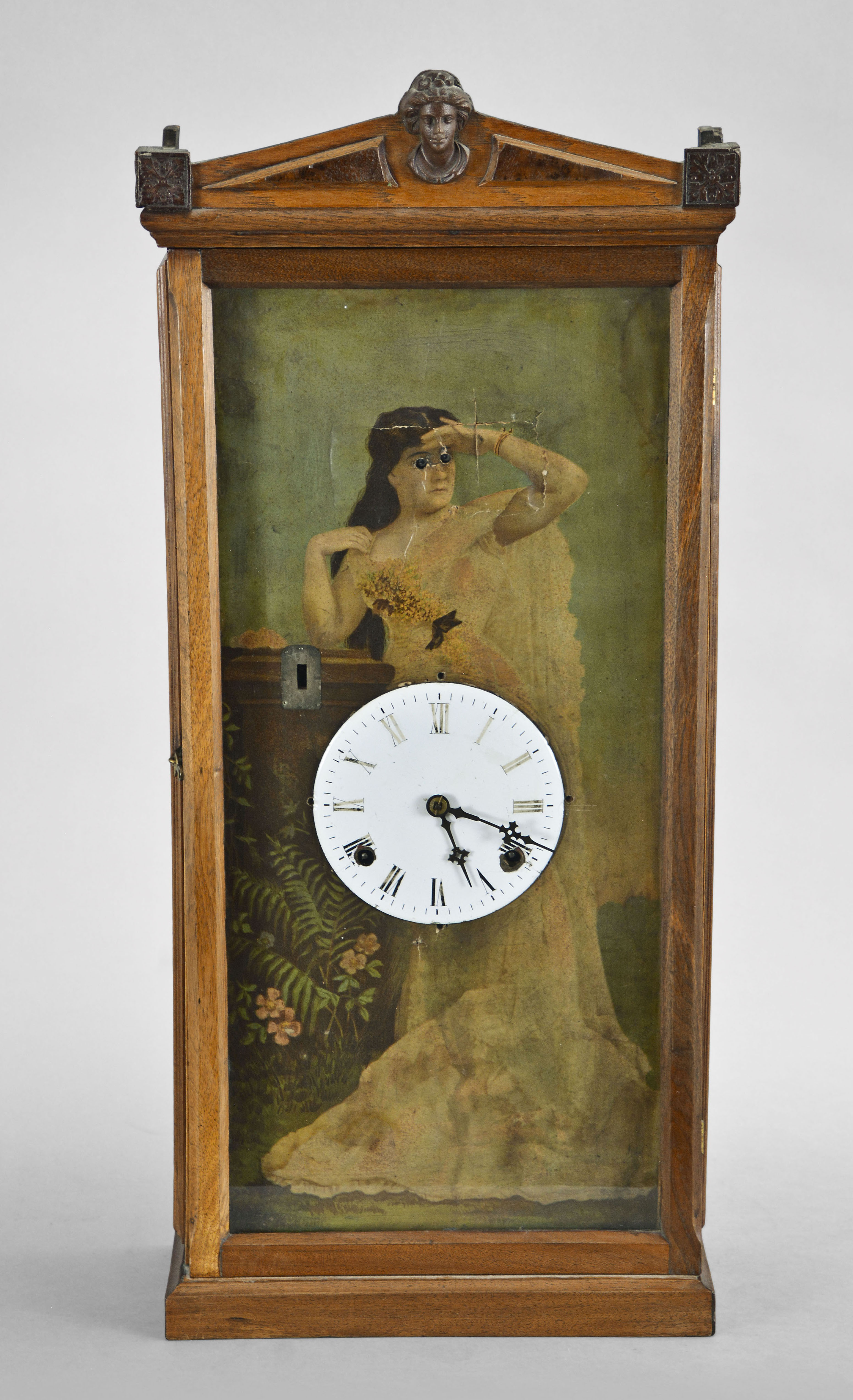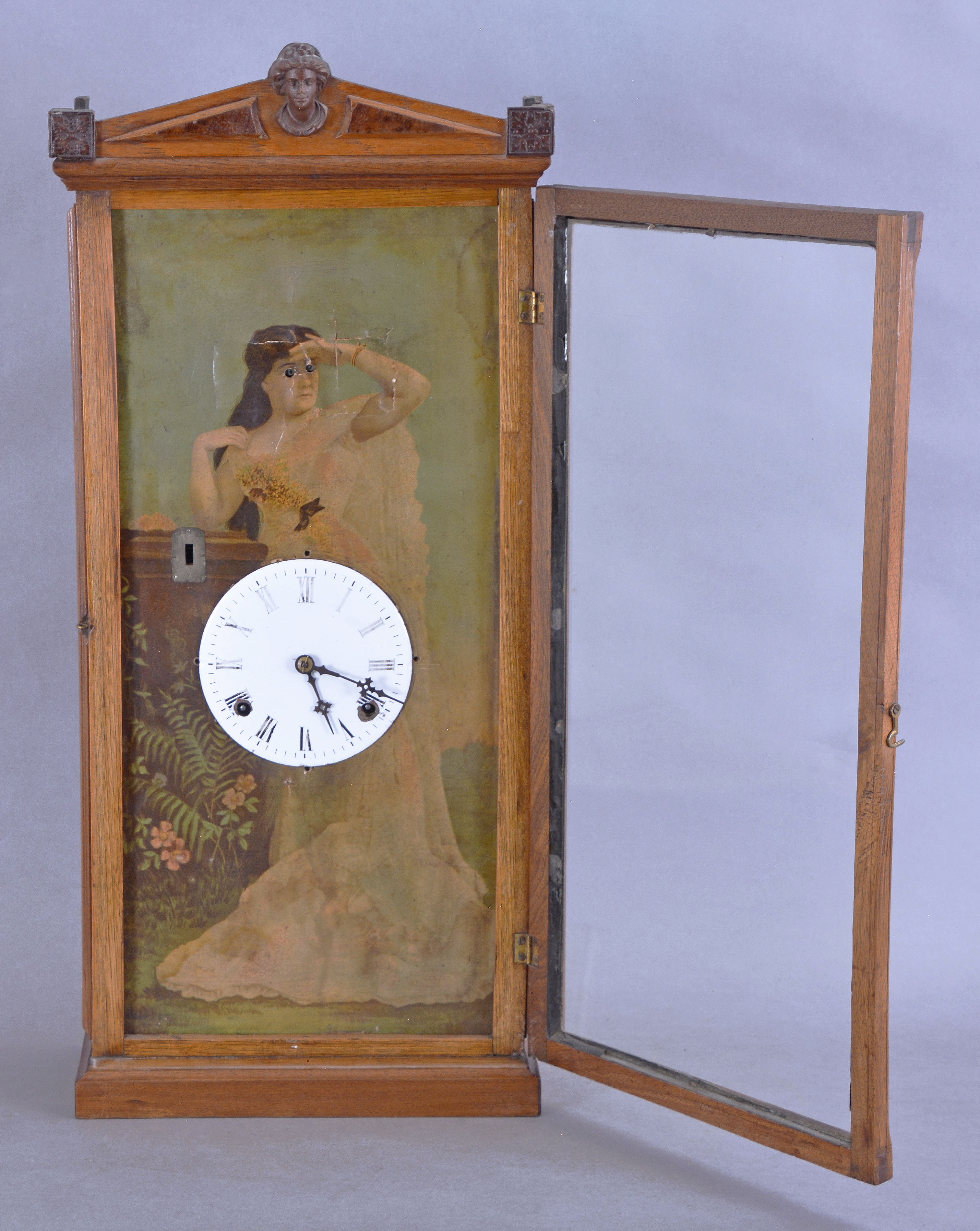 Leopold Feuerstein, Chicago, Illinois, an unusual moving eye shelf or mantel clock, tall chestnut and walnut case with molded base, sides, and top, gabled front with central composition mask, glazed, full length door revealing the roman numeral white enamel dial and full length chromolithograph of a woman, standing and with her right elbow resting on a pedestal, her left shading her eyes, head turned and looking off into the distance, and aperture for switch at her right, 8 day time and strike movement with inverted U shaped pendulum suspension frame, allowing the rod to receive impulse and animate the eyes, interior of back door with handwritten inscription "Patented Nov. 9 1886 Leopold Feuerstein 701 S. Halsted St"