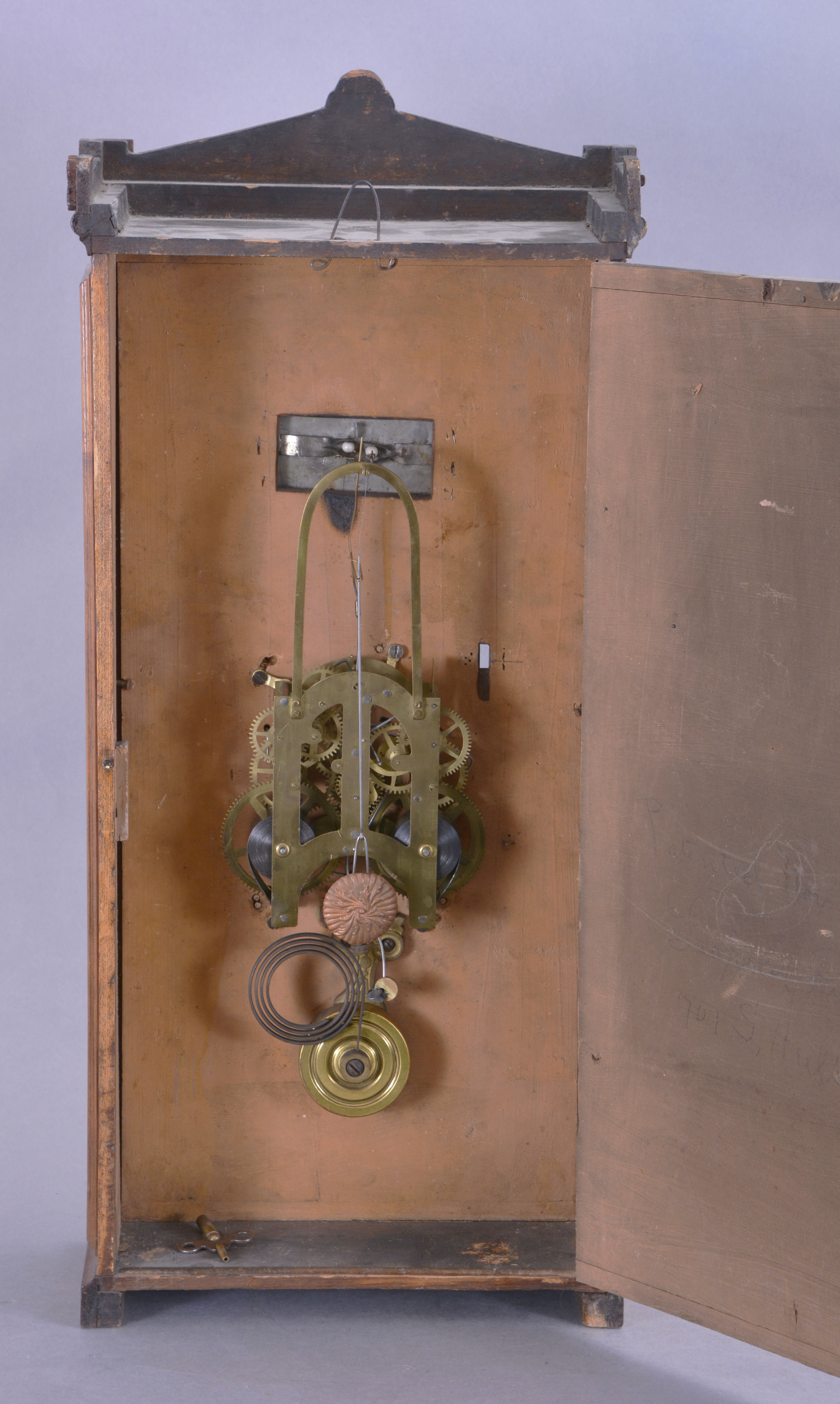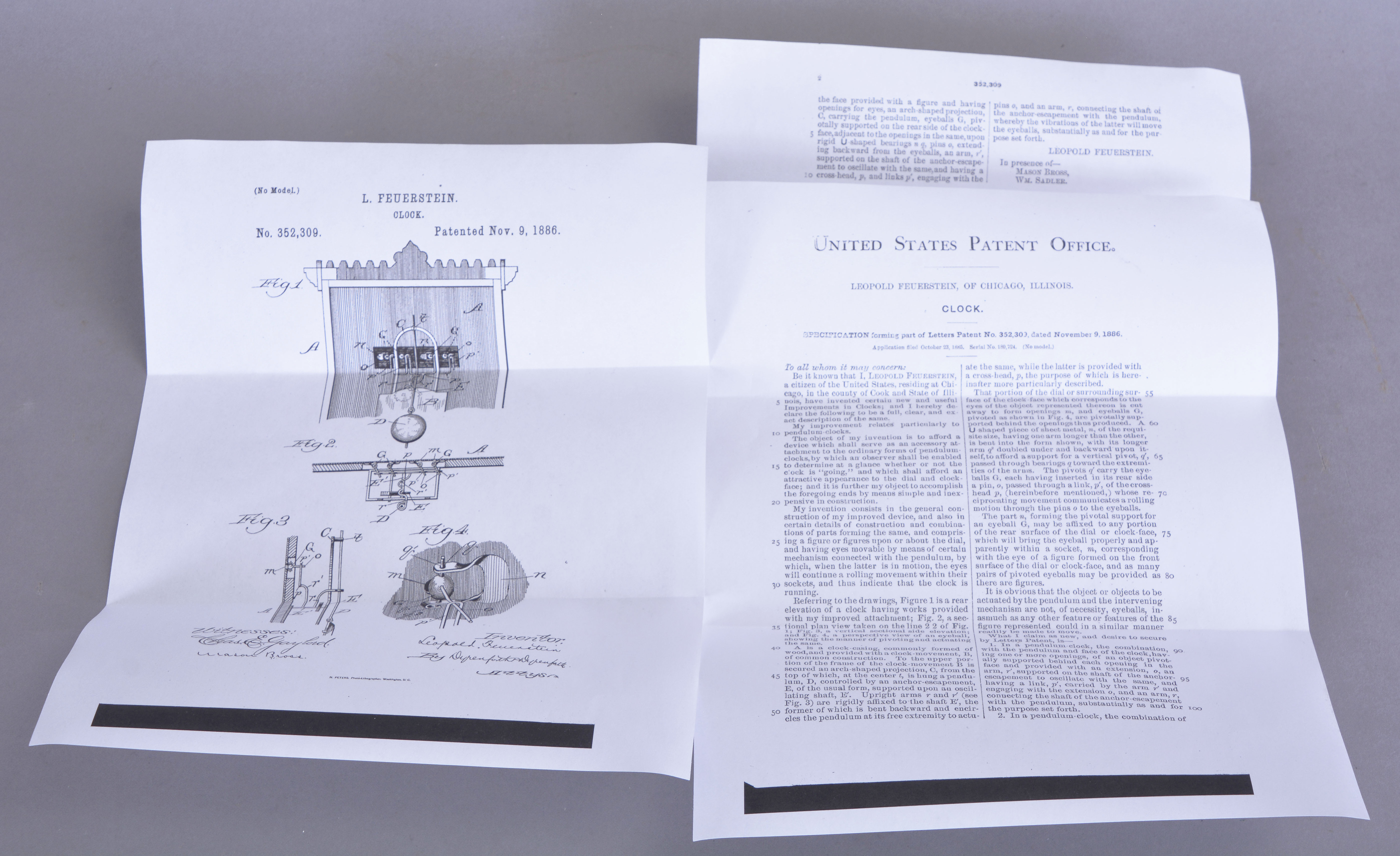case refinished, composition ornaments at top corners with minor losses and one absent, dial with fading and chips, bezel missing, lithograph with cracks and tears where the mechanism for the moving eyes is mounted, switch to silence striking detached but present, movement and gong mounting holes moved, ticks and strikes, would benefit from service. A copy of the patent document is included with the lot. Leopold Feuerstein is listed as a jeweler at 701 Halsted St. in the 1876 edition of "The Lakeside Annual Directory of the City of Chicago". While the idea of a moving eye clock was not original to Feuerstein, his patent states that the "object of my invention is to afford a device which shall serve as an accessory attachment to the ordinary forms of pendulum clocks, by which and observer shall be enabled to determine at a glance whether or not the clock is going..". There is no mention of the strike/silent switch in the patent. The patent document also states that the drawing and specification were not accompanied by a model, and so this may have been Feuerstein's prototype.