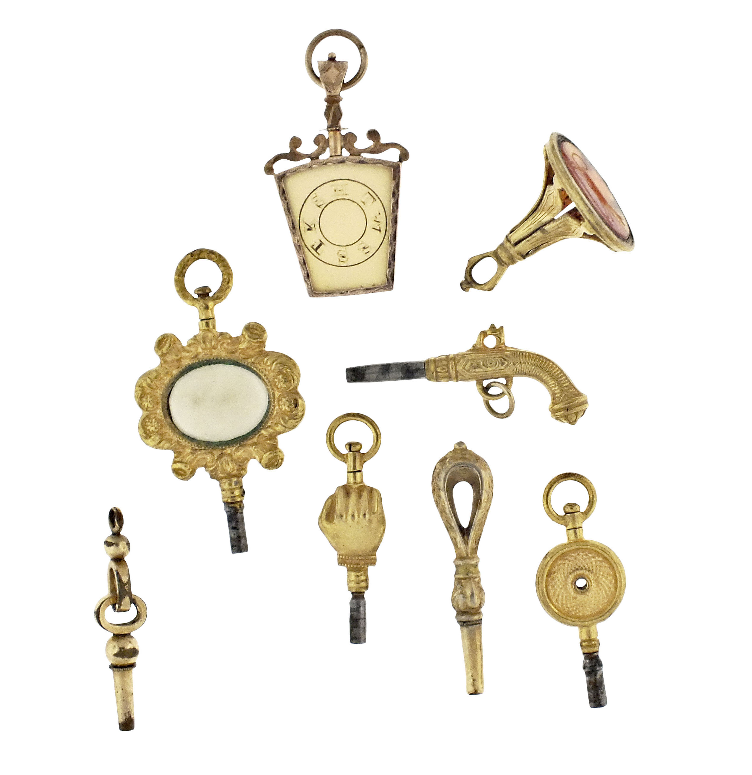 Watch keys- 7 (Seven), 19th century, gold filled, including a pistol form, a fist form, one with faux engine turning, one bell shaped with leaf ornament and carnelian seal, one stone set with floral and foliate ornament, and two others, together with a keystone shaped Knights Templar fob, the engraved 10- 12 karat rose gold frame enclosing an engraved white agate, 5.6g TW