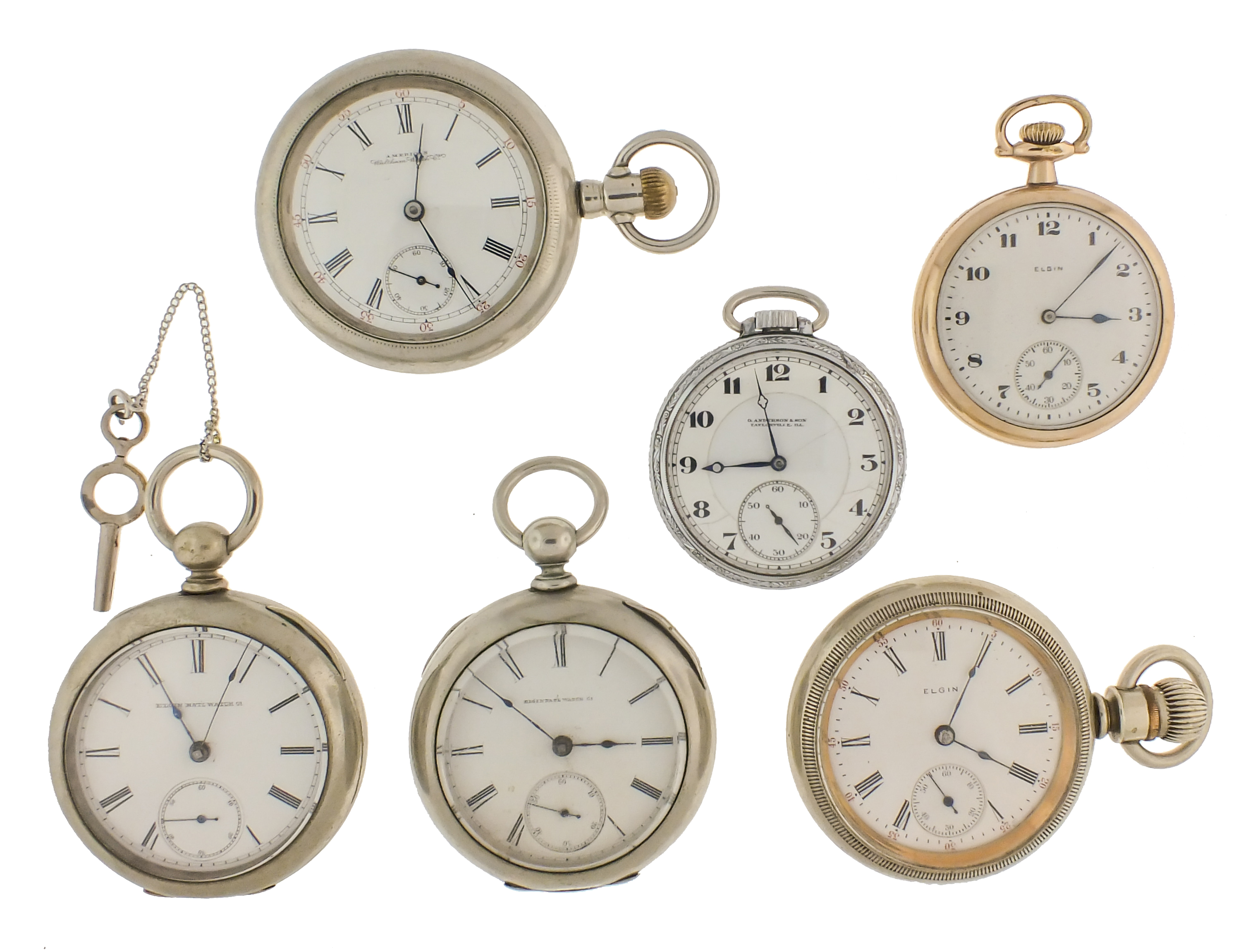Pocket watches- 6 (Six), Waltham, Elgin and Illinois, 16 and 18 size, 7- 17 jewel nickel and gilt movements, white enamel dials, nickel and gold filled open face cases