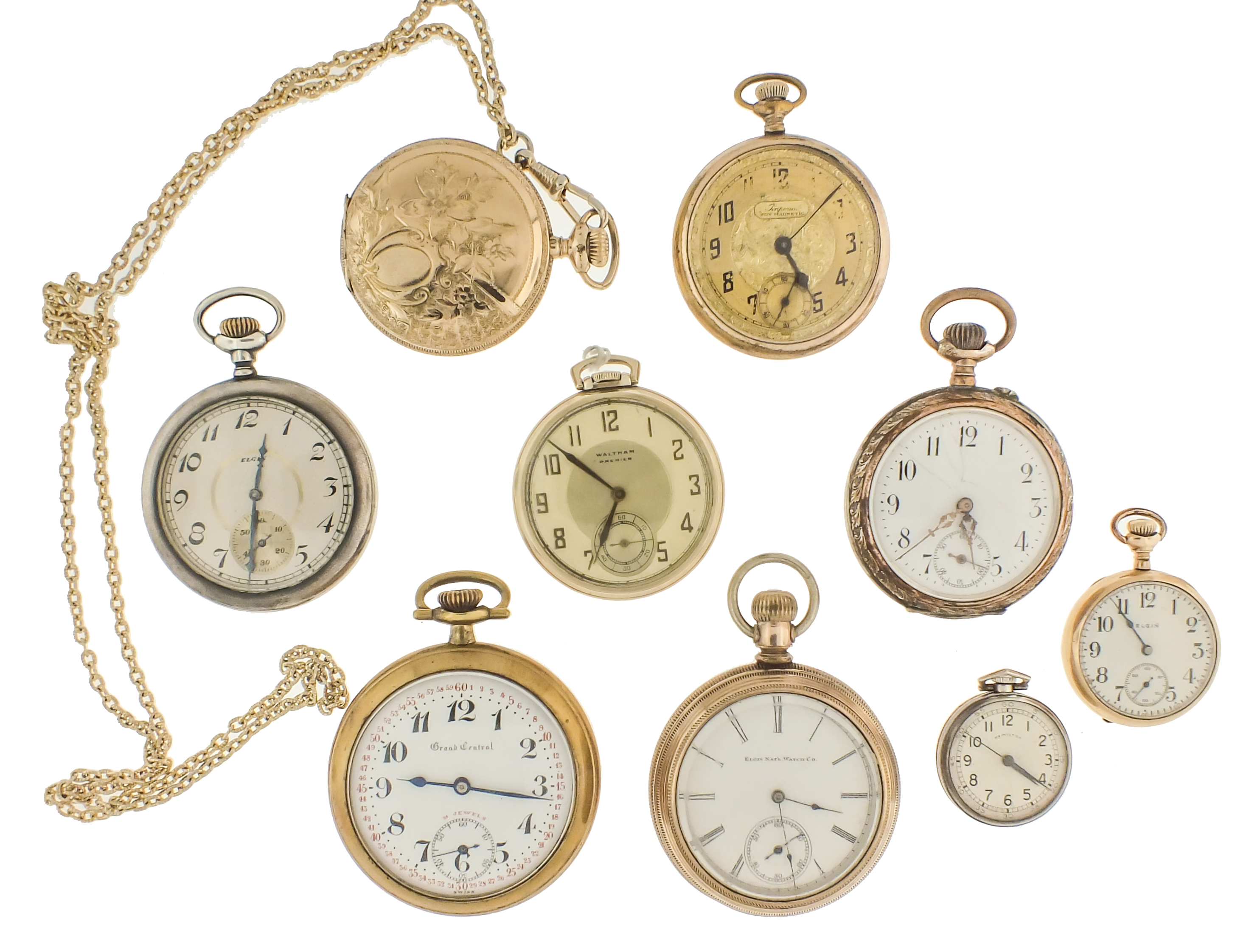 Pocket watches- 9 (Nine), Swiss and American, makers including Elgin, Hamilton, Waltham, Imperial and others, 18- 6/0 size, 6- 18 jewel nickel and gilt movements, metal and enamel dials, silver and gold filled hunting and open face cases