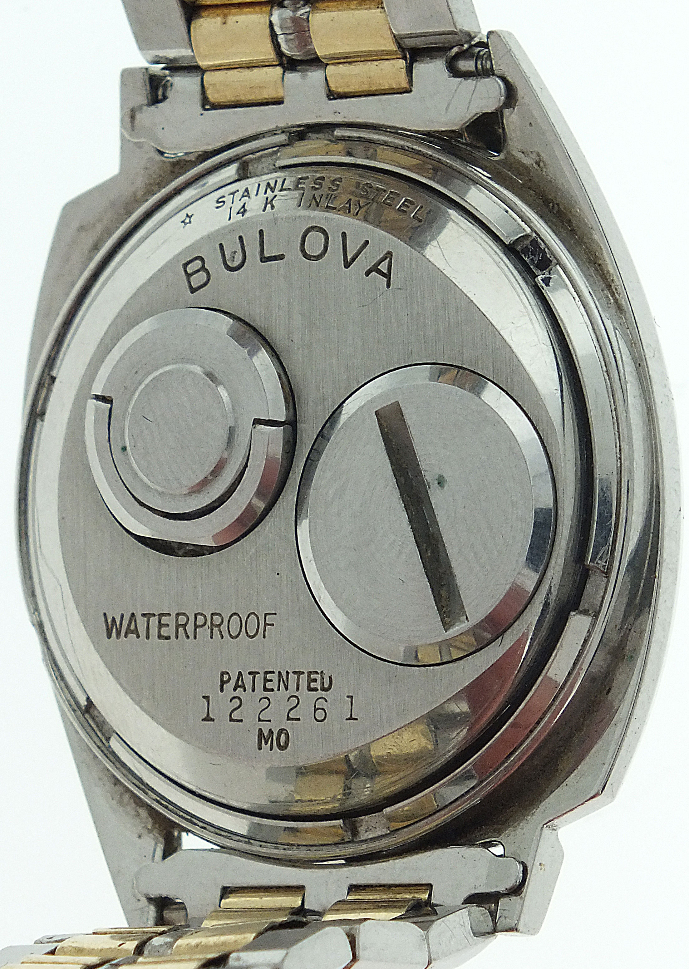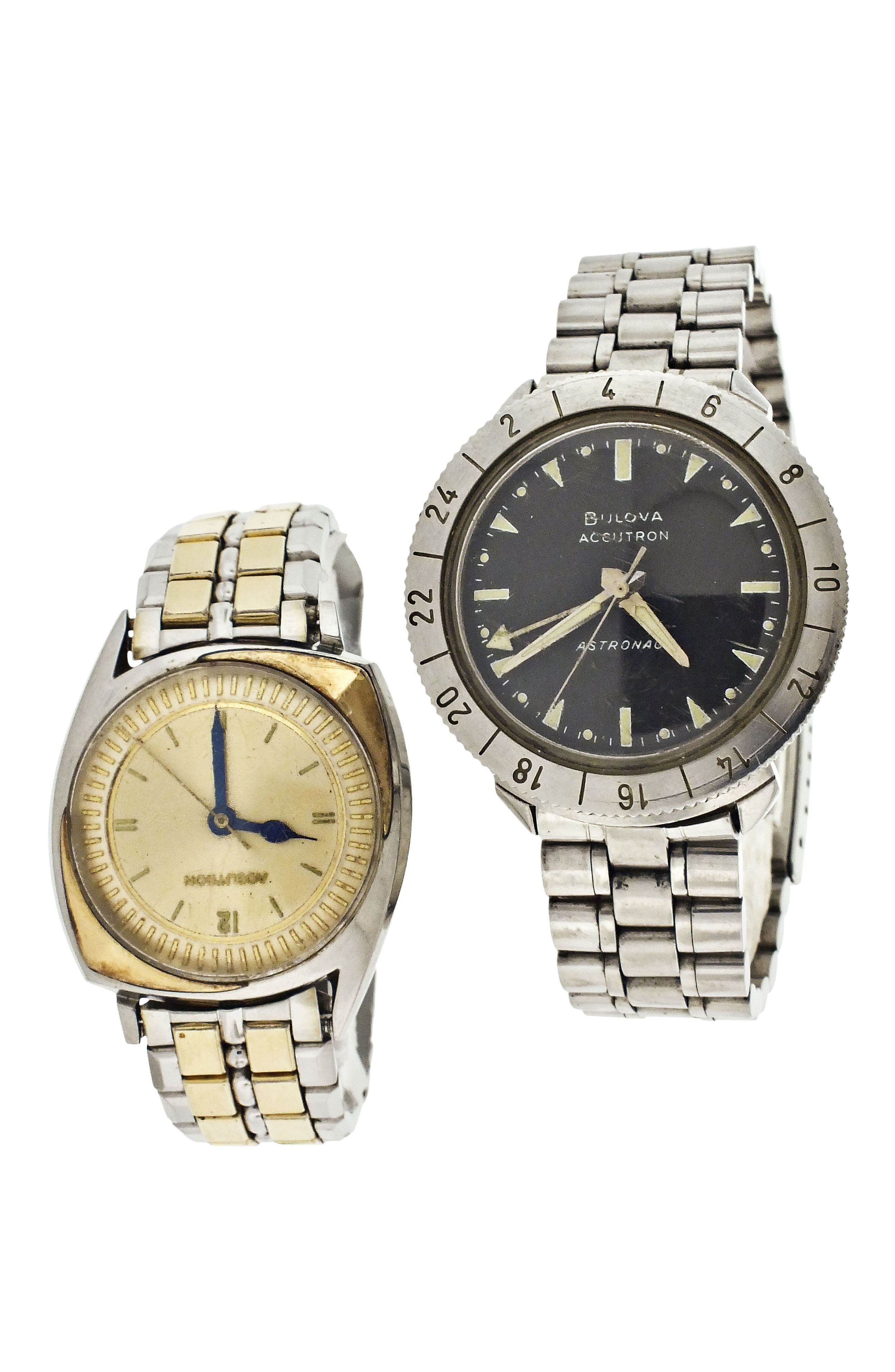 Wrist watches- 2 (Two), both Bulova Accutron, the first a model 203, battery powered cal. 214 movement, gilt baton marker metal dial, stainless steel and 14 karat gold inlay case marked MO, JB Champion two tone stainless steel bracelet with Accutron logo, serial #122061, c1960, the other an "Astronaut", battery powered cal.214 movement, luminous arrow and baton marker black painted dial, stainless steel case with rotating bezel marked M7, and stainless steel JB Champion bracelet with Accutron logo, serial #E78838, c1967, with two Accutron price tags