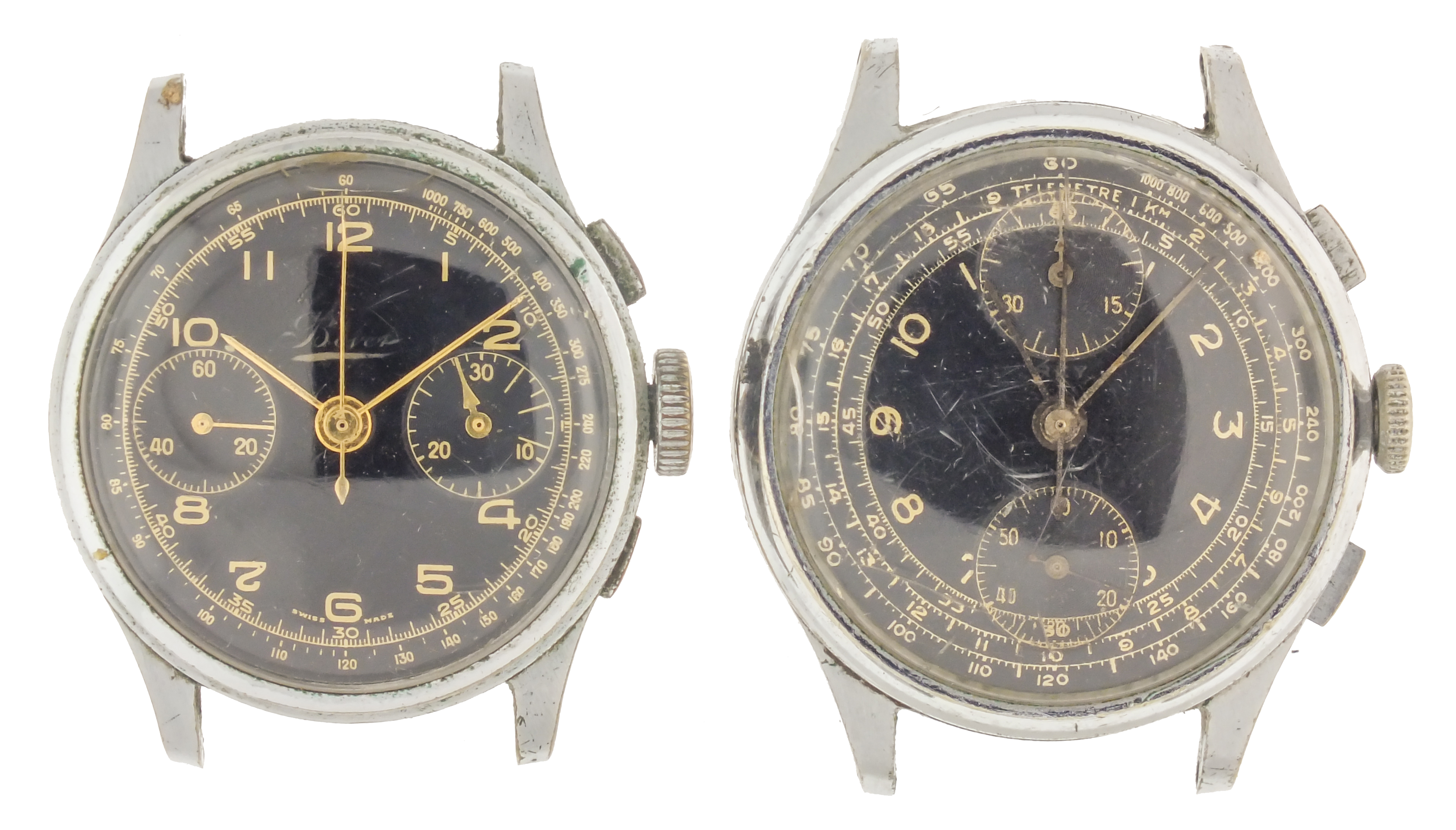 Wrist watches- 2 (Two), the first crudely marked "Majestic Products Co. Swiss" inside the case back and on the movement, 17 jewel Venus cal. 170 movement, arabic numeral black painted dial with 60 minute register at 12:00, and constant seconds at 6:00, stainless steel case with rectangular pushers, 36mm, the other by Bovet Freres, with 17 jewel Landeron movement, arabic numeral black painted dial with 30 minute register at 3:00 and constant seconds at 9:00, and stainless steel case with rectangular pushers, 34mm.