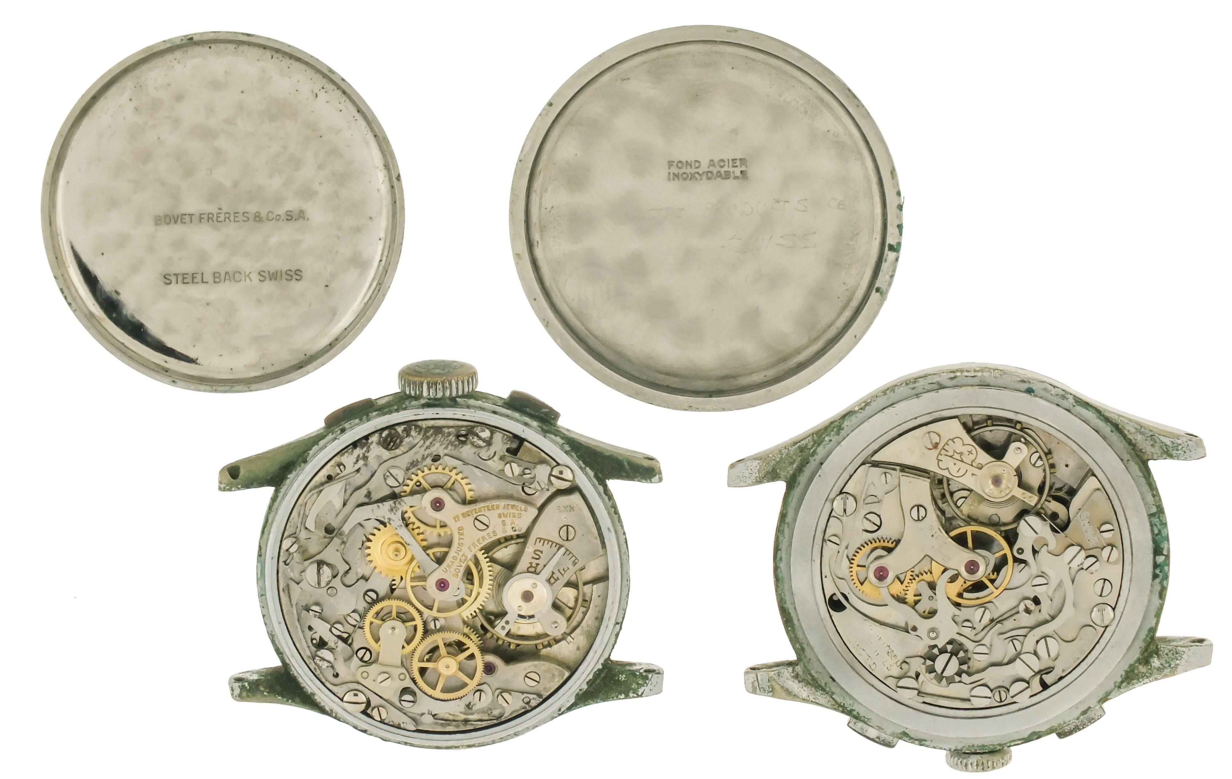 Majestic fully wound, not running, good staff, chronograph mechanism complete and pushers functional, needs service, Bovet fully wound, not running, good staff, some steel components with oxide, chronograph mechanism complete, pushers function and step the levers through start/ stop/ return, needs service, multiple lots sold as is, no returns