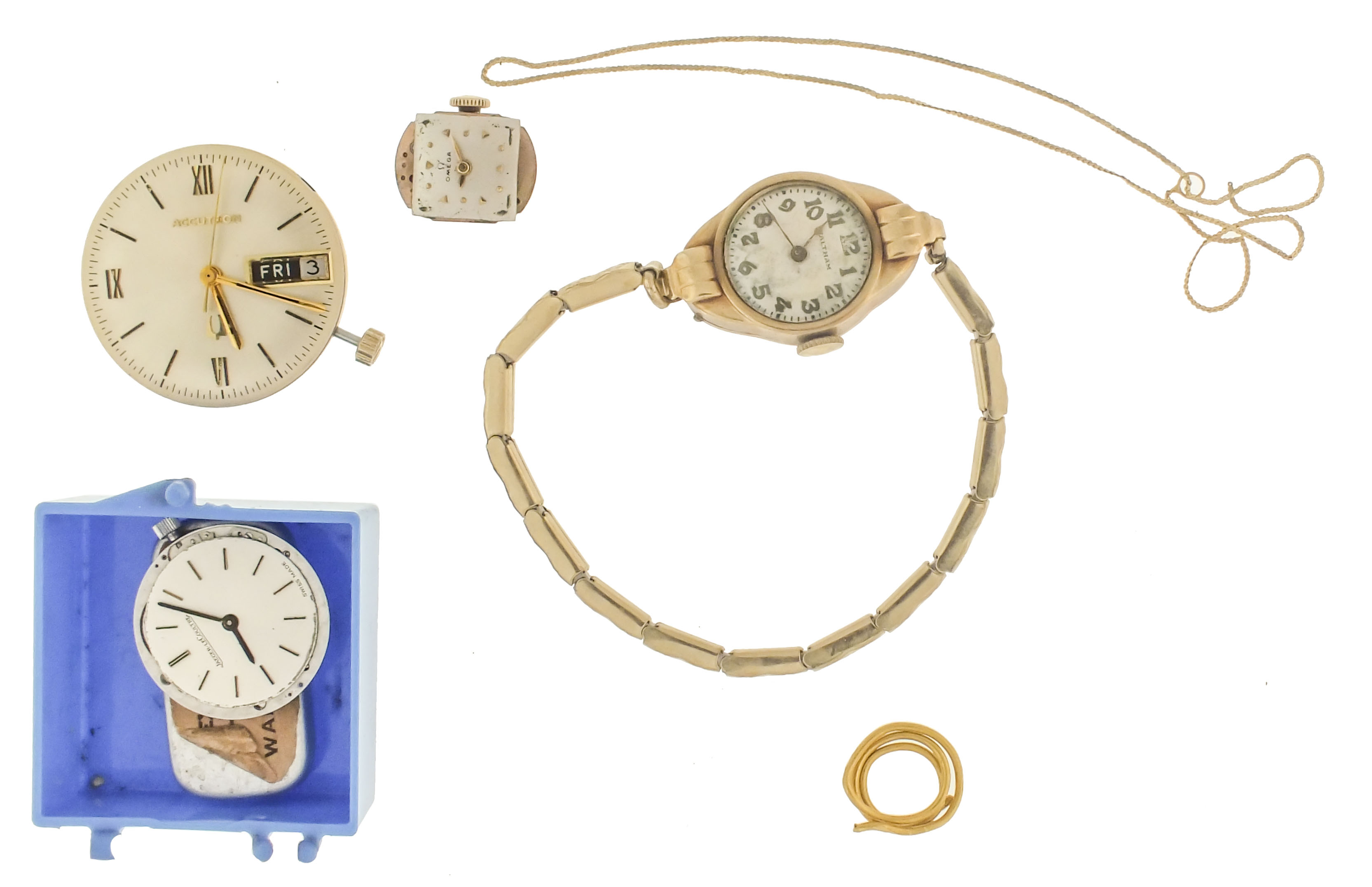Four wrist watch movements, the first a Patek Philippe 3 x 9 ligne baguette, 18 jewel cotes de Geneve decorated nickel movement, arabic numeral and baton marker silvered dial, serial number removed, the next a Jaeger LeCoultre P838 ultra thin, 18 jewel cotes de Geneve decorated nickel movement, baton marker metal dial, serial #2021513, an Accutron cal. 2182, battery powered gilt movement with calendar function, roman numeral and baton marker metal dial, and an Omega cal. 211, 17 jewel gilt movement, dot and pyramid marker metal dial, serial #12497290, together with a small piece of 22 karat+ gold wire, a piece of a 14 karat gold necklace, and a lady's Waltham wrist watch with 14 karat gold case, 22k, 1.6g TW, 14k, 16g TW