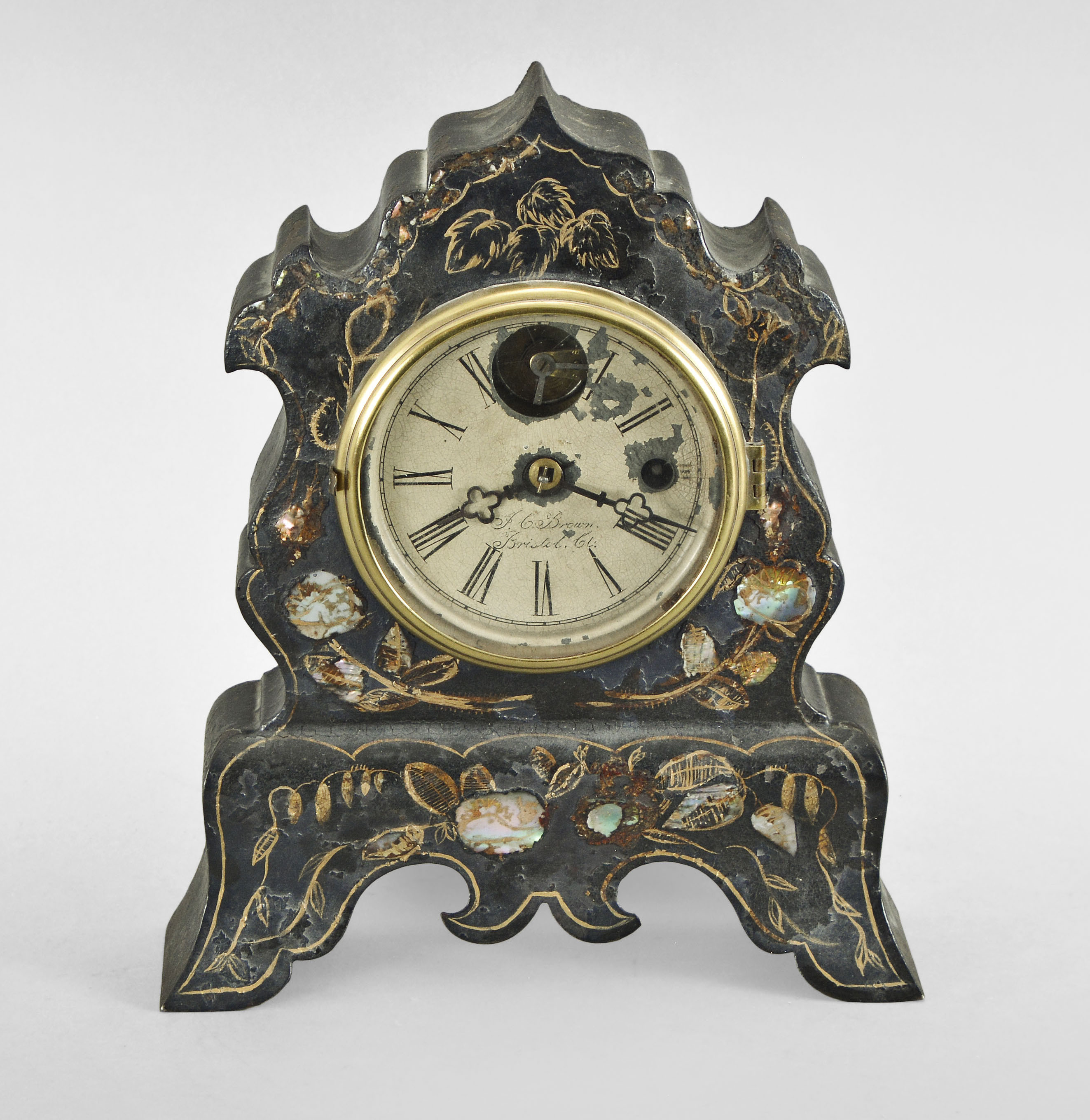 J.C. Brown, Forestville Mfg. Co., Bristol, Conn., with 30 hour, spring driven brass lever timepiece movement made by Noah Pomeroy in a decorated MOP cast iron case.