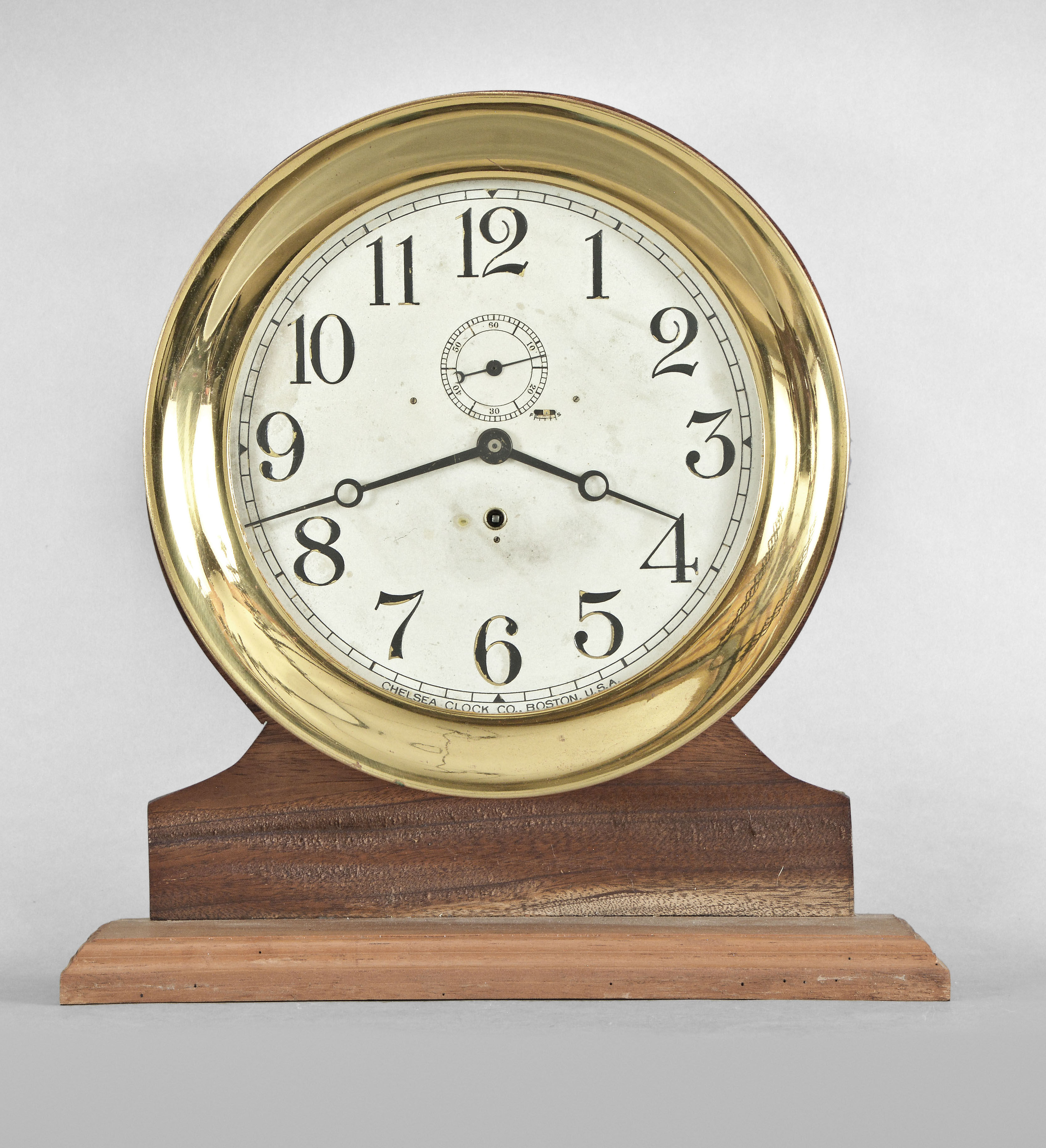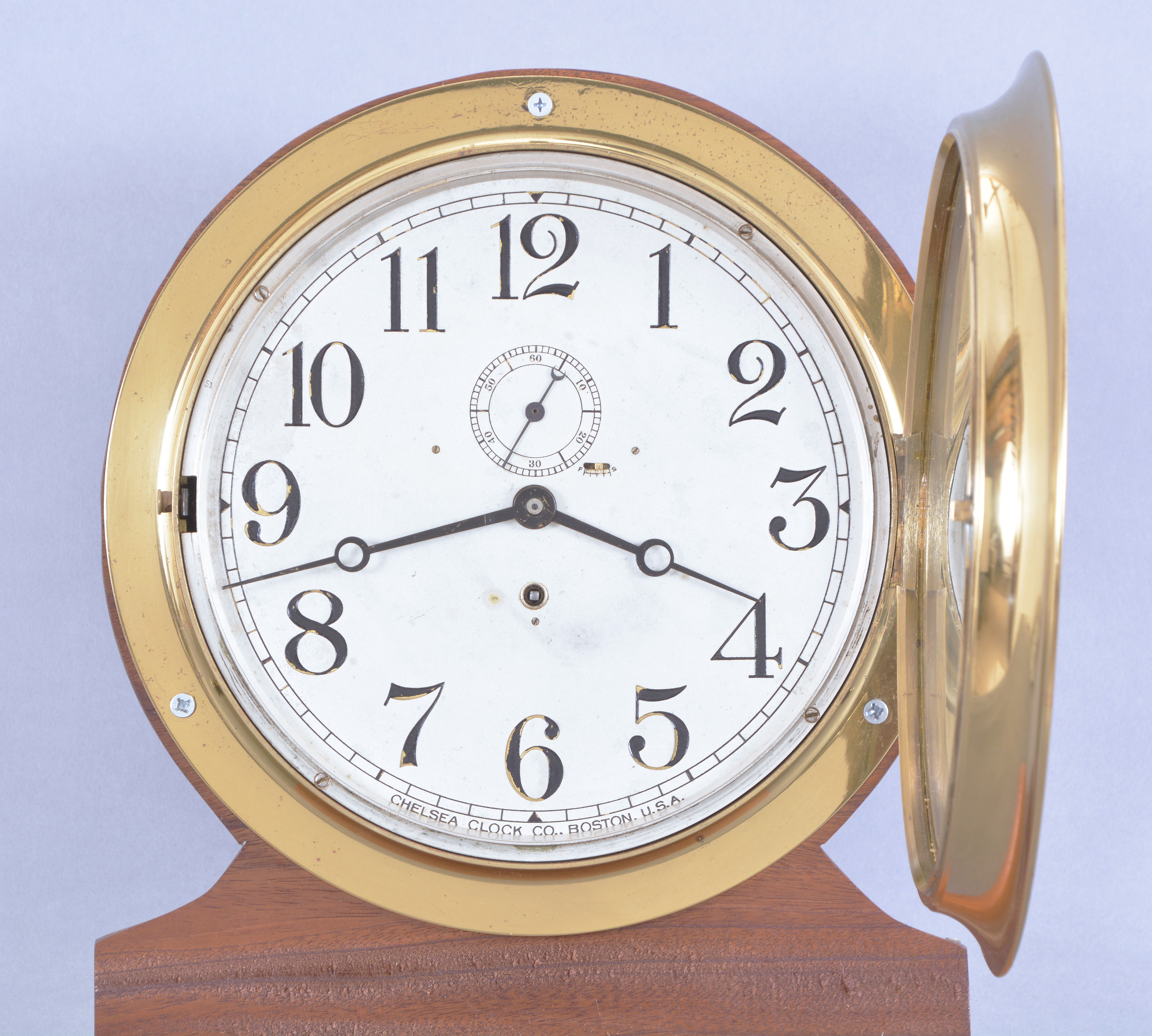 Chelsea Clock Co., Boston, Mass., "Marine" hanging clock, 8 day, time only, spring driven lever movement polished brass case mahogany case, 9.5" silvered brass dial, serial #123176