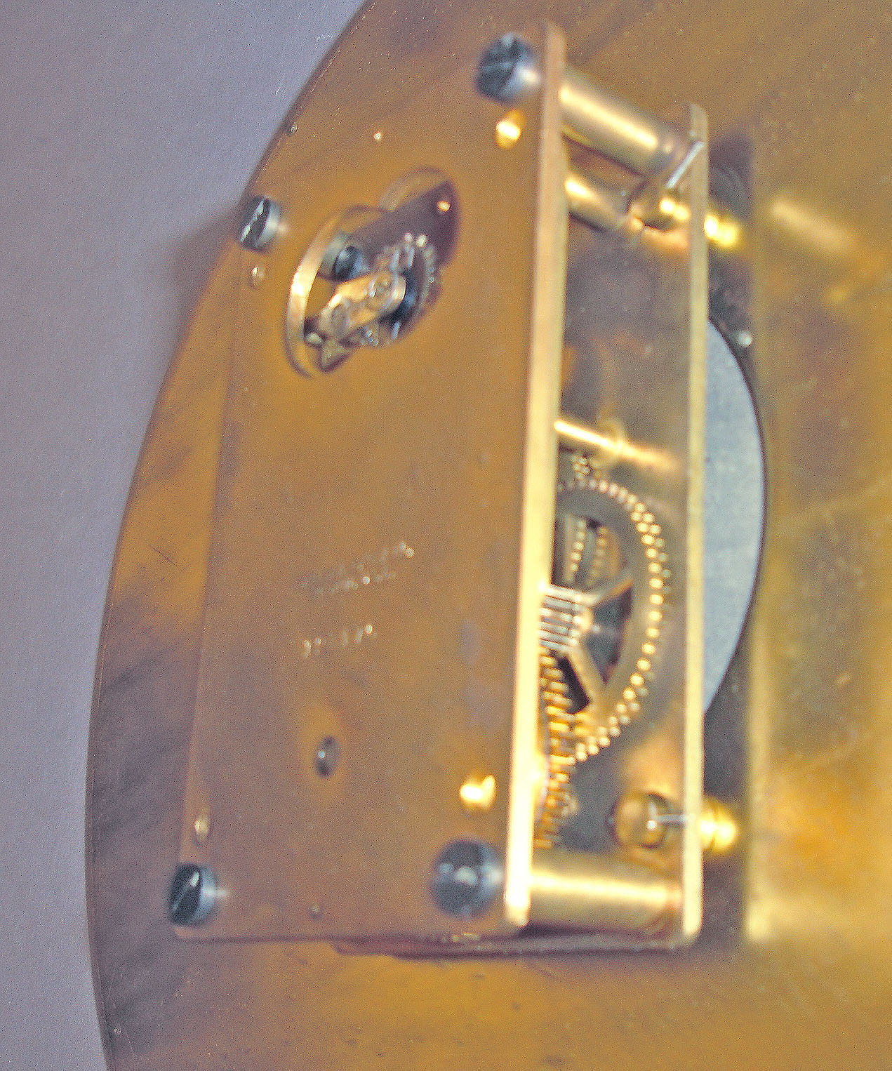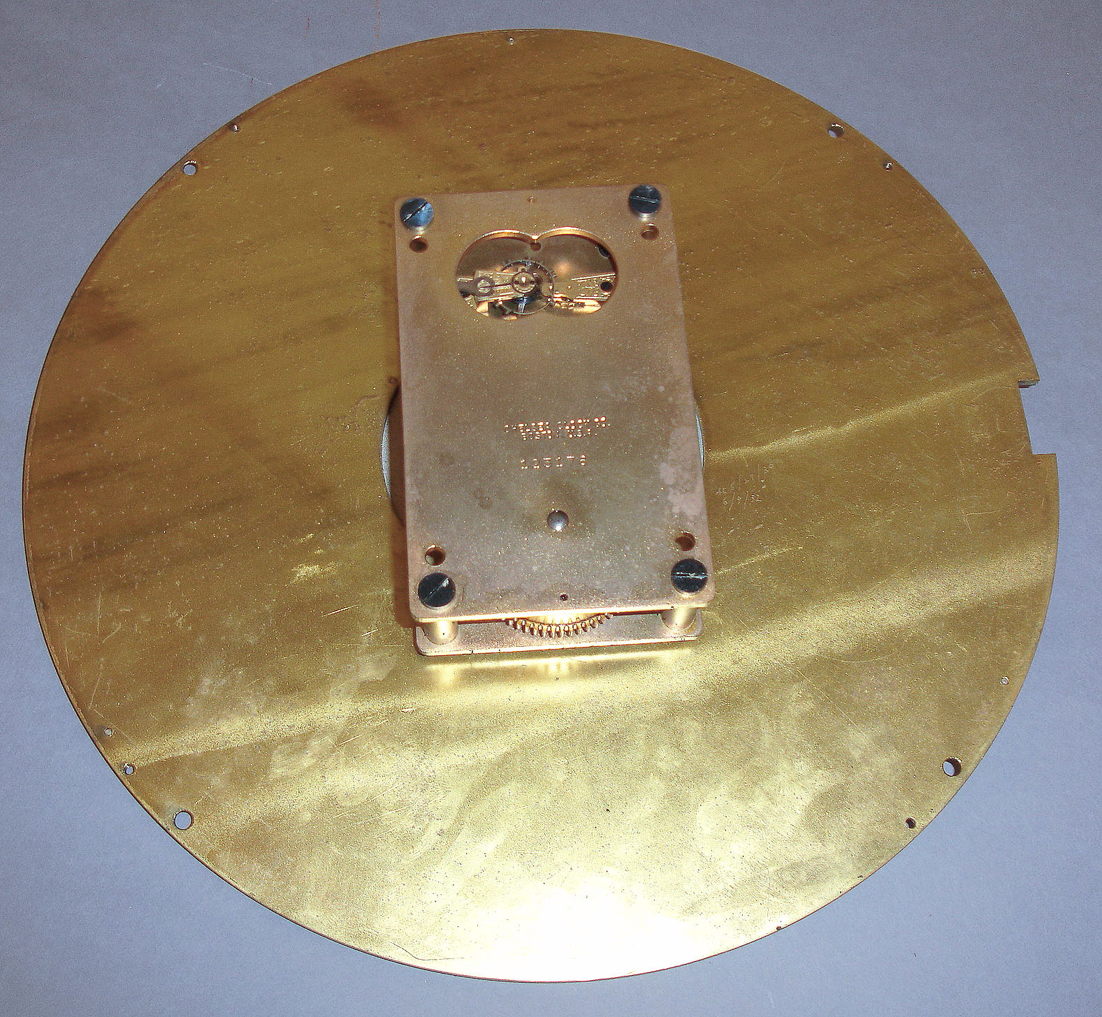 Movement is clean and running, polished brass case is in good overall condition with minor marks and spots. Dial has marks and dull areas with some paint loss to the numerals. Mahogany stand is homemade for display purposes.