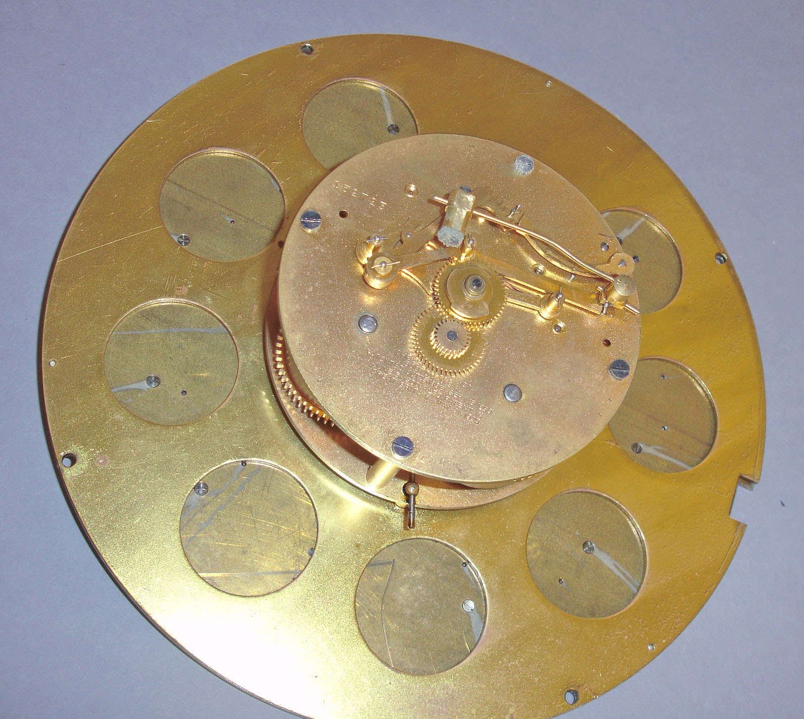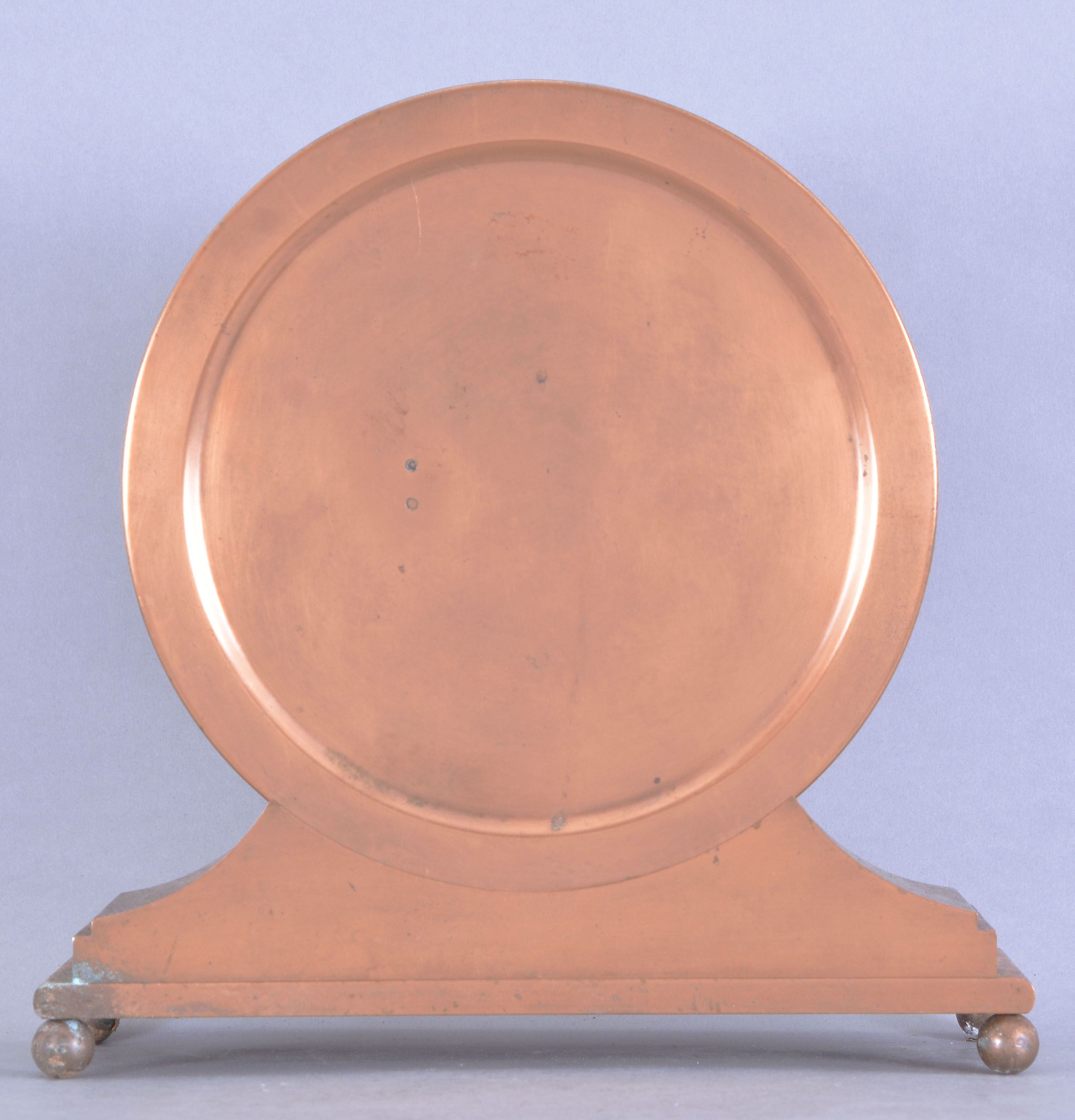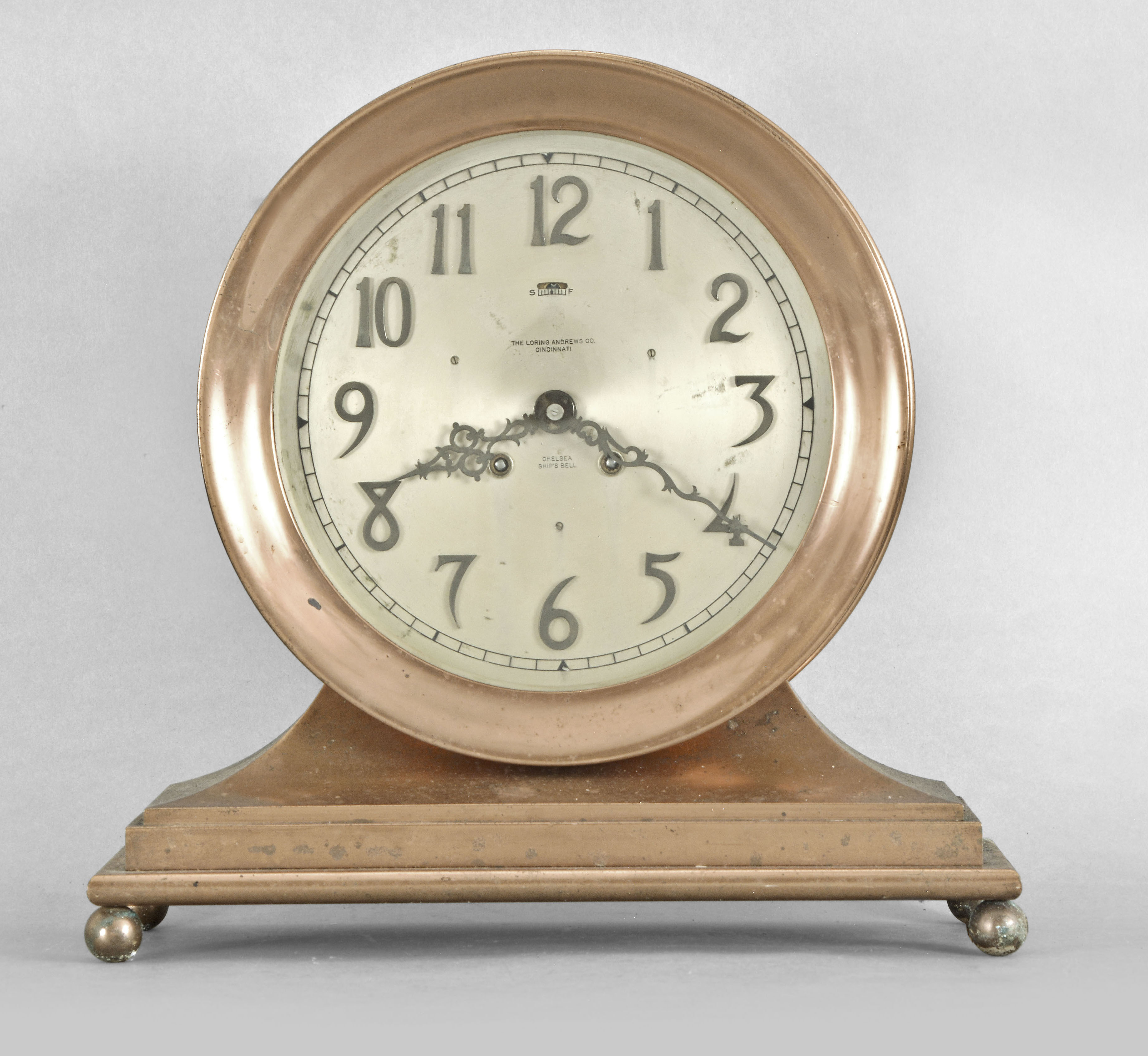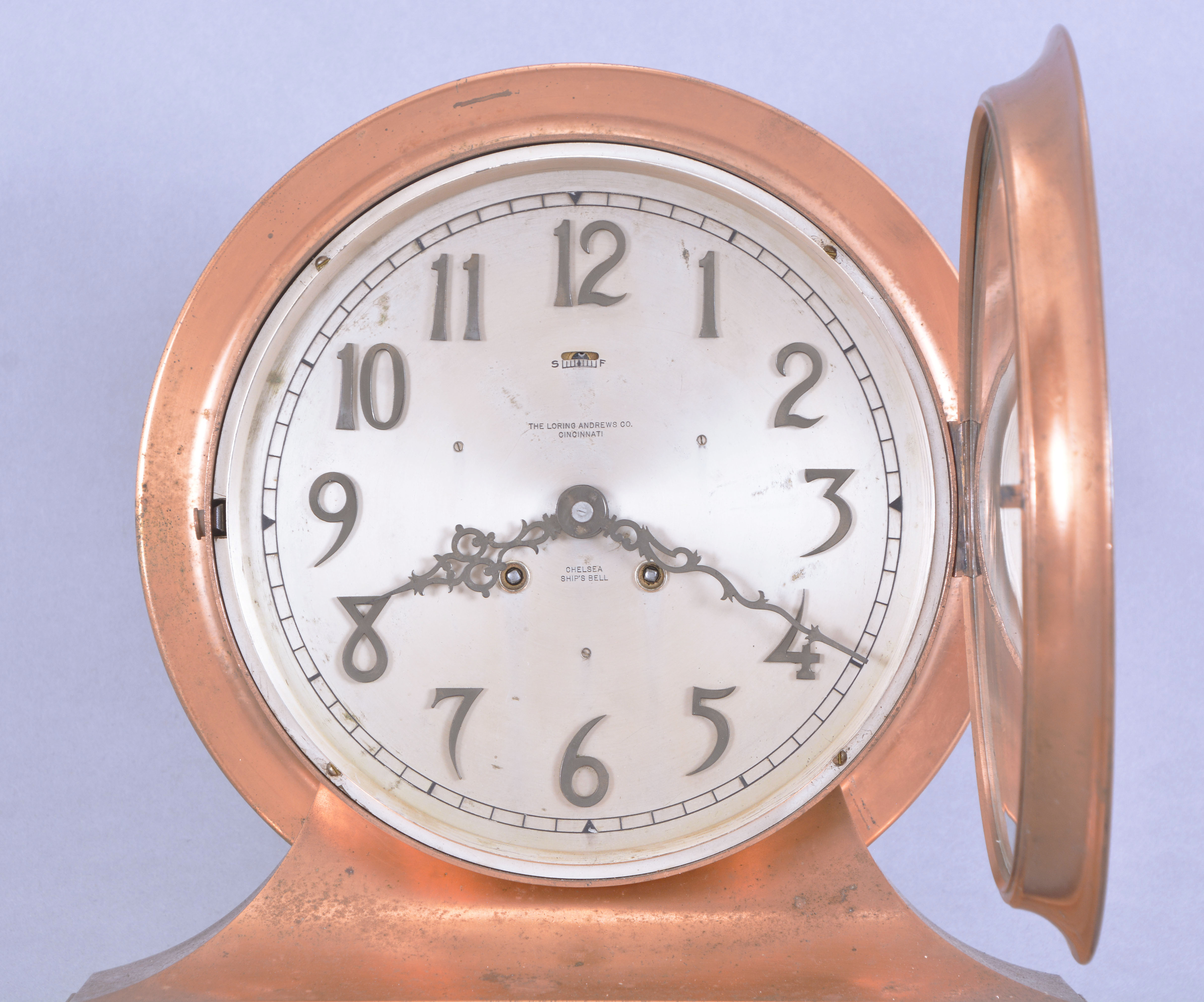Chelsea Clock Co., Boston, Mass., "Base and ball" mantel clock, 8 day, time and ship's bell strike spring driven lever movement in a copper case with 8.5" special silvered metal dial with applied numerals, serial #132723 made for The Loring Andrews Co., Cincinnati